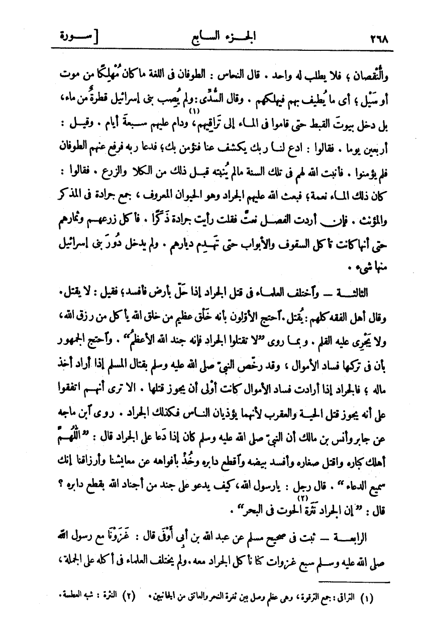 وَالنُّقْصَانِ، فَلَا يُطْلَبُ لَهُ وَاحِدٌ. قَالَ النَّحَّاسُ: الطُّوفَانُ فِي اللُّغَةِ مَا كَانَ مُهْلِكًا مِنْ مَوْتٍ أَوْ سَيْلٍ، أَيْ مَا يُطِيفُ بِهِمْ فَيُهْلِكُهُمْ. وَقَالَ السُّدِّيُّ: وَلَمْ يُصِبْ بَنِي إِسْرَائِيلَ قَطْرَةٌ مِنْ مَاءٍ، بَلْ دَخَلَ بُيُوتَ الْقِبْطِ حَتَّى قَامُوا فِي الْمَاءِ إِلَى تَرَاقِيهِمْ «١»، وَدَامَ عَلَيْهِمْ سَبْعَةَ أَيَّامٍ. وَقِيلَ: أَرْبَعِينَ يَوْمًا. فَقَالُوا: ادْعُ لَنَا رَبَّكَ يَكْشِفُ عَنَّا فَنُؤْمِنُ بِكَ، فَدَعَا رَبَّهُ فَرَفَعَ عَنْهُمُ الطُّوفَانَ فَلَمْ يُؤْمِنُوا. فَأَنْبَتَ اللَّهُ لَهُمْ فِي تِلْكَ السَّنَةِ مَا لَمْ يُنْبِتْهُ قَبْلَ ذَلِكَ مِنَ الْكَلَأِ وَالزَّرْعِ. فَقَالُوا: كَانَ ذَلِكَ الْمَاءُ نِعْمَةً، فَبَعَثَ اللَّهُ عليها الْجَرَادَ وَهُوَ الْحَيَوَانُ الْمَعْرُوفُ، جَمْعُ جَرَادَةٍ فِي الْمُذَكَّرِ وَالْمُؤَنَّثِ. فَإِنْ أَرَدْتَ الْفَصْلَ نَعَتَّ فَقُلْتَ رَأَيْتُ جَرَادَةً ذَكَرًا- فَأَكَلَ زُرُوعَهُمْ وَثِمَارَهُمْ حَتَّى إِنَّهَا كَانَتْ تَأْكُلُ السُّقُوفَ وَالْأَبْوَابَ حَتَّى تَنْهَدِمَ دِيَارُهُمْ. وَلَمْ يَدْخُلْ دُورَ بَنِي إِسْرَائِيلَ مِنْهَا شي. الثَّالِثَةُ- وَاخْتَلَفَ الْعُلَمَاءُ فِي قَتْلِ الْجَرَادِ إِذَا حَلَّ بِأَرْضٍ فَأَفْسَدَ، فَقِيلَ: لَا يُقْتَلُ. وَقَالَ أَهْلُ الْفِقْهِ كُلُّهُمْ: يُقْتَلُ. احْتَجَّ الْأَوَّلُونَ بِأَنَّهُ خَلْقٌ عَظِيمٌ مِنْ خَلْقِ اللَّهِ يَأْكُلُ مِنْ رِزْقِ اللَّهِ وَلَا يَجْرِي عَلَيْهِ الْقَلَمُ. وَبِمَا رُوِيَ (لَا تَقْتُلُوا الْجَرَادَ فَإِنَّهُ جُنْدُ اللَّهِ الْأَعْظَمُ). وَاحْتَجَّ الْجُمْهُورُ بِأَنَّ فِي تَرْكِهَا فَسَادَ الْأَمْوَالِ، وَقَدْ رَخَّصَ النَّبِيُّ صَلَّى اللَّهُ عَلَيْهِ وَسَلَّمَ بقتال المسلم إذا أراد أخذ مال، فَالْجَرَادُ إِذَا أَرَادَتْ فَسَادَ الْأَمْوَالِ كَانَتْ أَوْلَى أَنْ يَجُوزَ قَتْلُهَا. أَلَا تَرَى أَنَّهُمْ قَدِ اتَّفَقُوا عَلَى أَنَّهُ يَجُوزُ قَتْلُ الْحَيَّةِ وَالْعَقْرَبِ؟ لِأَنَّهُمَا يُؤْذِيَانِ النَّاسَ فَكَذَلِكَ الْجَرَادُ. رَوَى ابْنُ مَاجَهْ عَنْ جَابِرٍ وَأَنَسِ بْنِ مَالِكٍ أَنَّ النَّبِيَّ صَلَّى اللَّهُ عَلَيْهِ وَسَلَّمَ كَانَ إِذَا دَعَا عَلَى الْجَرَادِ قَالَ: (اللَّهُمَّ أَهْلِكْ كِبَارَهُ وَاقْتُلْ صِغَارَهُ وَأَفْسِدْ بَيْضَهُ وَاقْطَعْ دَابِرَهُ وَخُذْ بِأَفْوَاهِهِ عَنْ مَعَايِشِنَا وَأَرْزَاقِنَا إِنَّكَ سَمِيعُ الدُّعَاءِ (. قَالَ رَجُلٌ: يَا رَسُولَ اللَّهِ، كَيْفَ تَدْعُو عَلَى جُنْدٍ مِنْ أَجْنَادِ اللَّهِ بِقَطْعِ دَابِرِهِ؟ قَالَ:) إِنَّ الْجَرَادَ «٢» نَثْرَةُ الْحُوتِ فِي الْبَحْرِ (. الرَّابِعَةُ: ثَبَتَ فِي صَحِيحِ مُسْلِمٍ عَنْ عَبْدِ اللَّهِ بْنِ أَبِي أَوْفَى قَالَ: غَزَوْنَا مَعَ رَسُولِ اللَّهِ صَلَّى اللَّهُ عَلَيْهِ وَسَلَّمَ سَبْعَ غَزَوَاتٍ كُنَّا نَأْكُلُ الْجَرَادَ مَعَهُ. وَلَمْ يَخْتَلِفِ العلماء في أكله على الجملة،