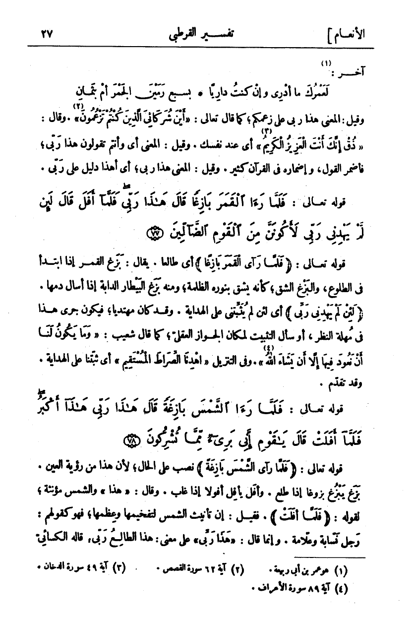 فَلَمَّا رَأَى الْقَمَرَ بازِغاً قالَ هَذَا رَبِّي فَلَمَّا أَفَلَ قالَ لَئِنْ لَمْ يَهْدِنِي رَبِّي لَأَكُونَنَّ مِنَ الْقَوْمِ الضَّالِّينَ (٧٧)