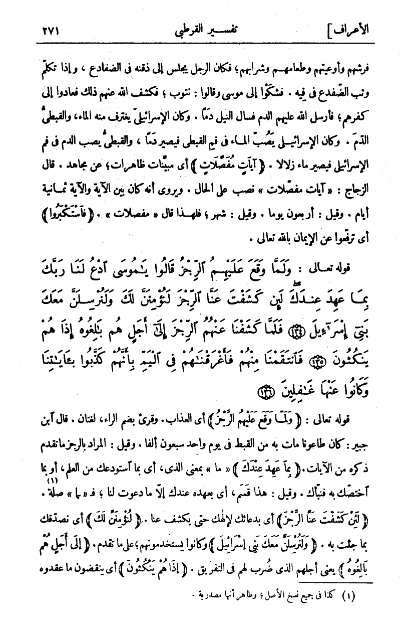 قَوْلُهُ تَعَالَى: (وَلَمَّا وَقَعَ عَلَيْهِمُ الرِّجْزُ) أي العذاب. وقرى بِضَمِّ الرَّاءِ، لُغَتَانِ. قَالَ ابْنُ جُبَيْرٍ: كَانَ طَاعُونًا مَاتَ بِهِ مِنَ الْقِبْطِ فِي يَوْمٍ وَاحِدٍ سَبْعُونَ «٢» أَلْفًا. وَقِيلَ: الْمُرَادُ بِالرِّجْزِ مَا تَقَدَّمَ ذِكْرُهُ مِنَ الْآيَاتِ. (بِما عَهِدَ عِنْدَكَ) " مَا" بِمَعْنَى الَّذِي، أَيْ بِمَا اسْتَوْدَعَكَ مِنَ الْعِلْمِ، أَوْ بِمَا اخْتَصَّكَ بِهِ فَنَبَّأَكَ. وَقِيلَ: هَذَا قَسَمٌ، أَيْ بِعَهْدِهِ عِنْدَكَ إِلَّا مَا دَعَوْتَ لَنَا، فَ" مَا" صِلَةٌ «٣». (لَئِنْ كَشَفْتَ عَنَّا الرِّجْزَ) أَيْ بِدُعَائِكَ لِإِلَهِكَ حَتَّى يَكْشِفَ عَنَّا. (لَنُؤْمِنَنَّ لَكَ) أَيْ نُصَدِّقُكَ بِمَا جِئْتَ بِهِ. (وَلَنُرْسِلَنَّ مَعَكَ بَنِي إِسْرائِيلَ) وَكَانُوا يَسْتَخْدِمُونَهُمْ، عَلَى مَا تَقَدَّمَ (إِلى أَجَلٍ هُمْ بالِغُوهُ) يَعْنِي أَجَلَهُمُ الَّذِي ضُرِبَ لَهُمْ فِي التَّغْرِيقِ. (إِذا هُمْ يَنْكُثُونَ) أَيْ يَنْقُضُونَ مَا عَقَدُوهُ