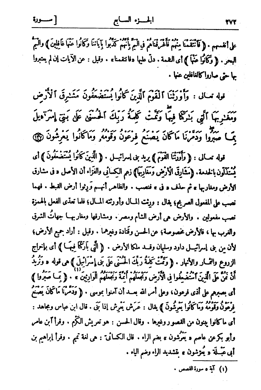 قَوْلُهُ تَعَالَى: (وَأَوْرَثْنَا الْقَوْمَ) يُرِيدُ بَنِي إِسْرَائِيلَ. (الَّذِينَ كانُوا يُسْتَضْعَفُونَ) أَيْ يُسْتَذَلُّونَ بِالْخِدْمَةِ. (مَشارِقَ الْأَرْضِ وَمَغارِبَهَا) زَعَمَ الْكِسَائِيُّ وَالْفَرَّاءُ أَنَّ الْأَصْلَ" فِي مَشَارِقِ الْأَرْضِ وَمَغَارِبهَا" ثُمَّ حُذِفَ" فِي" فَنُصِبَ. وَالظَّاهِرُ أَنَّهُمْ وَرِثُوا أَرْضَ الْقِبْطِ. فَهُمَا نَصْبٌ عَلَى الْمَفْعُولِ الصَّرِيحِ، يُقَالُ: وَرِثْتُ الْمَالَ وَأَوْرَثْتُهُ الْمَالَ، فَلَمَّا تَعَدَّى الْفِعْلُ بِالْهَمْزَةِ نَصَبَ مَفْعُولَيْنِ. وَالْأَرْضُ هِيَ أَرْضُ الشَّأْمِ وَمِصْرَ. وَمَشَارِقُهَا وَمَغَارِبُهَا جِهَاتُ الشَّرْقِ وَالْغَرْبِ بِهَا، فَالْأَرْضُ مَخْصُوصَةٌ، عَنِ الْحَسَنِ وَقَتَادَةَ وَغَيْرِهِمَا. وَقِيلَ: أراد جميع الأرض، لأن بن بَنِي إِسْرَائِيلَ دَاوُدَ وَسُلَيْمَانَ وَقَدْ مَلَكَا الْأَرْضَ. (الَّتِي بارَكْنا فِيها) أَيْ بِإِخْرَاجِ الزُّرُوعِ وَالثِّمَارِ والأنهار. (وَتَمَّتْ كَلِمَتُ رَبِّكَ الْحُسْنى عَلى بَنِي إِسْرائِيلَ هِيَ قَوْلُهُ:" وَنُرِيدُ أَنْ نَمُنَّ عَلَى الَّذِينَ اسْتُضْعِفُوا فِي الْأَرْضِ وَنَجْعَلَهُمْ أَئِمَّةً وَنَجْعَلَهُمُ الْوارِثِينَ «١» ". (بِما صَبَرُوا) أَيْ بِصَبْرِهِمْ عَلَى أَذَى فِرْعَوْنَ، وَعَلَى أَمْرِ اللَّهِ بَعْدَ أَنْ آمَنُوا بِمُوسَى. (وَدَمَّرْنا مَا كانَ يَصْنَعُ فِرْعَوْنُ وَقَوْمُهُ وَما كانُوا يَعْرِشُونَ) يُقَالُ: عَرَشَ يَعْرِشُ إِذَا بَنَى. قَالَ ابْنُ عَبَّاسٍ وَمُجَاهِدٌ: أَيْ مَا كَانُوا يَبْنُونَ مِنَ الْقُصُورِ وَغَيْرِهَا. وَقَالَ الْحَسَنُ: هُوَ تَعْرِيشُ الْكَرْمِ. وَقَرَأَ ابْنُ عَامِرٍ وَأَبُو بَكْرٍ عَنْ عَاصِمٍ" يَعْرُشُونَ" بِضَمِّ الرَّاءِ. قَالَ الْكِسَائِيُّ: هِيَ لُغَةُ تَمِيمٍ. وَقَرَأَ إِبْرَاهِيمُ بْنُ أَبِي عَبْلَةَ" يُعَرِّشُونَ" بتشديد الراء وضم الياء.