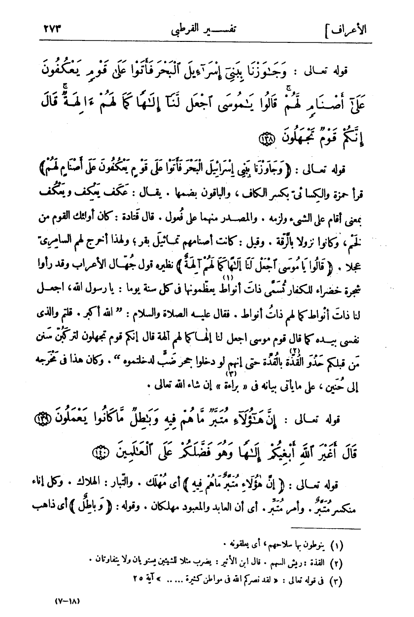قَوْلُهُ تَعَالَى: (وَجاوَزْنا بِبَنِي إِسْرائِيلَ الْبَحْرَ فَأَتَوْا عَلى قَوْمٍ يَعْكُفُونَ عَلى أَصْنامٍ لَهُمْ) قَرَأَ حَمْزَةُ وَالْكِسَائِيُّ بِكَسْرِ الْكَافِ، وَالْبَاقُونَ بِضَمِّهَا. يُقَالُ: عَكَفَ يَعْكِفُ وَيَعْكُفُ بِمَعْنَى أَقَامَ عَلَى الشَّيْءِ وَلَزِمَهُ. وَالْمَصْدَرُ مِنْهُمَا عَلَى فُعُولٍ. قَالَ قَتَادَةُ: كَانَ أُولَئِكَ الْقَوْمُ مِنْ لَخْمٍ، وَكَانُوا نُزُولًا بِالرِّقَّةِ وَقِيلَ: كَانَتْ أَصْنَامُهُمْ تَمَاثِيلَ بَقَرٍ، وَلِهَذَا أَخْرَجَ لَهُمْ السَّامِرِيُّ عِجْلًا. (قَالُوا يَا مُوسَى اجْعَلْ لَنَا إِلَهًا كَمَا لَهُمْ آلِهَةٌ) نَظِيرُهُ قَوْلُ جُهَّالِ الْأَعْرَابِ وَقَدْ رَأَوْا شَجَرَةً خَضْرَاءَ لِلْكُفَّارِ تُسَمَّى ذَاتَ أَنْوَاطٍ «١» يُعَظِّمُونَهَا فِي كُلِّ سَنَةٍ يَوْمًا: يَا رَسُولَ اللَّهِ، اجْعَلْ لَنَا ذَاتَ أَنْوَاطٍ كَمَا لَهُمْ ذَاتُ أَنْوَاطٍ. فَقَالَ عَلَيْهِ الصَّلَاةُ وَالسَّلَامُ: (اللَّهُ أَكْبَرُ. قُلْتُمْ وَالَّذِي نَفْسِي بِيَدِهِ كَمَا قَالَ قوم مُوسَى" اجْعَلْ لَنا إِلهاً كَما لَهُمْ آلِهَةٌ قالَ إِنَّكُمْ قَوْمٌ تَجْهَلُونَ" لَتَرْكَبُنَّ سُنَنَ في قبلكم حذو القذة «٢» بالقذة حتى إنهم لو دخلوا حجر ضَبٍّ لَدَخَلْتُمُوهُ (. وَكَانَ هَذَا فِي مَخْرَجِهِ إِلَى حُنَيْنٍ، عَلَى مَا يَأْتِي بَيَانُهُ فِي" بَرَاءَةٌ «٣» " إِنْ شَاءَ الله تعالى.