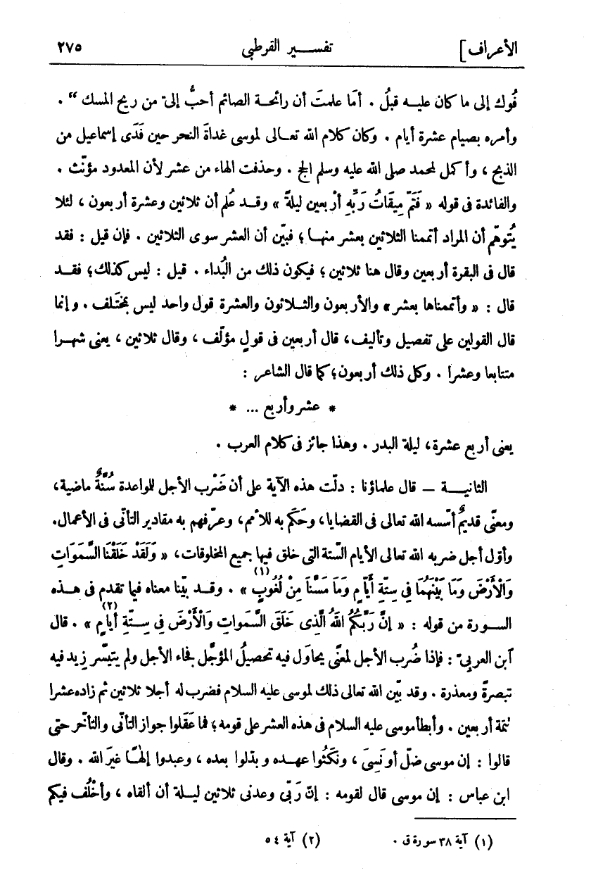 يَعْنِي أَرْبَعَ عَشْرَةَ، لَيْلَةَ الْبَدْرِ. وَهَذَا جَائِزٌ فِي كَلَامِ الْعَرَبِ. الثَّانِيَةُ- قَالَ عُلَمَاؤُنَا: دَلَّتْ هَذِهِ الْآيَةُ عَلَى أَنَّ ضَرْبَ الْأَجَلِ لِلْمُوَاعَدَةِ سُنَّةٌ مَاضِيَةٌ، وَمَعْنًى قديم أَسَّسَهُ اللَّهُ تَعَالَى فِي الْقَضَايَا، وَحَكَمَ بِهِ لِلْأُمَمِ، وَعَرَّفَهُمْ بِهِ مَقَادِيرَ التَّأَنِّي فِي الْأَعْمَالِ. وَأَوَّلُ أَجَلٍ ضَرَبَهُ اللَّهُ تَعَالَى الْأَيَّامُ السِّتَّةُ الَّتِي خَلَقَ فِيهَا جَمِيعَ الْمَخْلُوقَاتِ،" وَلَقَدْ خَلَقْنَا السَّماواتِ وَالْأَرْضَ وَما بَيْنَهُما فِي سِتَّةِ أَيَّامٍ وَما مَسَّنا مِنْ لُغُوبٍ «٢» ٥٠: ٣٨". وَقَدْ بَيَّنَّا مَعْنَاهُ فِيمَا تَقَدَّمَ فِي هَذِهِ السُّورَةِ مِنْ قَوْلِهِ:" إِنَّ رَبَّكُمُ اللَّهُ الَّذِي خَلَقَ السَّماواتِ وَالْأَرْضَ فِي سِتَّةِ أَيَّامٍ «٣» ". قَالَ ابْنُ الْعَرَبِيِّ: فَإِذَا ضَرَبَ الْأَجَلَ لِمَعْنًى يُحَاوِلُ فِيهِ تَحْصِيلَ الْمُؤَجَّلِ فَجَاءَ الْأَجَلُ وَلَمْ يَتَيَسَّرْ زِيدَ فِيهِ تَبْصِرَةً وَمَعْذِرَةً. وَقَدْ بَيَّنَ اللَّهُ تَعَالَى ذَلِكَ لِمُوسَى عَلَيْهِ السَّلَامُ فَضَرَبَ لَهُ أَجَلًا ثَلَاثِينَ ثُمَّ زَادَهُ عَشْرًا تَتِمَّةَ أَرْبَعِينَ. وَأَبْطَأَ مُوسَى عَلَيْهِ السَّلَامُ فِي هَذِهِ الْعَشْرِ عَلَى قَوْمِهِ، فَمَا عَقَلُوا جَوَازَ التَّأَنِّي وَالتَّأَخُّرِ حَتَّى قَالُوا: إِنَّ مُوسَى ضَلَّ أَوْ نَسِيَ، وَنَكَثُوا عَهْدَهُ وَبَدَّلُوا بَعْدَهُ، وَعَبَدُوا إِلَهًا غَيْرَ اللَّهِ. قَالَ ابْنُ عَبَّاسٍ: إِنَّ مُوسَى قَالَ لِقَوْمِهِ: إِنَّ رَبِّي وَعَدَنِي ثَلَاثِينَ لَيْلَةً أَنْ أَلْقَاهُ، وَأَخْلُفُ فِيكُمْ