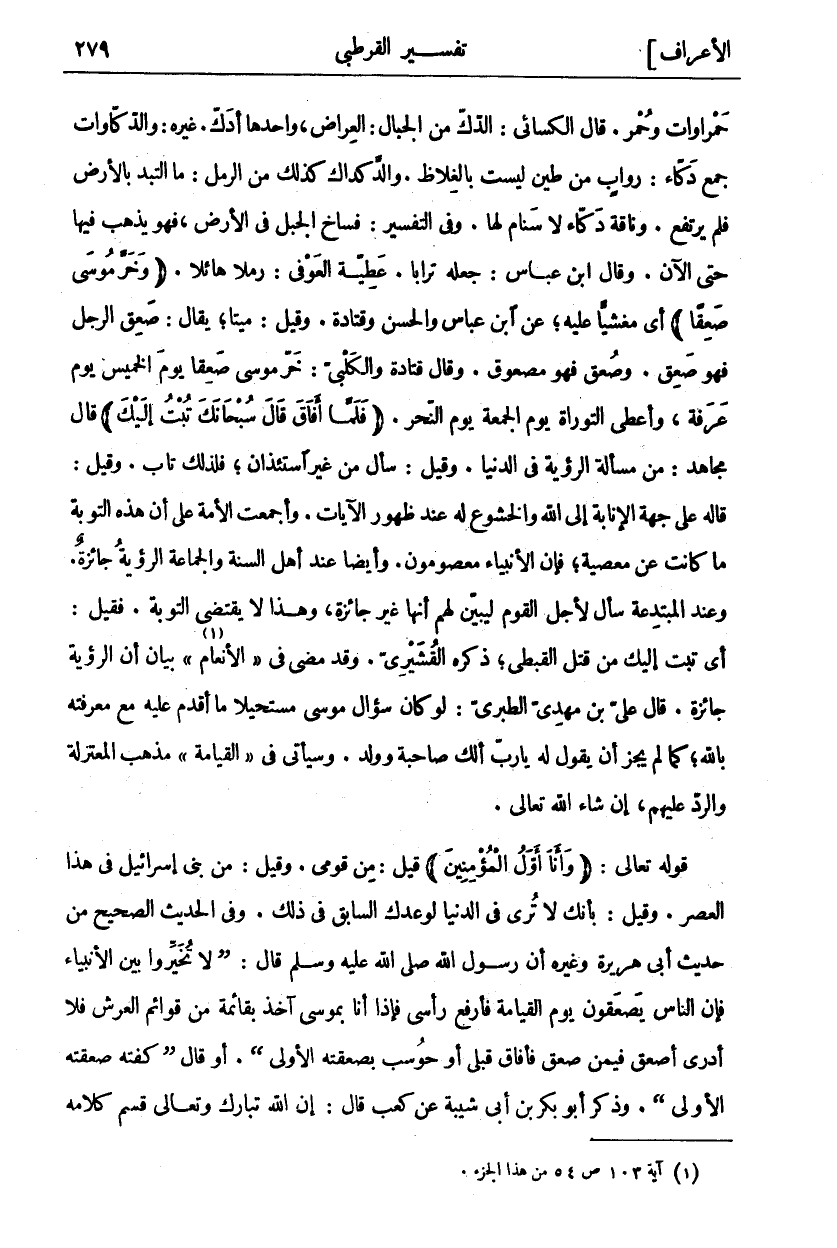 وَدُكٌّ، مِثْلَ حَمْرَاوَاتٍ وَحُمْرٌ. قَالَ الْكِسَائِيُّ: الدُّكُّ مِنَ الْجِبَالِ: الْعِرَاضُ، وَاحِدُهَا أَدَكُّ. غَيْرُهُ: وَالدَّكَّاوَاتُ جَمْعُ دَكَّاءَ: رَوَابٍ مِنْ طِينٍ لَيْسَتْ بِالْغِلَاظِ. وَالدِّكْدَاكُ كَذَلِكَ مِنَ الرَّمْلِ: مَا الْتَبَدَ بِالْأَرْضِ فَلَمْ يَرْتَفِعْ. وَنَاقَةٌ دَكَّاءُ لَا سَنَامَ لَهَا. وَفِي التَّفْسِيرِ: فَسَاخَ الْجَبَلُ فِي الْأَرْضِ، فَهُوَ يَذْهَبُ فِيهَا حَتَّى الْآنَ. وَقَالَ ابْنُ عَبَّاسٍ: جَعَلَهُ تُرَابًا. عَطِيَّةُ الْعَوْفِيُّ: رَمْلًا هَائِلًا. (وَخَرَّ مُوسى صَعِقاً) أَيْ مَغْشِيًّا عَلَيْهِ، عَنِ ابْنِ عَبَّاسٍ وَالْحَسَنِ وَقَتَادَةَ. وَقِيلَ: مَيِّتًا، يُقَالُ: صَعِقَ الرَّجُلُ فَهُوَ صَعِقٌ. وَصُعِقَ فَهُوَ مَصْعُوقٌ. وَقَالَ قَتَادَةُ وَالْكَلْبِيُّ: خَرَّ مُوسَى صَعِقًا يَوْمَ الْخَمِيسَ يَوْمَ عَرَفَةَ، وَأُعْطِيَ التَّوْرَاةَ يَوْمَ الْجُمْعَةِ يَوْمَ النَّحْرِ. فَلَمَّا أَفَاقَ قَالَ سُبْحَانَكَ تُبْتُ إِلَيْكَ قَالَ مُجَاهِدٌ: مِنْ مَسْأَلَةِ الرُّؤْيَةِ فِي الدُّنْيَا. وَقِيلَ: سَأَلَ مِنْ غَيْرِ اسْتِئْذَانٍ، فَلِذَلِكَ تَابَ. وقيل: قال عَلَى جِهَةِ الْإِنَابَةِ إِلَى اللَّهِ وَالْخُشُوعِ لَهُ عِنْدَ ظُهُورِ الْآيَاتِ. وَأَجْمَعَتِ الْأُمَّةُ عَلَى أَنَّ هَذِهِ التَّوْبَةَ مَا كَانَتْ عَنْ مَعْصِيَةٍ، فَإِنَّ الْأَنْبِيَاءَ مَعْصُومُونَ. وَأَيْضًا عِنْدَ أَهْلِ السُّنَّةِ وَالْجَمَاعَةِ الرُّؤْيَةُ جَائِزَةٌ. وَعِنْدَ الْمُبْتَدِعَةِ سَأَلَ لِأَجْلِ الْقَوْمِ لِيُبَيِّنَ لَهُمْ أَنَّهَا غَيْرُ جَائِزَةٍ، وَهَذَا لَا يَقْتَضِي التَّوْبَةَ. فَقِيلَ: أَيْ تُبْتُ إِلَيْكَ مِنْ قَتْلِ الْقِبْطِيِّ، ذَكَرَهُ الْقُشَيْرِيُّ. وَقَدْ مَضَى فِي" الْأَنْعَامِ «١» " بَيَانُ أَنَّ الرُّؤْيَةَ جَائِزَةٌ. قَالَ عَلِيُّ بْنُ مَهْدِيٍّ الطَّبَرِيُّ: لَوْ كَانَ سُؤَالُ مُوسَى مُسْتَحِيلًا مَا أَقْدَمَ عَلَيْهِ مَعَ مَعْرِفَتِهِ بِاللَّهِ، كَمَا لَمْ يَجُزْ أَنْ يَقُولَ لَهُ يَا رَبِّ أَلَكَ صَاحِبَةٌ وَوَلَدٌ. وَسَيَأْتِي فِي" الْقِيَامَةِ «٢» " مَذْهَبُ الْمُعْتَزِلَةِ وَالرَّدُّ عَلَيْهِمْ، إِنْ شَاءَ اللَّهُ تَعَالَى. قَوْلُهُ تَعَالَى: (وَأَنَا أَوَّلُ الْمُؤْمِنِينَ) قِيلَ: بن قَوْمِي. وَقِيلَ: مِنْ بَنِي إِسْرَائِيلَ فِي هَذَا الْعَصْرِ. وَقِيلَ: بِأَنَّكَ لَا تُرَى فِي الدُّنْيَا لِوَعْدِكَ السَّابِقِ، فِي ذَلِكَ. وَفِي الْحَدِيثِ الصَّحِيحِ مِنْ حَدِيثِ أَبِي هُرَيْرَةَ وَغَيْرِهِ أَنَّ رَسُولَ اللَّهِ صَلَّى اللَّهُ عَلَيْهِ وَسَلَّمَ قَالَ: (لَا يخيروا بَيْنَ الْأَنْبِيَاءِ فَإِنَّ النَّاسَ يُصْعَقُونَ يَوْمَ الْقِيَامَةِ فَأَرْفَعُ رَأْسِي فَإِذَا أَنَا بِمُوسَى آخِذٌ بِقَائِمَةٍ مِنْ قَوَائِمِ الْعَرْشِ فَلَا أَدْرِي أَصَعِقَ فِيمَنْ صعق فأفاق قبلي أو حوسب بصفته الْأُولَى (. أَوْ قَالَ (كَفَتْهُ صَعْقَتُهُ الْأُولَى). وَذَكَرَ أَبُو بَكْرِ بْنُ أَبِي شَيْبَةَ عَنْ كَعْبٍ قال: إن الله تبارك وتعالى قسم