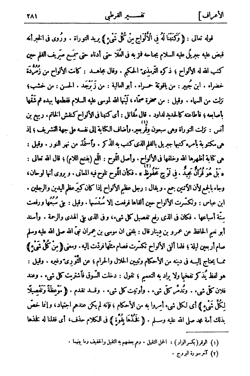 قَوْلُهُ تَعَالَى: (وَكَتَبْنا لَهُ فِي الْأَلْواحِ مِنْ كُلِّ شَيْءٍ) يُرِيدُ التَّوْرَاةَ. وَرُوِيَ فِي الْخَبَرِ أَنَّهُ قَبَضَ عَلَيْهِ جِبْرِيلُ عَلَيْهِ السَّلَامُ بِجَنَاحِهِ فَمَرَّ بِهِ فِي الْعُلَا حَتَّى أَدْنَاهُ حَتَّى سَمِعَ صَرِيفَ الْقَلَمِ حِينَ كَتَبَ اللَّهُ لَهُ الْأَلْوَاحَ، ذَكَرَهُ التِّرْمِذِيُّ الْحَكِيمُ. وَقَالَ مُجَاهِدٌ: كَانَتِ الْأَلْوَاحُ مِنْ زُمُرُّدَةٍ خَضْرَاءَ. ابْنُ جُبَيْرٍ: مِنْ يَاقُوتَةٍ حَمْرَاءَ. أَبُو الْعَالِيَةِ: مِنْ زَبَرْجَدٍ. الْحَسَنُ: مِنْ خَشَبٍ، نَزَلَتْ مِنَ السَّمَاءِ. وَقِيلَ: مِنْ صَخْرَةٍ صَمَّاءَ، لَيَّنَهَا اللَّهُ لِمُوسَى عَلَيْهِ السَّلَامُ فَقَطَعَهَا بِيَدِهِ ثُمَّ شَقَّهَا بِأَصَابِعِهِ، فَأَطَاعَتْهُ كَالْحَدِيدِ لِدَاوُدَ. قَالَ مُقَاتِلٌ: أَيْ كَتَبْنَا (لَهُ «١») فِي الألواح كنقس الْخَاتَمِ. رَبِيعُ بْنُ أَنَسٍ: نَزَلَتِ التَّوْرَاةُ وَهِيَ سَبْعُونَ وِقْرَ «٢» بَعِيرٍ. وَأَضَافَ الْكِتَابَةَ إِلَى نَفْسِهِ عَلَى جِهَةِ التَّشْرِيفِ، إِذْ هِيَ مَكْتُوبَةٌ بِأَمْرِهِ كَتَبَهَا جِبْرِيلُ بِالْقَلَمِ الَّذِي كَتَبَ بِهِ الذِّكْرَ. وَاسْتُمِدَّ مِنْ نَهَرِ النُّورِ. وَقِيلَ: هِيَ كِتَابَةٌ أَظْهَرَهَا اللَّهُ وَخَلَقَهَا فِي الْأَلْوَاحِ. وَأَصْلُ اللُّوحِ: (لَوْحٌ «٣») (بِفَتْحِ اللَّامِ)، قَالَ اللَّهُ تَعَالَى:" بَلْ هُوَ قُرْآنٌ مَجِيدٌ. فِي لَوْحٍ مَحْفُوظٍ «٤» ". فَكَأَنَّ اللَّوْحَ تَلُوحُ فِيهِ الْمَعَانِي. وَيُرْوَى أَنَّهَا لَوْحَانِ، وَجَاءَ بِالْجَمْعِ لِأَنَّ الِاثْنَيْنِ جَمْعٌ. وَيُقَالُ: رَجُلٌ عَظِيمُ الْأَلْوَاحِ إِذَا كَانَ كَبِيرَ عَظْمِ الْيَدَيْنِ وَالرِّجْلَيْنِ. ابْنُ عَبَّاسٍ: وَتَكَسَّرَتِ الْأَلْوَاحُ حِينَ أَلْقَاهَا فَرُفِعَتْ إِلَّا سُدُسَهَا. وَقِيلَ: بَقِيَ سُبُعُهَا وَرُفِعَتْ سِتَّةُ أَسْبَاعِهَا. فَكَانَ فِي الَّذِي رُفِعَ تَفْصِيلُ كل شي، وَفِي الَّذِي بَقِيَ الْهُدَى وَالرَّحْمَةُ. وَأَسْنَدَ أَبُو نُعَيْمٍ الْحَافِظُ عَنْ عَمْرِو بْنِ دِينَارٍ قَالَ: بَلَغَنِي أَنَّ مُوسَى بْنَ عِمْرَانَ نَبِيَّ اللَّهِ صَلَّى اللَّهُ عَلَيْهِ وَسَلَّمَ صَامَ أَرْبَعِينَ لَيْلَةً، فَلَمَّا أَلْقَى الْأَلْوَاحَ تَكَسَّرَتْ فَصَامَ مِثْلَهَا فَرُدَّتْ إِلَيْهِ. وَمَعْنَى" مِنْ كُلِّ شَيْءٍ" مِمَّا يَحْتَاجُ إِلَيْهِ فِي دِينِهِ مِنَ الْأَحْكَامِ وَتَبْيِينِ الْحَلَالِ وَالْحَرَامِ، عَنِ الثَّوْرِيِّ وَغَيْرِهِ. وَقِيلَ: هُوَ لَفْظٌ يُذْكَرُ تَفْخِيمًا وَلَا يُرَادُ بِهِ التَّعْمِيمُ، تَقُولُ: دخلت السوق فاشتريت كل شي. وعند فلان كل شي. وَ" تُدَمِّرُ كُلَّ شَيْءٍ «٥» "." وَأُوتِيَتْ مِنْ كُلِّ شَيْءٍ «٦» " وقد تقدم. (موعظة وتفصيلا لكل شي) أي لكل شي أُمِرُوا بِهِ مِنَ الْأَحْكَامِ، فَإِنَّهُ لَمْ يَكُنْ عِنْدَهُمُ اجْتِهَادٌ، وَإِنَّمَا خُصَّ بِذَلِكَ أُمَّةُ مُحَمَّدٍ صَلَّى اللَّهُ عَلَيْهِ وَسَلَّمَ. (فَخُذْها بِقُوَّةٍ) فِي الْكَلَامِ حَذْفٌ، أَيْ فَقُلْنَا لَهُ: خُذْهَا بِقُوَّةٍ، أي بجد ونشاط. نظيره