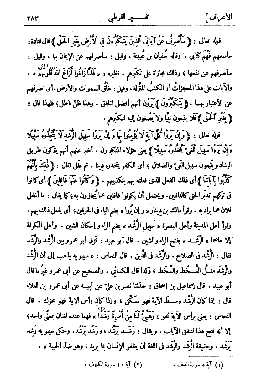 قَوْلُهُ تَعَالَى: (سَأَصْرِفُ عَنْ آياتِيَ الَّذِينَ يَتَكَبَّرُونَ فِي الْأَرْضِ بِغَيْرِ الْحَقِّ) قَالَ قَتَادَةُ: سَأَمْنَعُهُمْ فَهْمَ كِتَابِي. وَقَالَهُ سُفْيَانُ بْنُ عُيَيْنَةَ. وَقِيلَ: سَأَصْرِفُهُمْ عَنِ الْإِيمَانِ بِهَا. وَقِيلَ: سَأَصْرِفُهُمْ عَنْ نَفْعِهَا، وَذَلِكَ مُجَازَاةً عَلَى تَكَبُّرِهِمْ. نَظِيرُهُ:" فَلَمَّا زاغُوا أَزاغَ اللَّهُ «١» قُلُوبَهُمْ". وَالْآيَاتُ عَلَى هَذَا الْمُعْجِزَاتُ أَوِ الْكُتُبُ الْمُنَزَّلَةُ. وَقِيلَ: خَلْقُ السَّمَاوَاتِ وَالْأَرْضِ. أَيْ أَصْرِفُهُمْ عَنْ الِاعْتِبَارِ بِهَا. (يَتَكَبَّرُونَ) يَرَوْنَ أَنَّهُمْ أَفْضَلُ الْخَلْقِ. وَهَذَا ظَنٌّ بَاطِلٌ، فَلِهَذَا قَالَ: (بِغَيْرِ الْحَقِّ) فَلَا يَتَّبِعُونَ نَبِيًّا وَلَا يَصْغُونَ إِلَيْهِ لِتَكَبُّرِهِمْ. قَوْلُهُ تَعَالَى: (وَإِنْ يَرَوْا كُلَّ آيَةٍ لَا يُؤْمِنُوا بِها وَإِنْ يَرَوْا سَبِيلَ الرُّشْدِ لَا يَتَّخِذُوهُ سَبِيلًا وَإِنْ يَرَوْا سَبِيلَ الغَيِّ يَتَّخِذُوهُ سَبِيلًا) يَعْنِي هَؤُلَاءِ الْمُتَكَبِّرُونَ. أَخْبَرَ عَنْهُمْ أَنَّهُمْ يَتْرُكُونَ طَرِيقَ الرَّشَادِ وَيَتَّبِعُونَ سَبِيلَ الْغَيِّ وَالضَّلَالِ، أَيِ الْكُفْرُ يَتَّخِذُونَهُ دِينًا. ثُمَّ عَلَّلَ فَقَالَ: (ذَلِكَ بِأَنَّهُمْ كَذَّبُوا بِآيَاتِنَا) أَيْ ذَلِكَ الْفِعْلُ الَّذِي فَعَلْتُهُ بِهِمْ بِتَكْذِيبِهِمْ. (وَكَانُوا عَنْهَا غَافِلِينَ) أَيْ كَانُوا فِي تَرْكِهِمْ تَدَبُّرَ الْحَقِّ كَالْغَافِلِينَ. وَيَحْتَمِلُ أَنْ يَكُونُوا غَافِلِينَ عَمَّا يُجَازَوْنَ بِهِ، كَمَا يُقَالُ: مَا أَغْفَلَ فُلَانٍ عَمَّا يُرَادُ بِهِ، وَقَرَأَ مَالِكُ بْنُ دِينَارٍ" وَإِنْ يُرَوْا" بِضَمِّ الْيَاءِ فِي الْحَرْفَيْنِ، أَيْ يَفْعَلُ ذَلِكَ بِهِمْ. وَقَرَأَ أَهْلُ الْمَدِينَةِ وَأَهْلُ الْبَصْرَةِ" سَبِيلَ الرُّشْدِ" بِضَمِّ الرَّاءِ وَإِسْكَانِ الشِّينِ. وَأَهْلُ الْكُوفَةِ إِلَّا عَاصِمًا" الرَّشَدِ" بِفَتْحِ الرَّاءِ وَالشِّينِ. قَالَ أَبُو عُبَيْدٍ: فَرَّقَ أَبُو عَمْرٍو بَيْنَ الرُّشْدِ وَالرَّشَدِ فَقَالَ: الرُّشْدُ فِي الصَّلَاحِ. وَالرَّشَدُ فِي الدِّينِ. قَالَ النَّحَّاسُ:" سِيبَوَيْهِ يَذْهَبُ إِلَى أَنَّ الرُّشْدَ وَالرَّشَدَ مِثْلُ السُّخْطِ وَالسَّخَطِ، وَكَذَا قَالَ الْكِسَائِيُّ. وَالصَّحِيحُ عَنْ أَبِي عَمْرٍو غَيْرُ مَا قَالَ أَبُو عُبَيْدٍ. قَالَ إِسْمَاعِيلُ بْنُ إِسْحَاقَ: حَدَّثَنَا نَصْرُ بْنُ عَلِيٍّ عَنْ أَبِيهِ عَنْ أَبِي عَمْرِو بْنِ الْعَلَاءِ قَالَ: إِذَا كَانَ الرُّشْدُ وَسَطَ الْآيَةِ فَهُوَ مُسَكَّنٌ، وَإِذَا كَانَ رَأْسَ الْآيَةِ فَهُوَ مُحَرَّكٌ. قَالَ النَّحَّاسُ: يَعْنِي بِرَأْسِ الْآيَةِ نَحْوَ" وَهَيِّئْ لَنا مِنْ أَمْرِنا رَشَداً «٢» ١٠" فَهُمَا عِنْدَهُ لُغَتَانِ بِمَعْنًى وَاحِدٍ، إِلَّا أَنَّهُ فَتَحَ هَذَا لِتَتَّفِقَ الْآيَاتُ. وَيُقَالُ: رَشَدَ يَرْشُدُ، وَرَشُدَ يَرْشُدُ. وَحَكَى سِيبَوَيْهِ رَشِدَ يَرْشَدُ. وَحَقِيقَةُ الرُّشْدِ وَالرَّشَدِ فِي اللُّغَةِ أَنْ يَظْفَرَ الْإِنْسَانُ بِمَا يُرِيدُ، وهو ضد الخيبة".