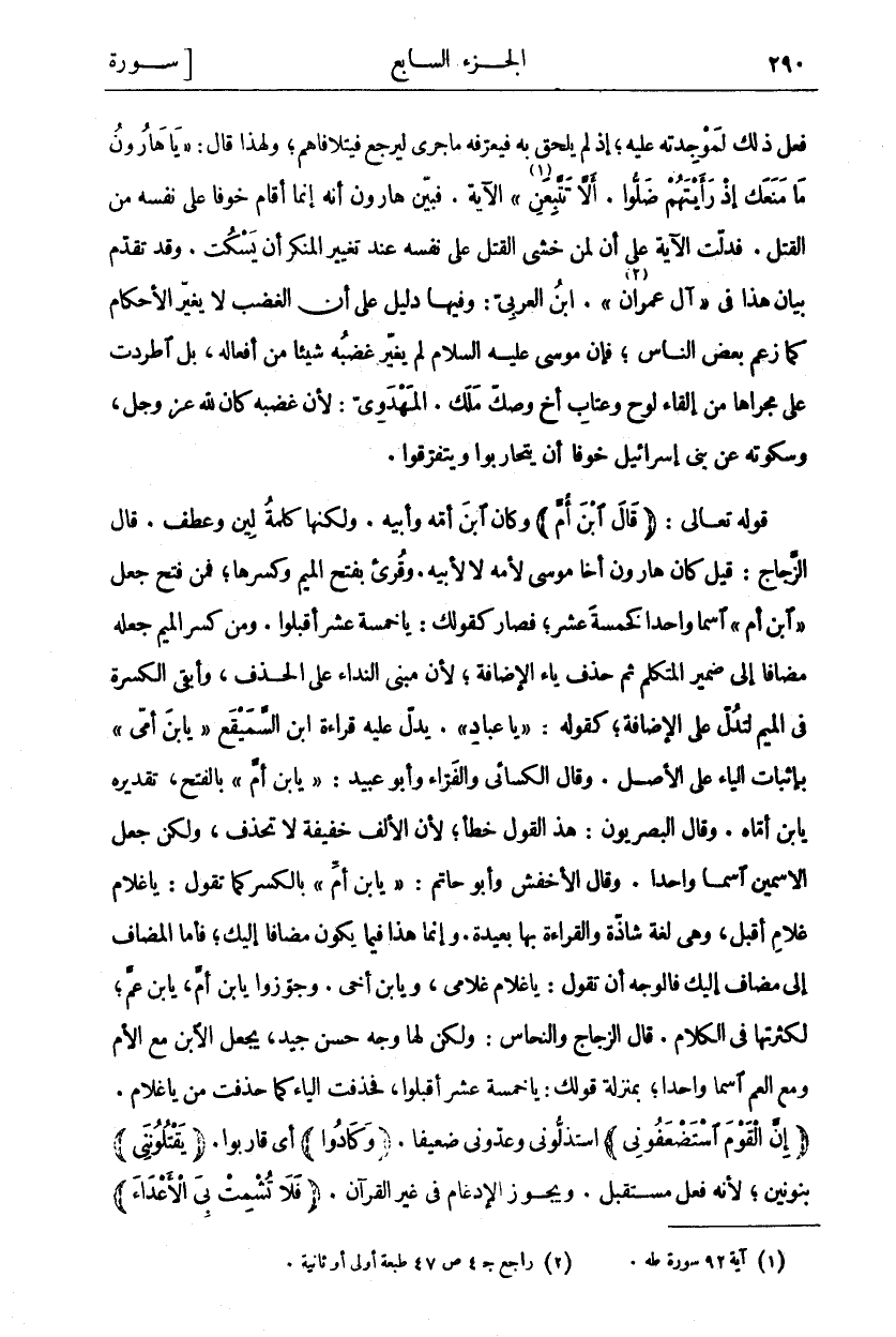 " بالفتح، تقديره يا بن أُمَّاهُ. وَقَالَ الْبَصْرِيُّونَ: هَذَا الْقَوْلُ خَطَأٌ، لِأَنَّ الْأَلِفَ خَفِيفَةٌ لَا تُحْذَفُ، وَلَكِنْ جَعَلَ الِاسْمَيْنِ اسما واحدا. وقال الأخفش وأبو حاتم:"ابْنَ أُمَّ ٢٠: ٩٤