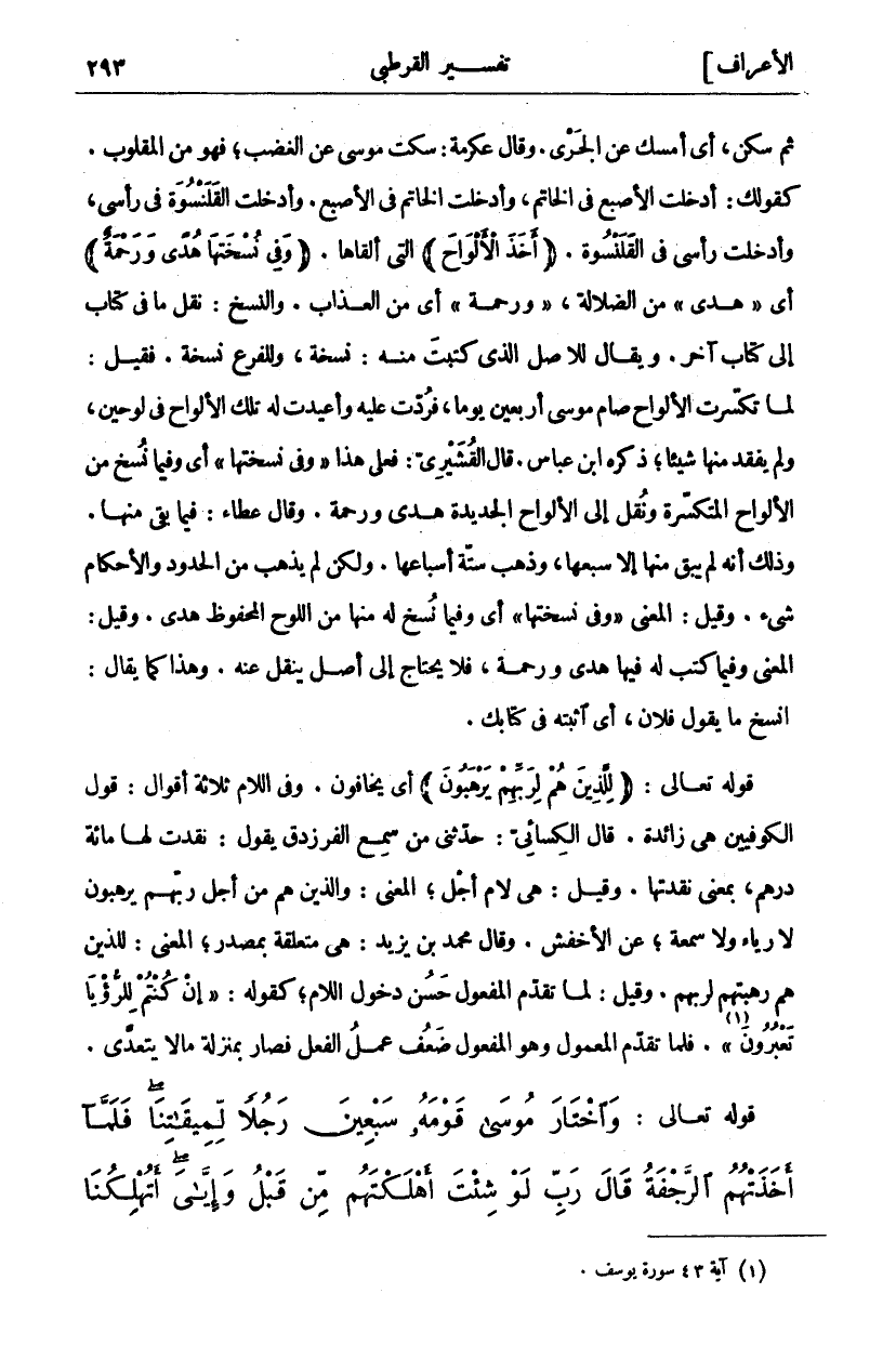 ثُمَّ سَكَنَ، أَيْ أَمْسَكَ عَنِ الْجَرْيِ. وَقَالَ عِكْرِمَةُ: سَكَتَ مُوسَى عَنِ الْغَضَبِ، فَهُوَ مِنَ الْمَقْلُوبِ. كَقَوْلِكَ: أَدْخَلْتُ الْأُصْبُعَ فِي الْخَاتَمِ وَأَدْخَلْتُ الْخَاتَمَ فِي الْأُصْبُعِ. وَأَدْخَلْتُ الْقَلَنْسُوَةَ فِي رَأْسِي، وَأَدْخَلْتُ رَأْسِي فِي الْقَلَنْسُوَةِ. (أَخَذَ الْأَلْواحَ) الَّتِي أَلْقَاهَا. (وَفِي نُسْخَتِهَا هُدًى وَرَحْمَةٌ) أَيْ" هُدىً" مِنَ الضَّلَالَةِ،" وَرَحْمَةٌ" أَيْ مِنَ الْعَذَابِ. وَالنَّسْخُ: نَقْلُ مَا فِي كِتَابٍ إِلَى كِتَابٍ آخَرَ. وَيُقَالُ لِلْأَصْلِ الَّذِي كُتِبَتْ مِنْهُ: نُسْخَةٌ، وَلِلْفَرْعِ نُسْخَةٌ. فَقِيلَ: لَمَّا تَكَسَّرَتِ الْأَلْوَاحُ صَامَ مُوسَى أَرْبَعِينَ يَوْمًا، فَرُدَّتْ عَلَيْهِ وَأُعِيدَتْ لَهُ تِلْكَ الْأَلْوَاحُ فِي لَوْحَيْنِ، وَلَمْ يَفْقِدْ مِنْهَا شَيْئًا، ذَكَرَهُ ابْنُ عَبَّاسٍ. قَالَ الْقُشَيْرِيُّ: فَعَلَى هَذَا" وَفِي نُسْخَتِهَا" أَيْ وَفِيمَا نُسِخَ مِنَ الْأَلْوَاحِ الْمُتَكَسِّرَةِ وَنُقِلَ إِلَى الْأَلْوَاحِ الْجَدِيدَةِ هُدًى وَرَحْمَةٌ. وَقَالَ عَطَاءٌ: وَفِيمَا بَقِيَ مِنْهَا. وَذَلِكَ أَنَّهُ لَمْ يَبْقَ مِنْهَا إِلَّا سُبُعُهَا، وَذَهَبَ سِتَّةُ أَسْبَاعِهَا. وَلَكِنْ لَمْ يَذْهَبْ مِنَ الْحُدُودِ وَالْأَحْكَامِ شي. وَقِيلَ: الْمَعْنَى" وَفِي نُسْخَتِهَا" أَيْ وَفِيمَا نُسِخَ لَهُ مِنْهَا مِنَ اللَّوْحِ الْمَحْفُوظِ هُدًى. وَقِيلَ: الْمَعْنَى وَفِيمَا كُتِبَ لَهُ فِيهَا هُدًى وَرَحْمَةٌ، فَلَا يَحْتَاجُ إِلَى أَصْلٍ يَنْقُلُ عَنْهُ. وَهَذَا كَمَا يُقَالُ: انْسَخْ مَا يَقُولُ فُلَانٌ، أَيْ أثبته في كتابك. قوله تعالى: (لِلَّذِينَ هُمْ لِرَبِّهِمْ يَرْهَبُونَ) أَيْ يَخَافُونَ. وَفِي اللَّامِ ثَلَاثَةُ أَقْوَالٍ: قَوْلُ الْكُوفِيِّينَ هِيَ زَائِدَةٌ. قَالَ الْكِسَائِيُّ: حَدَّثَنِي مَنْ سَمِعَ الْفَرَزْدَقَ يَقُولُ نَقَدْتُ لَهَا مِائَةَ دِرْهَمٍ، بِمَعْنَى نَقَدْتُهَا. وَقِيلَ: هِيَ لَامُ أَجْلٍ، الْمَعْنَى: وَالَّذِينَ هُمْ مِنْ أجل ربهم يرهبون رِيَاءَ وَلَا سُمْعَةَ، عَنِ الْأَخْفَشِ. وَقَالَ مُحَمَّدُ بْنُ يَزِيدَ: هِيَ مُتَعَلِّقَةٌ بِمَصْدَرٍ، الْمَعْنَى: لِلَّذِينَ هُمْ رَهْبَتُهُمْ لِرَبِّهِمْ. وَقِيلَ: لَمَّا تَقَدَّمَ الْمَفْعُولُ حسن دخول اللام، كقول:" إِنْ كُنْتُمْ لِلرُّءْيا تَعْبُرُونَ «١» ". فَلَمَّا تَقَدَّمَ الْمَعْمُولُ وَهُوَ الْمَفْعُولُ ضَعُفَ عَمَلُ الْفِعْلِ فَصَارَ بِمَنْزِلَةِ مَا لَا يَتَعَدَّى.