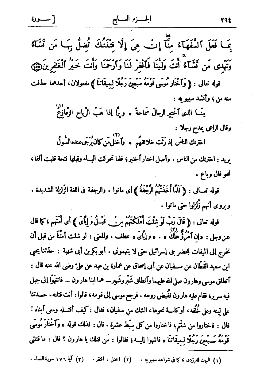 يُرِيدُ: اخْتَرْتُكَ مِنَ النَّاسِ. وَأَصْلُ اخْتَارَ اخْتِيرَ، فَلَمَّا تَحَرَّكَتِ الْيَاءُ وَقَبْلَهَا فَتْحَةٌ قُلِبَتْ أَلِفًا، نَحْو قَالَ وَبَاعَ. قَوْلُهُ تَعَالَى: (فَلَمَّا أَخَذَتْهُمُ الرَّجْفَةُ) أَيْ مَاتُوا. وَالرَّجْفَةُ فِي اللُّغَةِ الزَّلْزَلَةُ الشَّدِيدَةُ. وَيُرْوَى أَنَّهُمْ زُلْزِلُوا حَتَّى مَاتُوا. قَوْلُهُ تَعَالَى: (قالَ رَبِّ لَوْ شِئْتَ أَهْلَكْتَهُمْ مِنْ قَبْلُ وَإِيَّايَ) أَيْ أَمَتَّهُمْ، كَمَا قَالَ عَزَّ وَجَلَّ:" إِنِ امْرُؤٌ هَلَكَ «٣» "." وَإِيَّايَ ٤٠" عَطْفٌ. وَالْمَعْنَى: لَوْ شِئْتَ أَمَتَّنَا مِنْ قَبْلِ أَنْ نَخْرُجَ إِلَى الْمِيقَاتِ بِمَحْضَرِ بَنِي إِسْرَائِيلَ حَتَّى لَا يَتَّهِمُونِي. أَبُو بَكْرِ بْنُ أَبِي شَيْبَةَ: حَدَّثَنَا يَحْيَى بْنُ سَعِيدٍ الْقَطَّانُ عَنْ سُفْيَانَ عَنْ أَبِي إِسْحَاقَ عَنْ عُمَارَةَ بْنِ عَبْدٍ عَنْ عَلِيٍّ رَضِيَ اللَّهُ عَنْهُ قَالَ: انْطَلَقَ مُوسَى وَهَارُونُ صَلَّى اللَّهُ عَلَيْهِمَا وَانْطَلَقَ شَبَّرُ وَشَبِّيرُ- هُمَا ابْنَا هَارُونَ- فَانْتَهَوْا إِلَى جَبَلٍ فِيهِ سَرِيرٌ، فَقَامَ عَلَيْهِ هَارُونُ فَقُبِضَ رُوحُهُ. فَرَجَعَ مُوسَى إِلَى قَوْمِهِ، فَقَالُوا: أَنْتَ قَتَلْتَهُ، حَسَدْتَنَا «٤» عَلَى لِينِهِ وَعَلَى خُلُقِهِ، أَوْ كَلِمَةٍ نَحْوَهَا، الشَّكُّ مِنْ سُفْيَانَ، فَقَالَ: كَيْفَ أَقْتُلُهُ وَمَعِيَ ابْنَاهُ! قَالَ: فَاخْتَارُوا مَنْ شِئْتُمْ، فَاخْتَارُوا مِنْ كُلِّ سِبْطٍ عَشَرَةً. قَالَ: فَذَلِكَ قَوْلُهُ:" وَاخْتارَ مُوسى قَوْمَهُ سَبْعِينَ رَجُلًا لِمِيقاتِنا" فَانْتَهَوْا إِلَيْهِ، فَقَالُوا: مَنْ قتلك يا هارون؟ قال: ما قتلني