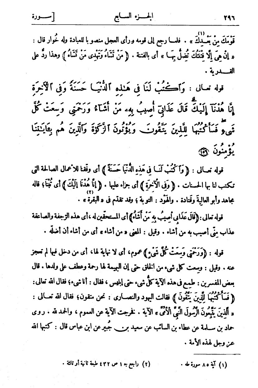 قَوْلُهُ تَعَالَى: (وَاكْتُبْ لَنا فِي هذِهِ الدُّنْيا حَسَنَةً) أَيْ وَفِّقْنَا لِلْأَعْمَالِ الصَّالِحَةِ الَّتِي تَكْتُبُ لَنَا بِهَا الْحَسَنَاتِ. (وَفِي الْآخِرَةِ) ٢٠ أَيْ جَزَاءً عَلَيْهَا. (إِنَّا هُدْنا إِلَيْكَ) أَيْ تُبْنَا، قَالَهُ مُجَاهِدٌ وَأَبُو الْعَالِيَةِ وَقَتَادَةُ. وَالْهَوْدُ: التوبة، وَقَدْ تَقَدَّمَ فِي الْبَقَرَةِ «٢». قَوْلُهُ تَعَالَى: (قالَ عَذابِي أُصِيبُ بِهِ مَنْ أَشاءُ) أَيِ الْمُسْتَحَقِّينَ لَهُ، أَيْ هَذِهِ الرَّجْفَةُ وَالصَّاعِقَةُ عَذَابٌ مِنِّي أُصِيبُ بِهِ مَنْ أَشَاءُ. وَقِيلَ: الْمَعْنَى" مَنْ أَشاءُ" أَيْ مَنْ أَشَاءُ أَنْ أُضِلَّهُ. قَوْلُهُ تَعَالَى: (وَرَحْمَتِي وَسِعَتْ كُلَّ شَيْءٍ) عُمُومٌ، أَيْ لَا نِهَايَةَ لَهَا أَيْ مَنْ دَخَلَ فِيهَا لم تعجز عنه. وقيل: وسعت كل شي مِنَ الْخَلْقِ حَتَّى إِنَّ الْبَهِيمَةَ لَهَا رَحْمَةٌ وَعَطْفٌ عَلَى وَلَدِهَا. قَالَ بَعْضُ الْمُفَسِّرِينَ: طَمِعَ في هذه الآية كل شي حتى إبليس فقال: أنا شي، فَقَالَ اللَّهُ تَعَالَى: (فَسَأَكْتُبُها لِلَّذِينَ يَتَّقُونَ) فَقَالَتِ الْيَهُودُ وَالنَّصَارَى: نَحْنُ مُتَّقُونَ، فَقَالَ اللَّهُ تَعَالَى:" الَّذِينَ يَتَّبِعُونَ الرَّسُولَ النَّبِيَّ الْأُمِّيَّ" الْآيَةَ. فَخَرَجَتِ الْآيَةُ عَنِ الْعُمُومِ، وَالْحَمْدُ لِلَّهِ. رَوَى حَمَّادُ بْنُ سَلَمَةَ عَنْ عَطَاءِ بْنِ السَّائِبِ عَنْ سَعِيدِ بْنِ جُبَيْرٍ عَنِ ابْنِ عَبَّاسٍ قَالَ: كتبها الله عز وجل لهذه الأمة.