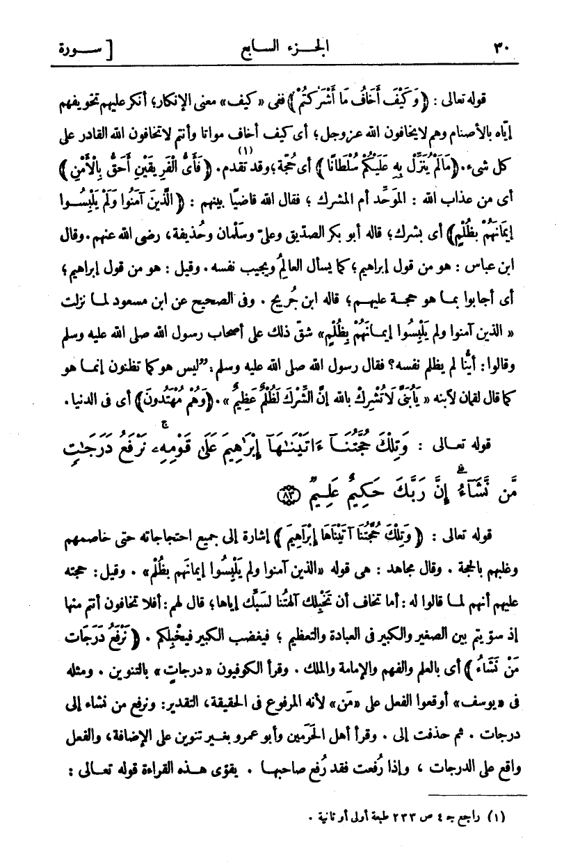 قَوْلُهُ تَعَالَى: (وَتِلْكَ حُجَّتُنا آتَيْناها إِبْراهِيمَ) (تِلْكَ) «٤» إِشَارَةٌ إِلَى جَمِيعِ احْتِجَاجَاتِهِ حَتَّى خَاصَمَهُمْ وَغَلَبَهُمْ بالحجة. وقال مجاهد: هي قول:" الَّذِينَ آمَنُوا وَلَمْ يَلْبِسُوا إِيمانَهُمْ بِظُلْمٍ". وَقِيلَ: حُجَّتُهُ عَلَيْهِمْ أَنَّهُمْ لَمَّا قَالُوا لَهُ: أَمَا تَخَافُ «٥» أَنْ تَخْبِلَكَ آلِهَتُنَا لِسَبِّكَ إِيَّاهَا؟ قَالَ لَهُمْ: أَفَلَا تَخَافُونَ أَنْتُمْ مِنْهَا إِذْ سَوَّيْتُمْ بَيْنَ الصَّغِيرِ وَالْكَبِيرِ فِي الْعِبَادَةِ وَالتَّعْظِيمِ، فَيَغْضَبُ الْكَبِيرُ فَيَخْبِلَكُمْ؟. (نَرْفَعُ دَرَجاتٍ مَنْ نَشاءُ) أَيْ بِالْعِلْمِ وَالْفَهْمِ وَالْإِمَامَةِ وَالْمُلْكِ. وَقَرَأَ الْكُوفِيُّونَ" دَرَجَاتٍ" بِالتَّنْوِينِ. وَمِثْلُهُ فِي" يُوسُفَ «٦» " أَوْقَعُوا الْفِعْلَ عَلَى" مَنْ" لِأَنَّهُ الْمَرْفُوعُ فِي الْحَقِيقَةِ، التَّقْدِيرُ: وَنَرْفَعُ مَنْ نَشَاءُ إِلَى دَرَجَاتٍ. ثُمَّ حُذِفَتْ إِلَى. وَقَرَأَ أَهْلُ الْحَرَمَيْنِ وَأَبُو عَمْرٍو بِغَيْرِ تَنْوِينٍ على الإضافة، والفعل واقع على الدرجات، إذا رفعت فقد رفع