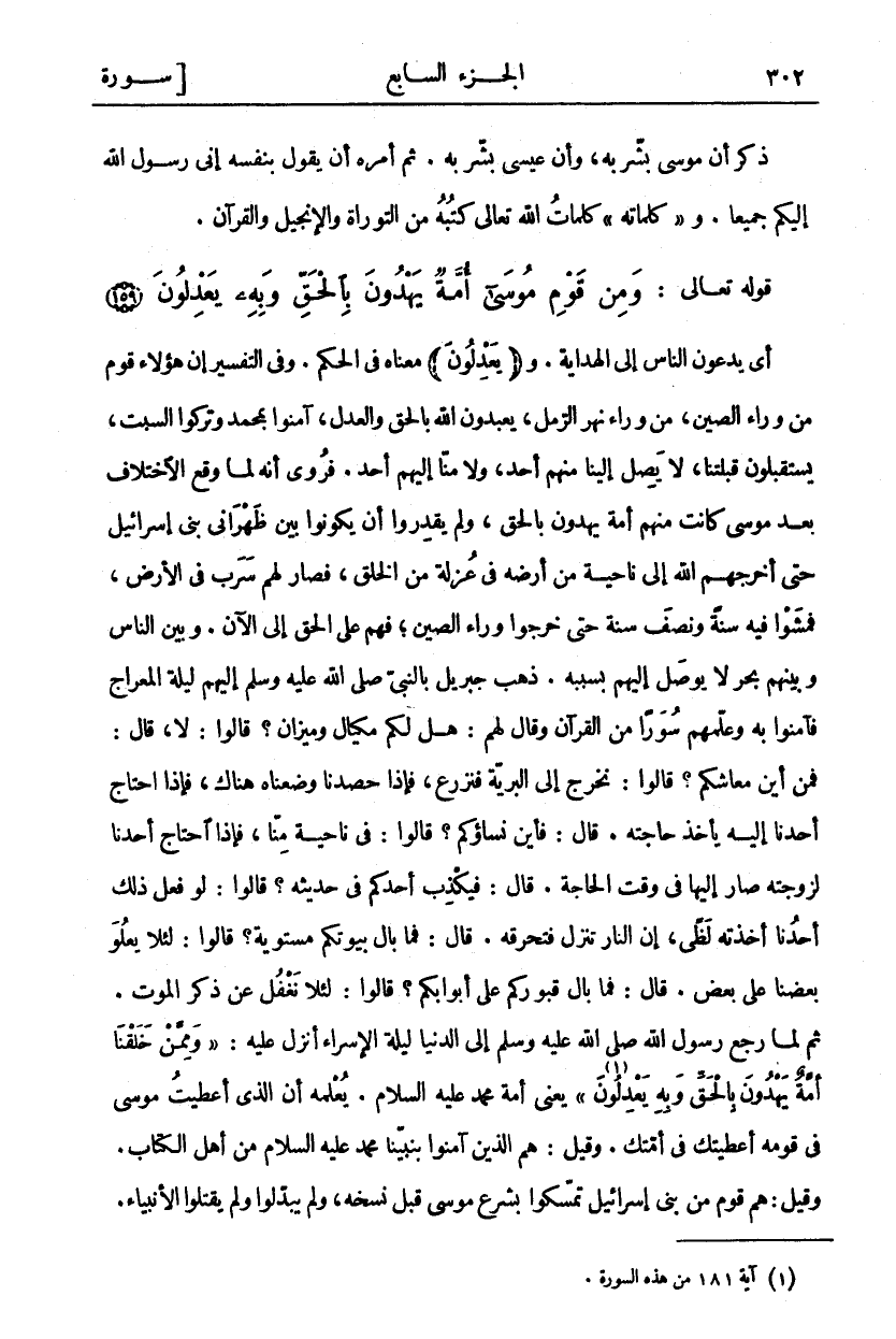 وَمِنْ قَوْمِ مُوسى أُمَّةٌ يَهْدُونَ بِالْحَقِّ وَبِهِ يَعْدِلُونَ (١٥٩)