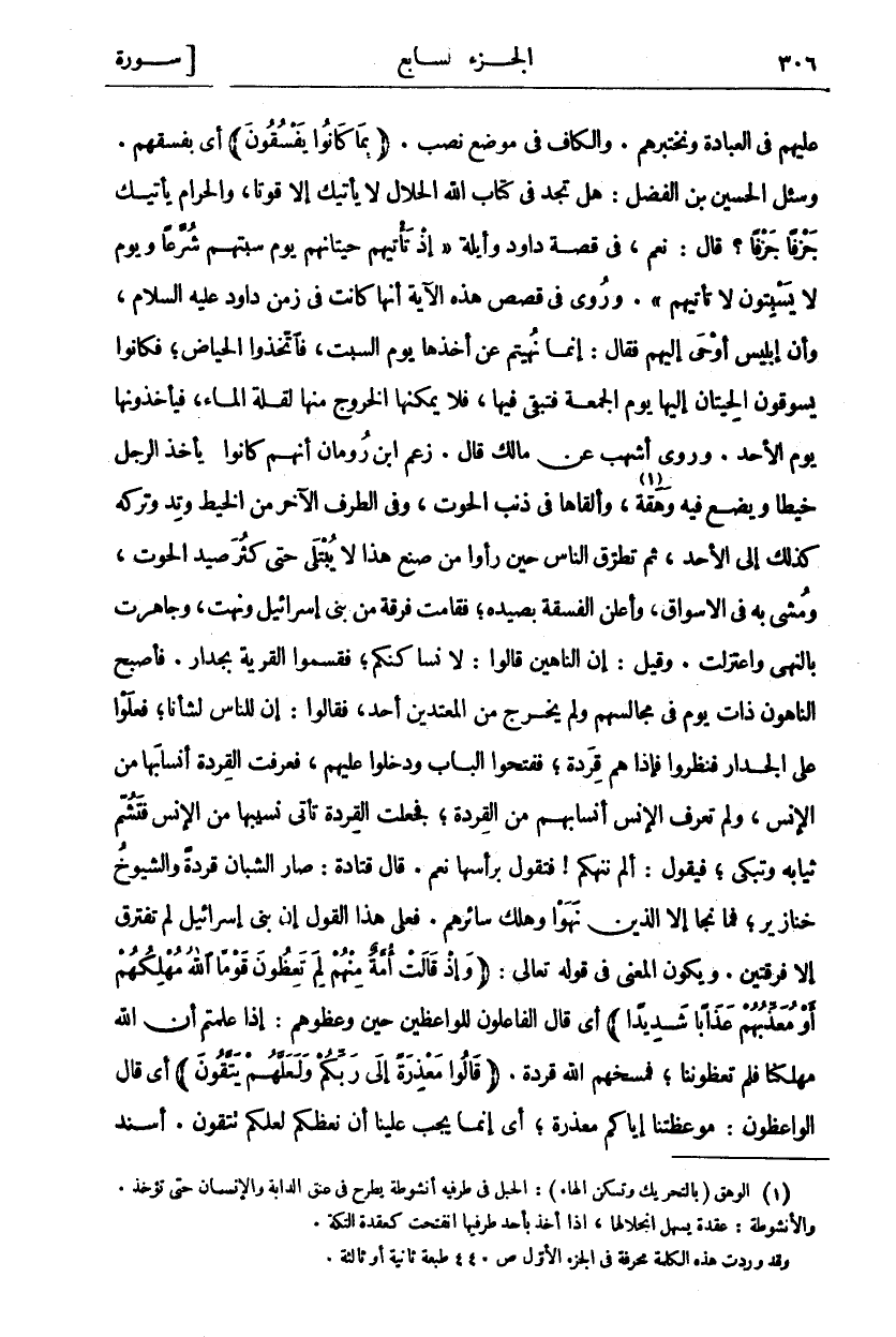 عَلَيْهِمْ فِي الْعِبَادَةِ وَنَخْتَبِرُهُمْ. وَالْكَافُ فِي مَوْضِعِ نصب. (بِما كانُوا يَفْسُقُونَ) أي بفسقهم. وسيل الْحُسَيْنُ بْنُ الْفَضْلِ: هَلْ تَجِدُ فِي كِتَابِ اللَّهِ الْحَلَالُ لَا يَأْتِيكَ إِلَّا قُوتًا، وَالْحَرَامُ يَأْتِيكَ جَزْفًا جَزْفًا؟ قَالَ: نَعَمْ، فِي قِصَّةِ دَاوُدَ وَأَيْلَةُ" إِذْ تَأْتِيهِمْ حِيتانُهُمْ يَوْمَ سَبْتِهِمْ شُرَّعاً وَيَوْمَ لَا يَسْبِتُونَ لَا تَأْتِيهِمْ". وَرُوِيَ فِي قَصَصِ هَذِهِ الْآيَةِ أَنَّهَا كَانَتْ فِي زَمَنِ دَاوُدَ عَلَيْهِ السَّلَامُ، وَأَنَّ إِبْلِيسَ أَوْحَى إِلَيْهِمْ فَقَالَ: إِنَّمَا نُهِيتُمْ عَنْ أَخْذِهَا يَوْمَ السَّبْتِ، فَاتَّخِذُوا الْحِيَاضَ، فَكَانُوا يَسُوقُونَ الْحِيتَانَ إِلَيْهَا يَوْمَ الْجُمْعَةِ فَتَبْقَى فِيهَا، فَلَا يُمْكِنُهَا الْخُرُوجُ مِنْهَا لِقِلَّةِ الْمَاءِ، فَيَأْخُذُونَهَا يَوْمَ الْأَحَدِ. وَرَوَى أَشْهَبُ عَنْ مَالِكٍ قَالَ: زَعَمَ ابْنُ رُومَانَ أَنَّهُمْ كَانُوا يَأْخُذُ الرَّجُلُ خَيْطًا وَيَضَعُ فِيهِ وَهْقَةً «١»، وَأَلْقَاهَا فِي ذَنَبِ الْحُوتِ، وَفِي الطَّرَفِ الْآخَرِ مِنَ الْخَيْطِ وَتَدٌ وَتَرَكَهُ كَذَلِكَ إِلَى الْأَحَدِ، ثُمَّ تَطَرَّقَ النَّاسُ حِينَ رَأَوْا مَنْ صَنَعَ هَذَا لَا يُبْتَلَى حَتَّى كَثُرَ صَيْدُ الْحُوتِ، وَمُشِيَ بِهِ فِي الْأَسْوَاقِ، وَأَعْلَنَ الْفَسَقَةُ بِصَيْدِهِ، فَقَامَتْ فِرْقَةٌ مِنْ بَنِي إِسْرَائِيلَ وَنَهَتْ، وَجَاهَرَتْ بِالنَّهْيِ وَاعْتَزَلَتْ. وَقِيلَ «٢»: إِنَّ النَّاهِينَ قَالُوا: لَا نُسَاكِنُكُمْ، فَقَسَمُوا الْقَرْيَةَ بِجِدَارٍ. فَأَصْبَحَ النَّاهُونَ ذَاتَ يَوْمٍ فِي مَجَالِسِهِمْ وَلَمْ يَخْرُجْ مِنَ الْمُعْتَدِينَ أَحَدٌ، فَقَالُوا: إِنَّ لِلنَّاسِ لَشَأْنًا، فَعَلَوْا عَلَى الْجِدَارِ فَنَظَرُوا فَإِذَا هُمْ قِرَدَةٌ، فَفَتَحُوا الْبَابَ وَدَخَلُوا عَلَيْهِمْ، فَعَرَفَتِ الْقِرَدَةُ أَنْسَابَهَا مِنَ الْإِنْسِ، وَلَمْ تَعْرِفِ الْإِنْسُ أَنْسَابَهُمْ مِنَ الْقِرَدَةِ، فَجَعَلَتِ الْقِرَدَةُ تَأْتِي نَسِيبَهَا مِنَ الْإِنْسِ فَتَشُمُّ ثِيَابَهُ وَتَبْكِي، فَيَقُولُ: أَلَمْ نَنْهَكُمْ! فَتَقُولُ بِرَأْسِهَا نَعَمْ. قَالَ قَتَادَةُ: صَارَ الشُّبَّانُ قِرَدَةً وَالشُّيُوخُ خَنَازِيرَ، فَمَا نَجَا إِلَّا الَّذِينَ نَهَوْا وَهَلَكَ سَائِرُهُمْ. فَعَلَى هَذَا الْقَوْلِ إِنَّ بَنِي إِسْرَائِيلَ لَمْ تَفْتَرِقْ إِلَّا فِرْقَتَيْنِ. وَيَكُونُ الْمَعْنَى فِي قَوْلِهِ تَعَالَى (وَإِذْ قالَتْ أُمَّةٌ مِنْهُمْ لِمَ تَعِظُونَ قَوْماً اللَّهُ مُهْلِكُهُمْ أَوْ مُعَذِّبُهُمْ عَذاباً شَدِيداً) أَيْ قَالَ الْفَاعِلُونَ لِلْوَاعِظِينَ حِينَ وَعَظُوهُمْ: إِذَا عَلِمْتُمْ أَنَّ اللَّهَ مُهْلِكُنَا فَلِمَ تَعِظُونَنَا؟ فَمَسَخَهُمُ اللَّهُ قِرَدَةً. (قَالُوا مَعْذِرَةً إِلَى رَبِّكُمْ وَلَعَلَّهُمْ يَتَّقُونَ) أَيْ قَالَ الْوَاعِظُونَ: مَوْعِظَتُنَا إِيَّاكُمْ مَعْذِرَةً (إِلَى «٣» رَبِّكُمْ)، أَيْ إِنَّمَا يَجِبُ عَلَيْنَا أن نعظكم لعلكم تتقون. أسند