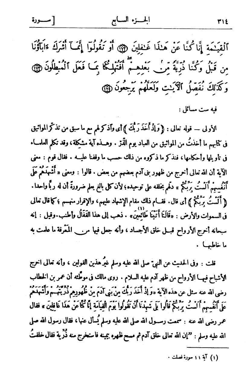 فِيهِ سِتُّ مَسَائِلَ: الْأُولَى- قَوْلُهُ تَعَالَى: (وَإِذْ أَخَذَ رَبُّكَ) أَيْ وَاذْكُرْ لَهُمْ مَعَ مَا سَبَقَ مِنْ تَذْكِيرِ الْمَوَاثِيقِ فِي كِتَابِهِمْ مَا أَخَذْتُ مِنَ الْمَوَاثِيقِ مِنَ الْعِبَادِ يَوْمَ الذَّرِّ. وَهَذِهِ آيَةٌ مُشْكِلَةٌ وَقَدْ تَكَلَّمَ الْعُلَمَاءُ فِي تَأْوِيلِهَا وَأَحْكَامِهَا، فَنَذْكُرُ مَا ذَكَرُوهُ مِنْ ذَلِكَ حَسَبَ مَا وَقَفْنَا عَلَيْهِ فَقَالَ قَوْمٌ: مَعْنَى الْآيَةِ أَنَّ اللَّهَ تَعَالَى أَخْرَجَ مِنْ ظُهُورِ بني آدم بعضهم من بعض. قالوا: معنى" أَشْهَدَهُمْ عَلى أَنْفُسِهِمْ أَلَسْتُ بِرَبِّكُمْ" دَلَّهُمْ بِخَلْقِهِ عَلَى توحيده، لأن كل بالغ يعلم ضرور أَنَّ لَهُ رَبًّا وَاحِدًا." أَلَسْتُ بِرَبِّكُمْ" أَيْ قَالَ. فَقَامَ ذَلِكَ مَقَامَ الْإِشْهَادِ عَلَيْهِمْ، وَالْإِقْرَارِ مِنْهُمْ، كَمَا قَالَ تَعَالَى فِي السَّمَاوَاتِ وَالْأَرْضِ:" قالَتا أَتَيْنا طائِعِينَ «١» ". ذَهَبَ إِلَى هَذَا الْقَفَّالُ وَأَطْنَبَ. وَقِيلَ: إِنَّهُ سُبْحَانَهُ أَخْرَجَ الْأَرْوَاحَ قَبْلَ خَلْقِ الْأَجْسَادِ، وَأَنَّهُ جَعَلَ فِيهَا مِنَ الْمَعْرِفَةِ مَا عَلِمَتْ بِهِ مَا خَاطَبَهَا. قُلْتُ: وَفِي الحديث عن النبي صلى الله عيلة وَسَلَّمَ غَيْرَ هَذَيْنِ الْقَوْلَيْنِ، وَأَنَّهُ تَعَالَى أَخْرَجَ الْأَشْبَاحَ فِيهَا الْأَرْوَاحُ مِنْ ظَهْرِ آدَمَ عَلَيْهِ السَّلَامُ. وَرَوَى مَالِكٌ فِي مُوَطَّئِهِ أَنَّ عُمَرَ بْنَ الْخَطَّابِ رَضِيَ اللَّهُ عَنْهُ سُئِلَ عَنْ هَذِهِ الْآيَةِ" وَإِذْ أَخَذَ رَبُّكَ مِنْ بَنِي آدَمَ مِنْ ظُهُورِهِمْ ذُرِّيَّتَهُمْ وَأَشْهَدَهُمْ عَلى أَنْفُسِهِمْ أَلَسْتُ بِرَبِّكُمْ قالُوا بَلى شَهِدْنا أَنْ تَقُولُوا يَوْمَ الْقِيامَةِ إِنَّا كُنَّا عَنْ هَذَا غافِلِينَ" فَقَالَ عُمَرُ رَضِيَ اللَّهُ عَنْهُ: سَمِعْتُ رَسُولَ اللَّهِ صَلَّى اللَّهُ عَلَيْهِ وَسَلَّمَ يُسْأَلُ عَنْهَا، فَقَالَ رَسُولُ اللَّهِ صَلَّى اللَّهُ عَلَيْهِ وَسَلَّمَ:" إِنَّ اللَّهَ تَعَالَى خَلَقَ آدَمَ ثُمَّ مَسَحَ ظَهْرَهُ بِيَمِينِهِ فَاسْتَخْرَجَ مِنْهُ ذُرِّيَّةً فَقَالَ خَلَقْتُ هَؤُلَاءِ لِلْجَنَّةِ وَبِعَمَلِ أَهْلِ الْجَنَّةِ يَعْمَلُونَ ثُمَّ مَسَحَ ظَهْرَهُ فَاسْتَخْرَجَ مِنْهُ ذُرِّيَّةً فَقَالَ خَلَقْتُ