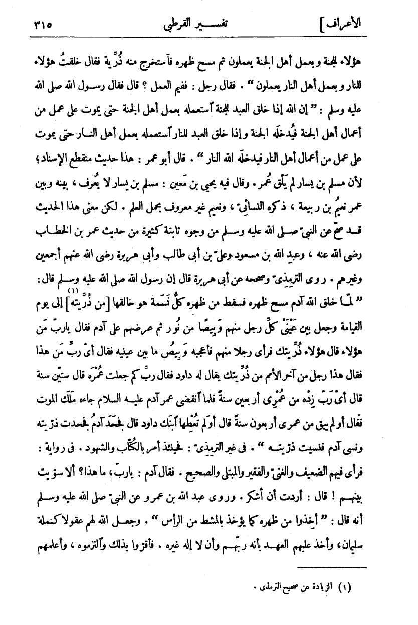 هؤلاء للجنة وبعمل أهل الجنة يعلمون ثُمَّ مَسَحَ ظَهْرَهُ فَاسْتَخْرَجَ مِنْهُ ذُرِّيَّةً فَقَالَ خَلَقْتُ هَؤُلَاءِ لِلنَّارِ وَبِعَمَلِ أَهْلِ النَّارِ يَعْمَلُونَ". فَقَالَ رَجُلٌ: فَفِيمَ الْعَمَلُ؟ قَالَ فَقَالَ رَسُولُ اللَّهِ صَلَّى اللَّهُ عَلَيْهِ وَسَلَّمَ:" إِنَّ اللَّهَ إِذَا خَلَقَ الْعَبْدَ لِلْجَنَّةِ اسْتَعْمَلَهُ بِعَمَلِ أَهْلِ الْجَنَّةِ حَتَّى يَمُوتَ عَلَى عَمَلٍ مِنْ أَعْمَالِ أَهْلِ الْجَنَّةِ فَيُدْخِلُهُ الْجَنَّةَ وَإِذَا خَلَقَ الْعَبْدَ لِلنَّارِ اسْتَعْمَلَهُ بِعَمَلِ أَهْلِ النَّارِ حَتَّى يَمُوتَ عَلَى عَمَلٍ مِنْ أَعْمَالِ أَهْلِ النَّارِ فَيُدْخِلُهُ اللَّهُ النَّارَ". قَالَ أَبُو عُمَرَ: هَذَا حَدِيثٌ مُنْقَطِعُ الْإِسْنَادِ، لِأَنَّ مُسْلِمَ بْنَ يَسَارٍ لَمْ يَلْقَ عُمَرَ. وَقَالَ فِيهِ يَحْيَى بْنُ مَعِينٍ: مُسْلِمُ بْنُ يَسَارٍ لَا «١» يُعْرَفُ، بَيْنَهُ وَبَيْنَ عُمَرَ نُعَيْمُ بْنُ رَبِيعَةَ، ذَكَرَهُ النَّسَائِيُّ، وَنُعَيْمٌ غَيْرُ مَعْرُوفٍ بِحَمْلِ الْعِلْمِ. لَكِنَّ مَعْنَى هَذَا الْحَدِيثِ قَدْ صَحَّ عَنِ النَّبِيِّ صَلَّى اللَّهُ عَلَيْهِ وَسَلَّمَ مِنْ وُجُوهٍ ثَابِتَةٍ كَثِيرَةٍ مِنْ حَدِيثِ عُمَرَ بْنِ الْخَطَّابِ رَضِيَ اللَّهُ عَنْهُ، وَعَبْدِ اللَّهِ بْنِ مَسْعُودٍ وَعَلِيِّ بْنِ أَبِي طَالِبٍ وَأَبِي هُرَيْرَةَ رَضِيَ اللَّهُ عَنْهُمْ أَجْمَعِينَ وَغَيْرِهِمْ. رَوَى التِّرْمِذِيُّ وَصَحَّحَهُ عَنْ أَبِي هُرَيْرَةَ قَالَ: إِنَّ رَسُولَ اللَّهِ صَلَّى اللَّهُ عَلَيْهِ وَسَلَّمَ قَالَ:" لَمَّا خَلَقَ اللَّهُ آدَمَ مَسَحَ ظَهْرَهُ فَسَقَطَ مِنْ ظَهْرِهِ كُلُّ نَسَمَةٍ هُوَ خَالِقُهَا (مِنْ ذُرِّيَّتِهِ «٢») إِلَى يَوْمِ الْقِيَامَةِ وَجَعَلَ بَيْنَ عَيْنَيْ كُلِّ رَجُلٍ مِنْهُمْ وَبِيصًا مِنْ نُورٍ ثُمَّ عَرَضَهُمْ عَلَى آدَمَ فَقَالَ يَا رَبِّ مَنْ هَؤُلَاءِ قَالَ هَؤُلَاءِ ذُرِّيَّتُكَ فَرَأَى رَجُلًا مِنْهُمْ فَأَعْجَبَهُ وَبِيصُ مَا بَيْنَ عَيْنَيْهِ فَقَالَ أَيْ رَبِّ مَنْ هَذَا؟ فَقَالَ هَذَا رَجُلٌ مِنْ آخِرِ الْأُمَمِ مِنْ ذُرِّيَّتِكَ يُقَالُ لَهُ دَاوُدُ فَقَالَ رَبِّ كَمْ جَعَلْتَ عُمْرَهُ قَالَ سِتِّينَ سَنَةً قَالَ أَيْ رَبِّ زِدْهُ مِنْ عُمْرِي أَرْبَعِينَ سَنَةً فَلَمَّا انْقَضَى عُمُرُ آدَمَ عَلَيْهِ السَّلَامُ جَاءَهُ مَلَكُ الْمَوْتِ فَقَالَ أو لم يبق من عمري أربعون سنة قال أو لم تُعْطِهَا ابْنكَ دَاوُدَ قَالَ فَجَحَدَ آدَمُ فَجَحَدَتْ ذُرِّيَّتَهُ وَنَسِيَ آدَمُ فَنَسِيَتْ ذُرِّيَّتُهُ". فِي غَيْرِ التِّرْمِذِيِّ: فَحِينَئِذٍ أُمِرَ بِالْكِتَابِ وَالشُّهُودِ. فِي رِوَايَةٍ: فرأى فيهم الضعف وَالْغَنِيَّ وَالْفَقِيرَ (وَالذَّلِيلَ «٣») وَالْمُبْتَلَى وَالصَّحِيحَ. فَقَالَ (لَهُ «٤») آدَمُ: يَا رَبِّ، مَا هَذَا؟ أَلَا سَوَّيْتَ بَيْنَهُمْ! قَالَ: أَرَدْتُ أَنْ أُشْكَرَ. وَرَوَى عَبْدِ اللَّهِ بْنِ عَمْرٍو عَنِ النَّبِيِّ صَلَّى اللَّهُ عَلَيْهِ وَسَلَّمَ أَنَّهُ قَالَ" أُخِذُوا مِنْ ظَهْرِهِ كَمَا يُؤْخَذُ بِالْمُشْطِ مِنَ الرَّأْسِ". وَجَعَلَ اللَّهُ لَهُمْ عُقُولًا كَنَمْلَةِ سُلَيْمَانَ، وَأَخَذَ عَلَيْهِمُ الْعَهْدَ بِأَنَّهُ رَبُّهُمْ وَأَنْ لَا إِلَهَ غَيْرُهُ. فَأَقَرُّوا بذلك والتزموه، وأعلمهم