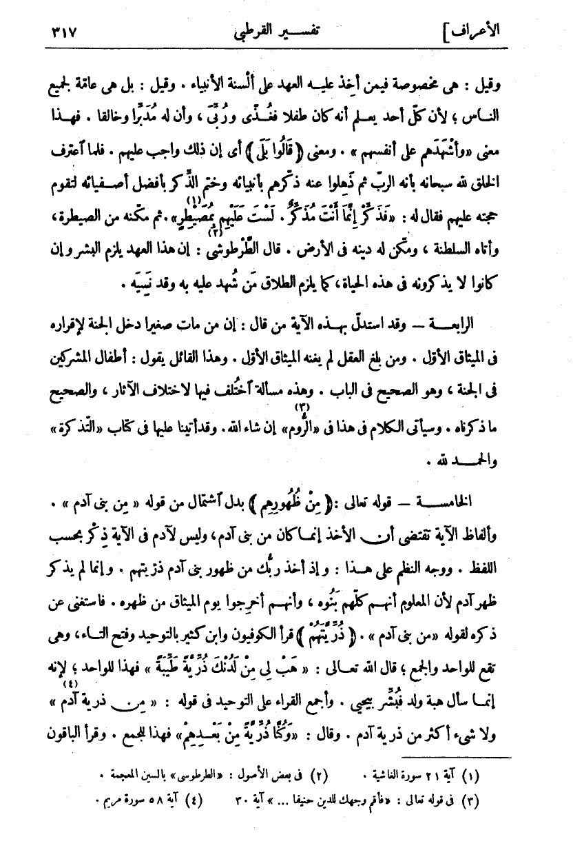 وَقِيلَ: هِيَ مَخْصُوصَةٌ فِيمَنْ أُخِذَ عَلَيْهِ الْعَهْدُ عَلَى أَلْسِنَةِ الْأَنْبِيَاءِ. وَقِيلَ: بَلْ هِيَ عَامَّةٌ لِجَمِيعِ النَّاسِ، لِأَنَّ كُلَّ أَحَدٍ يَعْلَمُ أَنَّهُ كَانَ طِفْلًا فَغُذِّيَ وَرُبِّيَ، وَأَنَّ لَهُ مُدَبِّرًا وَخَالِقًا. فَهَذَا مَعْنَى" وَأَشْهَدَهُمْ عَلى أَنْفُسِهِمْ". وَمَعْنَى (قالُوا بَلى) ٣٠ أَيْ إِنَّ ذَلِكَ وَاجِبٌ عَلَيْهِمْ. فَلَمَّا اعْتَرَفَ الْخَلْقُ لِلَّهِ سُبْحَانَهُ بِأَنَّهُ الرَّبُّ ثُمَّ ذَهَلُوا عَنْهُ ذَكَّرَهُمْ بِأَنْبِيَائِهِ وَخَتَمَ الذِّكْرَ بِأَفْضَلِ أَصْفِيَائِهِ لِتَقُومَ حُجَّتُهُ عَلَيْهِمْ فَقَالَ لَهُ:" فَذَكِّرْ إِنَّما أَنْتَ مُذَكِّرٌ. لَسْتَ عَلَيْهِمْ بِمُصَيْطِرٍ»