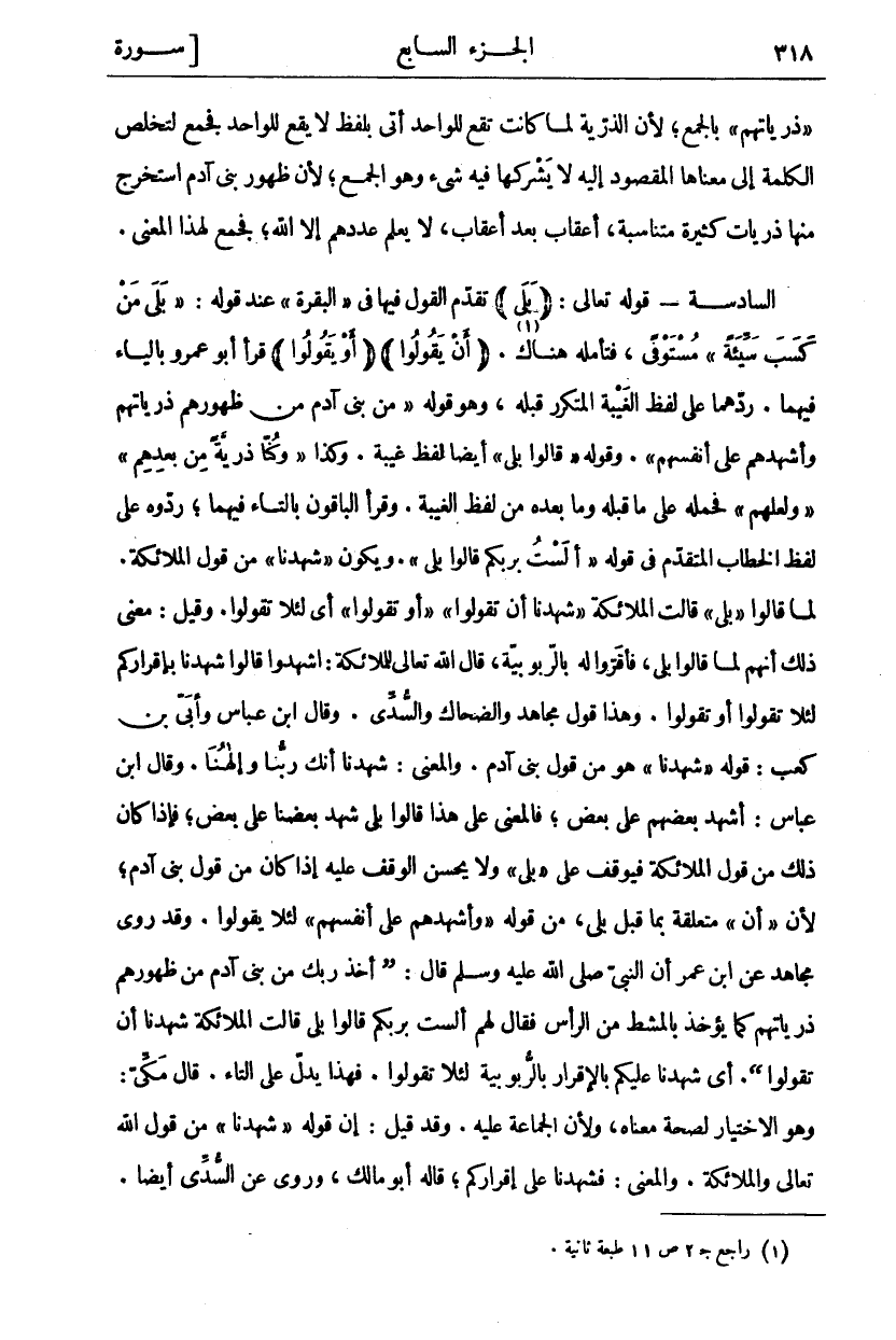 " ذُرِّيَّاتهمْ" بِالْجَمْعِ، لِأَنَّ الذُّرِّيَّةَ لَمَّا كَانَتْ تَقَعُ لِلْوَاحِدِ أَتَى بِلَفْظٍ لَا يَقَعُ لِلْوَاحِدِ فَجَمَعَ لِتَخْلُصَ الْكَلِمَةُ إِلَى مَعْنَاهَا الْمَقْصُودِ إِلَيْهِ لَا يشركها فيه شي وَهُوَ الْجَمْعُ، لِأَنَّ ظُهُورَ بَنِي آدَمَ اسْتُخْرِجَ مِنْهَا ذُرِّيَّاتٌ كَثِيرَةٌ مُتَنَاسِبَةٌ، أَعْقَابٌ بَعْدَ أَعْقَابٍ، لَا يَعْلَمُ عَدَدَهُمْ إِلَّا اللَّهُ، فَجَمَعَ لِهَذَا الْمَعْنَى. السَّادِسَةُ- قَوْلُهُ تَعَالَى: (بَلى) تَقَدَّمَ الْقَوْلُ فِيهَا فِي" الْبَقَرَةِ" عِنْدَ قَوْلِهِ بَلَى مِنْ كسب سيئة مستوفى، فتأمله هناك «١». (أن يقولوا) " أو يقولوا" قَرَأَ أَبُو عَمْرٍو بِالْيَاءِ فِيهِمَا. رَدَّهُمَا عَلَى لفظ الغيبة المتكرر قبله، وهو قول:" مِنْ بَنِي آدَمَ مِنْ ظُهُورِهِمْ ذُرِّيَّتَهُمْ وَأَشْهَدَهُمْ عَلى أَنْفُسِهِمْ". وَقَوْلُهُ:" قالُوا بَلى ٣٠" أَيْضًا لَفْظُ غَيْبَةٍ. وَكَذَا" وَكُنَّا ذُرِّيَّةً مِنْ بَعْدِهِمْ"" وَلَعَلَّهُمْ" فَحَمَلَهُ عَلَى مَا قَبْلَهُ وَمَا بَعْدَهُ مِنْ لَفْظِ الْغَيْبَةِ. وَقَرَأَ الْبَاقُونَ بِالتَّاءِ فِيهِمَا، رَدُّوهُ عَلَى لَفْظِ الْخِطَابِ الْمُتَقَدِّمِ فِي قَوْلِهِ:" أَلَسْتُ بِرَبِّكُمْ قالُوا بَلى ". وَيَكُونُ" شَهِدْنا ١٣٠" مِنْ قَوْلِ الْمَلَائِكَةِ. لَمَّا قَالُوا" بَلى " قَالَتِ الْمَلَائِكَةُ:" شَهِدْنا أَنْ تَقُولُوا"" أَوْ تَقُولُوا" أَيْ لِئَلَّا تَقُولُوا. وَقِيلَ: مَعْنَى ذَلِكَ أَنَّهُمْ لَمَّا قَالُوا بَلَى، فَأَقَرُّوا لَهُ بِالرُّبُوبِيَّةِ، قَالَ اللَّهُ تَعَالَى لِلْمَلَائِكَةِ: اشْهَدُوا قَالُوا شَهِدْنَا بِإِقْرَارِكُمْ لِئَلَّا تَقُولُوا أَوْ تَقُولُوا. وَهَذَا قَوْلُ مُجَاهِدٍ وَالضَّحَّاكِ وَالسُّدِّيِّ. وَقَالَ ابْنُ عَبَّاسٍ وَأُبَيُّ بْنُ كَعْبٍ: قَوْلُهُ" شَهِدْنا ١٣٠" هُوَ مِنْ قَوْلِ بَنِي آدَمَ، وَالْمَعْنَى: شَهِدْنَا أَنَّكَ رَبُّنَا وَإِلَهُنَا، وَقَالَ ابْنُ عَبَّاسٍ: أَشْهَدَ بَعْضَهُمْ عَلَى بَعْضٍ، فَالْمَعْنَى عَلَى هَذَا قَالُوا بَلَى شَهِدَ بَعْضُنَا عَلَى بَعْضٍ، فَإِذَا كَانَ ذَلِكَ مِنْ قَوْلِ الْمَلَائِكَةِ فَيُوقَفُ عَلَى" بَلَى" وَلَا يَحْسُنُ الْوَقْفُ عَلَيْهِ إِذَا كَانَ مِنْ قَوْلِ بَنِي آدَمَ، لِأَنَّ" أَنْ" مُتَعَلِّقَةٌ بِمَا قَبْلَ بَلَى، مِنْ قَوْلِهِ:" وَأَشْهَدَهُمْ عَلى أَنْفُسِهِمْ" لِئَلَّا يَقُولُوا. وَقَدْ رَوَى مُجَاهِدٌ «٢» عَنِ ابْنِ عُمَرَ أَنَّ النَّبِيَّ صَلَّى اللَّهُ عَلَيْهِ وَسَلَّمَ قَالَ: (أَخَذَ رَبُّكَ مِنْ بَنِي آدَمَ مِنْ ظُهُورِهِمْ ذُرِّيَّتَهُمْ كَمَا يُؤْخَذُ بِالْمُشْطِ مِنَ الرَّأْسِ فَقَالَ لَهُمْ أَلَسْتُ بِرَبِّكُمْ قَالُوا بَلَى قَالَتِ الْمَلَائِكَةُ شَهِدْنَا أَنْ تَقُولُوا". أَيْ شَهِدْنَا عَلَيْكُمْ بِالْإِقْرَارِ بِالرُّبُوبِيَّةِ لِئَلَّا تَقُولُوا. فَهَذَا يَدُلُّ عَلَى التَّاءِ. قَالَ مَكِّيٌّ: وَهُوَ الِاخْتِيَارُ لِصِحَّةِ مَعْنَاهُ، وَلِأَنَّ الْجَمَاعَةَ عَلَيْهِ. وَقَدْ قِيلَ: إِنَّ قَوْلَهُ" شَهِدْنَا" مِنْ قَوْلِ اللَّهِ تَعَالَى وَالْمَلَائِكَةِ. وَالْمَعْنَى: فَشَهِدْنَا عَلَى إِقْرَارِكُمْ، قَالَهُ أَبُو مَالِكٍ، وَرُوِيَ عَنِ السُّدِّيِّ أيضا.
