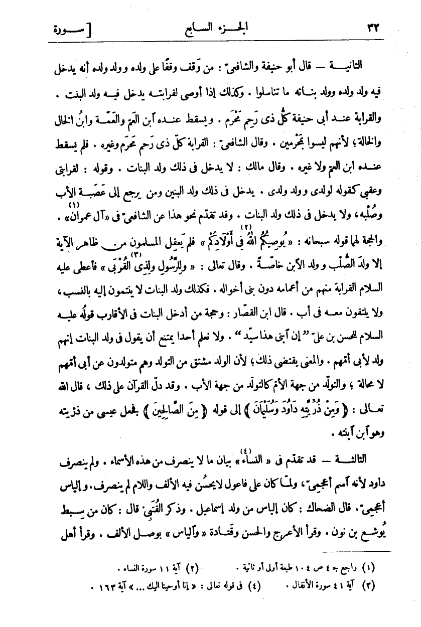 الثَّانِيَةُ- قَالَ أَبُو حَنِيفَةَ وَالشَّافِعِيُّ: مَنْ وَقَفَ وَقْفًا عَلَى وَلَدِهِ وَوَلَدِ وَلَدِهِ أَنَّهُ يَدْخُلُ فِيهِ وَلَدُ وَلَدِهِ وَوَلَدُ بَنَاتِهِ مَا تَنَاسَلُوا. وَكَذَلِكَ إِذَا أَوْصَى لِقَرَابَتِهِ يَدْخُلُ فِيهِ وَلَدُ الْبَنَاتِ. وَالْقَرَابَةُ عِنْدَ أَبِي حَنِيفَةَ كُلُّ ذِي رَحِمٍ مُحَرَّمٍ. وَيَسْقُطُ عِنْدَهُ ابْنُ الْعَمِّ وَالْعَمَّةِ وَابْنُ الْخَالِ وَالْخَالَةِ، لِأَنَّهُمْ لَيْسُوا بِمُحَرَّمِينَ. وَقَالَ الشَّافِعِيُّ: الْقَرَابَةُ كُلُّ ذِي رَحِمٍ مُحَرَّمٍ وَغَيْرُهُ. فَلَمْ يَسْقُطْ عِنْدَهُ ابْنُ الْعَمِّ «١» وَلَا غَيْرُهُ. وَقَالَ مَالِكٌ: لَا يَدْخُلُ فِي ذَلِكَ وَلَدُ البنات. وقول: لقرابتي وعقبي كقول: لِوَلَدِي وَوَلَدِ وَلَدِي. يَدْخُلُ فِي ذَلِكَ وَلَدُ الْبَنِينَ وَمَنْ يَرْجِعُ إِلَى عَصَبَةِ الْأَبِ وَصُلْبِهِ، وَلَا يَدْخُلُ فِي ذَلِكَ وَلَدُ الْبَنَاتِ. وَقَدْ تَقَدَّمَ نَحْوُ هَذَا عَنِ الشَّافِعِيِّ فِي" آلَ عِمْرانَ «٢» ". والحجة لهما قول سُبْحَانَهُ:" يُوصِيكُمُ اللَّهُ «٣» فِي أَوْلادِكُمْ" فَلَمْ يَعْقِلِ الْمُسْلِمُونَ مِنْ ظَاهِرِ الْآيَةِ إِلَّا وَلَدَ الصُّلْبِ وَوَلَدَ الِابْنِ خَاصَّةً. وَقَالَ تَعَالَى:" وَلِلرَّسُولِ وَلِذِي «٤» الْقُرْبى " فَأَعْطَى عَلَيْهِ السَّلَامُ الْقَرَابَةَ مِنْهُمْ مِنْ أَعْمَامِهِ دُونَ بَنِي أَخْوَالِهِ. فَكَذَلِكَ وَلَدُ الْبَنَاتِ لَا يَنْتَمُونَ إِلَيْهِ بِالنَّسَبِ، وَلَا يَلْتَقُونَ مَعَهُ فِي أَبٍ. قَالَ ابْنُ الْقَصَّارِ: وَحُجَّةُ مَنْ أَدْخَلَ الْبَنَاتِ فِي الْأَقَارِبِ قَوْلُهُ عَلَيْهِ السَّلَامُ لِلْحَسَنِ بْنِ عَلِيٍّ" إِنَّ ابْنِي هَذَا سَيِّدٌ". وَلَا نَعْلَمُ أَحَدًا يَمْتَنِعُ أَنْ يَقُولَ فِي وَلَدِ الْبَنَاتِ إِنَّهُمْ وَلَدٌ لِأَبِي أُمِّهِمْ. وَالْمَعْنَى يَقْتَضِي ذَلِكَ، لِأَنَّ الْوَلَدَ مُشْتَقٌّ مِنَ التَّوَلُّدِ وَهُمْ مُتَوَلِّدُونَ عَنْ أَبِي أُمِّهِمْ لَا مَحَالَةَ، وَالتَّوَلُّدَ مِنْ جِهَةِ الْأُمِّ كَالتَّوَلُّدِ مِنْ جِهَةِ الْأَبِ. وَقَدْ دَلَّ الْقُرْآنُ عَلَى ذَلِكَ، قَالَ اللَّهُ تَعَالَى: (وَمِنْ ذُرِّيَّتِهِ داوُدَ وَسُلَيْمانَ) إِلَى قول (مِنَ الصَّالِحِينَ) فَجَعَلَ عِيسَى مِنْ ذُرِّيَّتِهِ وَهُوَ ابْنُ ابْنَتِهِ. الثَّالِثَةُ- قَدْ تَقَدَّمَ فِي النِّسَاءِ «٥» بَيَانُ مَا لَا يَنْصَرِفُ مِنْ هْذِهِ الْأَسْمَاءِ. وَلَمْ يَنْصَرِفْ دَاوُدُ لِأَنَّهُ اسْمٌ أَعْجَمِيٌّ، وَلَمَّا كَانَ عَلَى فَاعُولٍ لَا يَحْسُنُ فِيهِ الْأَلِفُ وَاللَّامُ لَمْ يَنْصَرِفْ. وَإِلْيَاسُ أَعْجَمِيٌّ. قَالَ الضَّحَّاكُ: كَانَ إِلْيَاسُ مِنْ وَلَدِ إِسْمَاعِيلَ. وَذَكَرَ الْقُتَبِيُّ قَالَ: كَانَ مِنْ سِبْطِ يُوشَعَ بْنِ نُونٍ. وَقَرَأَ الْأَعْرَجُ وَالْحَسَنُ وَقَتَادَةُ" وَالِيَاسَ" بِوَصْلِ الْأَلِفِ. وَقَرَأَ أَهْلُ الْحَرَمَيْنِ وَأَبُو عَمْرٍو وَعَاصِمٌ" وَالْيَسَعَ" بِلَامٍ مُخَفَّفَةٍ. وَقَرَأَ الْكُوفِيُّونَ إِلَّا عَاصِمًا" وَاللَّيْسَعَ".