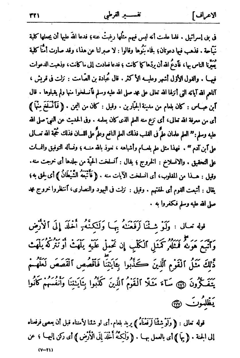 وَلَوْ شِئْنا لَرَفَعْناهُ بِها وَلكِنَّهُ أَخْلَدَ إِلَى الْأَرْضِ وَاتَّبَعَ هَواهُ فَمَثَلُهُ كَمَثَلِ الْكَلْبِ إِنْ تَحْمِلْ عَلَيْهِ يَلْهَثْ أَوْ تَتْرُكْهُ يَلْهَثْ ذلِكَ مَثَلُ الْقَوْمِ الَّذِينَ كَذَّبُوا بِآياتِنا فَاقْصُصِ الْقَصَصَ لَعَلَّهُمْ يَتَفَكَّرُونَ (١٧٦) ساءَ مَثَلاً الْقَوْمُ الَّذِينَ كَذَّبُوا بِآياتِنا وَأَنْفُسَهُمْ كانُوا يَظْلِمُونَ (١٧٧)