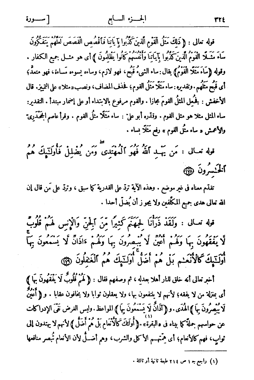 أَخْبَرَ تَعَالَى أَنَّهُ خَلَقَ لِلنَّارِ أَهْلًا بِعَدْلِهِ. ثُمَّ وَصَفَهُمْ فَقَالَ:" لَهُمْ قُلُوبٌ لَا يَفْقَهُونَ بِها" بِمَنْزِلَةِ مَنْ لَا يَفْقَهُ، لِأَنَّهُمْ لَا يَنْتَفِعُونَ بِهَا، وَلَا يَعْقِلُونَ ثَوَابًا وَلَا يَخَافُونَ عقابا. (أَعْيُنٌ لا يُبْصِرُونَ) بها الهدى. (وَلَهُمْ آذانٌ لَا يَسْمَعُونَ بِها) الْمَوَاعِظَ. وَلَيْسَ الْغَرَضُ نَفْيَ الْإِدْرَاكَاتِ عَنْ حَوَاسِّهِمْ جُمْلَةً. كَمَا بَيَّنَاهُ فِي (الْبَقَرَةِ «١»). (أُولئِكَ كَالْأَنْعامِ بَلْ هُمْ أَضَلُّ) لِأَنَّهُمْ لَا يَهْتَدُونَ إِلَى ثَوَابٍ، فَهُمْ كَالْأَنْعَامِ، أَيْ هِمَّتُهُمُ الْأَكْلُ وَالشُّرْبُ، وَهُمْ أَضَلُّ لِأَنَّ الْأَنْعَامَ تبصر منافعها