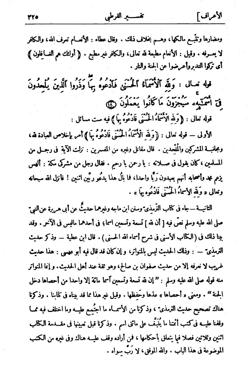 قوله تعالى: (وَلِلَّهِ الْأَسْماءُ الْحُسْنى فَادْعُوهُ بِها) ١٨٠ فيه ست مسائل: الأولى- قوله تعالى: (وَلِلَّهِ الْأَسْماءُ الْحُسْنى فَادْعُوهُ بِها) ١٨٠ أَمْرٌ بِإِخْلَاصِ الْعِبَادَةِ لِلَّهِ، وَمُجَانَبَةِ الْمُشْرِكِينَ وَالْمُلْحِدِينَ. قَالَ مُقَاتِلٌ وَغَيْرُهُ مِنَ الْمُفَسِّرِينَ: نَزَلَتِ الْآيَةُ فِي رَجُلٍ مِنَ الْمُسْلِمِينَ، كَانَ يَقُولُ فِي صلاته: يا رحمان يَا رَحِيمُ. فَقَالَ رَجُلٌ مِنْ مُشْرِكِي مَكَّةَ: أَلَيْسَ يَزْعُمُ مُحَمَّدٌ وَأَصْحَابُهُ أَنَّهُمْ يَعْبُدُونَ رَبًّا وَاحِدًا، فَمَا بَالُ هَذَا يَدْعُو رَبَّيْنِ اثْنَيْنِ؟ فَأَنْزَلَ اللَّهُ سُبْحَانَهُ وَتَعَالَى:" وَلِلَّهِ الْأَسْماءُ الْحُسْنى فَادْعُوهُ بِها ١٨٠". الثَّانِيَةُ- جَاءَ فِي كِتَابِ التِّرْمِذِيِّ وَسُنَنِ ابْنَ مَاجَهْ وَغَيْرِهِمَا حَدِيثٌ عَنْ أَبِي هُرَيْرَةَ عَنِ النَّبِيِّ صَلَّى اللَّهُ عَلَيْهِ وَسَلَّمَ نَصَ فِيهِ (إِنَّ لِلَّهِ) تِسْعَةً وَتِسْعِينَ اسْمًا، فِي أَحَدِهِمَا مَا لَيْسَ فِي الْآخَرِ. وَقَدْ بَيَّنَّا ذَلِكَ فِي (الْكِتَابِ الْأَسْنَى فِي شَرْحِ أَسْمَاءِ اللَّهِ الْحُسْنَى). قَالَ ابْنُ عَطِيَّةَ- وَذَكَرَ حَدِيثَ التِّرْمِذِيِّ- وَذَلِكَ الْحَدِيثُ لَيْسَ بِالْمُتَوَاتِرِ، وَإِنْ كَانَ قَدْ قَالَ فِيهِ أَبُو عِيسَى: هَذَا حَدِيثٌ غَرِيبٌ لَا نَعْرِفُهُ إِلَّا مِنْ حَدِيثِ صَفْوَانَ بْنِ صَالِحٍ، وَهُوَ ثِقَةٌ عِنْدَ أَهْلِ الْحَدِيثِ. وَإِنَّمَا الْمُتَوَاتِرُ مِنْهُ قَوْلُهُ صَلَّى اللَّهُ عَلَيْهِ وَسَلَّمَ:" إِنَّ لِلَّهِ تِسْعَةً وَتِسْعِينَ اسْمًا مِائَةً إِلَّا وَاحِدًا مَنْ أَحْصَاهَا دَخَلَ الْجَنَّةَ". وَمَعْنَى" أَحْصاها" عَدَّهَا وَحَفِظَهَا. وَقِيلَ غَيْرُ هَذَا مِمَّا بَيَّنَّاهُ فِي كِتَابِنَا. وَذَكَرْنَا هُنَاكَ تَصْحِيحَ حَدِيثِ التِّرْمِذِيِّ، وَذَكَرْنَا مِنَ الْأَسْمَاءِ مَا اجْتُمِعَ عَلَيْهِ وَمَا اخْتُلِفَ فِيهِ مِمَّا وَقَفْنَا عَلَيْهِ فِي كُتُبِ أَئِمَّتِنَا مَا يُنَيِّفُ عَلَى مِائَتَيِ اسْمٍ. وَذَكَرْنَا قَبْلَ تَعْيِينِهَا فِي مُقَدِّمَةِ الْكِتَابِ اثْنَيْنِ وَثَلَاثِينَ فَصْلًا فِيمَا يَتَعَلَّقُ بِأَحْكَامِهَا، فَمَنْ أَرَادَهُ وَقَفَ عَلَيْهِ هُنَاكَ وَفِي غَيْرِهِ مِنَ الْكُتُبِ الْمَوْضُوعَةِ فِي هَذَا الْبَابِ. وَاللَّهُ الْمُوَفِّقُ (للصواب «١»)، لا رب سواه.