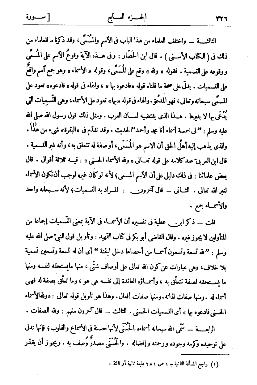 الثَّالِثَةُ- وَاخْتَلَفَ الْعُلَمَاءُ مِنْ هَذَا الْبَابِ فِي الِاسْمِ وَالْمُسَمَّى، وَقَدْ ذَكَرْنَا مَا لِلْعُلَمَاءِ مِنْ ذَلِكَ فِي" الْكِتَابِ الْأَسْنَى". قَالَ ابْنُ الْحَصَّارِ: وَفِي هَذِهِ الْآيَةِ وُقُوعُ الِاسْمِ عَلَى الْمُسَمَّى وَوُقُوعُهُ عَلَى التَّسْمِيَةِ. فَقَوْلُهُ:" وَلِلَّهِ" وَقَعَ عَلَى الْمُسَمَّى، وَقَوْلُهُ:" الْأَسْماءُ" وَهُوَ جَمْعُ اسْمٍ وَاقِعٌ عَلَى التَّسْمِيَاتِ. يَدُلُّ عَلَى صِحَّةِ مَا قُلْنَاهُ قَوْلُهُ:" فَادْعُوهُ بِها ١٨٠"، وَالْهَاءُ فِي قَوْلِهِ:" فَادْعُوهُ ١٨٠" تَعُودُ عَلَى الْمُسَمَّى سُبْحَانَهُ وَتَعَالَى، فَهُوَ الْمَدْعُوُّ. وَالْهَاءُ فِي قَوْلِهِ" بِها" تَعُودُ عَلَى الْأَسْمَاءِ، وهي التسميات التي يدعى بلا بِغَيْرِهَا. هَذَا الَّذِي يَقْتَضِيهِ لِسَانُ الْعَرَبِ. وَمِثْلُ ذَلِكَ قَوْلُ رَسُولِ اللَّهِ صَلَّى اللَّهُ عَلَيْهِ وَسَلَّمَ:" لِي خَمْسَةُ أَسْمَاءٍ أَنَا مُحَمَّدٌ وَأَحْمَدُ" الحديث. وقد تقدم في البقرة شي مِنْ هَذَا «١». وَالَّذِي يَذْهَبُ إِلَيْهِ أَهْلُ الْحَقِّ أَنَّ الِاسْمَ هُوَ الْمُسَمَّى، أَوْ صِفَةٌ لَهُ تَتَعَلَّقُ بِهِ، وَأَنَّهُ غَيْرُ التَّسْمِيَةِ. قَالَ ابْنُ الْعَرَبِيِّ عِنْدَ كَلَامِهِ عَلَى قَوْلِهِ تَعَالَى:" وَلِلَّهِ الْأَسْماءُ الْحُسْنى ١٨٠": فِيهِ ثَلَاثَةُ أَقْوَالٍ. قَالَ بَعْضُ عُلَمَائِنَا: فِي ذَلِكَ دَلِيلٌ عَلَى أَنَّ الِاسْمَ الْمُسَمَّى، لِأَنَّهُ لَوْ كَانَ غَيْرَهُ لَوَجَبَ أَنْ تَكُونَ الْأَسْمَاءُ لِغَيْرِ اللَّهِ تَعَالَى. الثَّانِي: قَالَ آخَرُونَ: الْمُرَادُ بِهِ التَّسْمِيَاتُ، لِأَنَّهُ سُبْحَانَهُ وَاحِدٌ وَالْأَسْمَاءُ جَمْعٌ. قُلْتُ- ذَكَرَ ابْنُ عَطِيَّةَ فِي تَفْسِيرِهِ أَنَّ الْأَسْمَاءَ فِي الْآيَةِ بِمَعْنَى التَّسْمِيَاتِ إِجْمَاعًا مِنَ الْمُتَأَوِّلِينَ لَا يَجُوزُ غَيْرُهُ. وَقَالَ الْقَاضِي أَبُو بَكْرٍ فِي كِتَابِ التَّمْهِيدِ: وَتَأْوِيلُ قَوْلِ النَّبِيِّ صَلَّى اللَّهُ عَلَيْهِ وَسَلَّمَ:" لِلَّهِ تِسْعَةٌ وَتِسْعُونَ اسْمًا مَنْ أَحْصَاهَا دَخَلَ الْجَنَّةَ" أَيْ أَنَّ لَهُ تِسْعَةً وَتِسْعِينَ تَسْمِيَةً بِلَا خِلَافٍ، وَهِيَ عِبَارَاتٌ عَنْ كَوْنِ اللَّهِ تَعَالَى عَلَى أَوْصَافٍ شَتَّى، مِنْهَا مَا يَسْتَحِقُّهُ لِنَفْسِهِ وَمِنْهَا مَا يَسْتَحِقُّهُ لِصِفَةٍ تَتَعَلَّقُ بِهِ، وَأَسْمَاؤُهُ الْعَائِدَةُ إِلَى نَفْسِهِ هِيَ هُوَ، وَمَا تَعَلَّقَ بِصِفَةٍ لَهُ فَهِيَ أَسْمَاءٌ لَهُ. وَمِنْهَا صِفَاتٌ لِذَاتِهِ. وَمِنْهَا صِفَاتُ أَفْعَالٍ. وَهَذَا هُوَ تَأْوِيلُ قوله تعالى:" وَلِلَّهِ الْأَسْماءُ الْحُسْنى فَادْعُوهُ بِها ١٨٠" أَيِ التَّسْمِيَاتُ الْحُسْنَى. الثَّالِثُ- قَالَ آخَرُونَ مِنْهُمْ: وَلِلَّهِ الصِّفَاتُ. الرَّابِعَةُ- سَمَّى اللَّهُ سُبْحَانَهُ أَسْمَاءَهُ بِالْحُسْنَى لِأَنَّهَا حَسَنَةٌ فِي الْأَسْمَاعِ وَالْقُلُوبِ، فَإِنَّهَا تَدُلُّ عَلَى تَوْحِيدِهِ وَكَرَمِهِ وَجُودِهِ وَرَحْمَتِهِ وَإِفْضَالِهِ. وَالْحُسْنَى مَصْدَرٌ وُصِفَ بِهِ. وَيَجُوزُ أَنْ يُقَدَّرَ