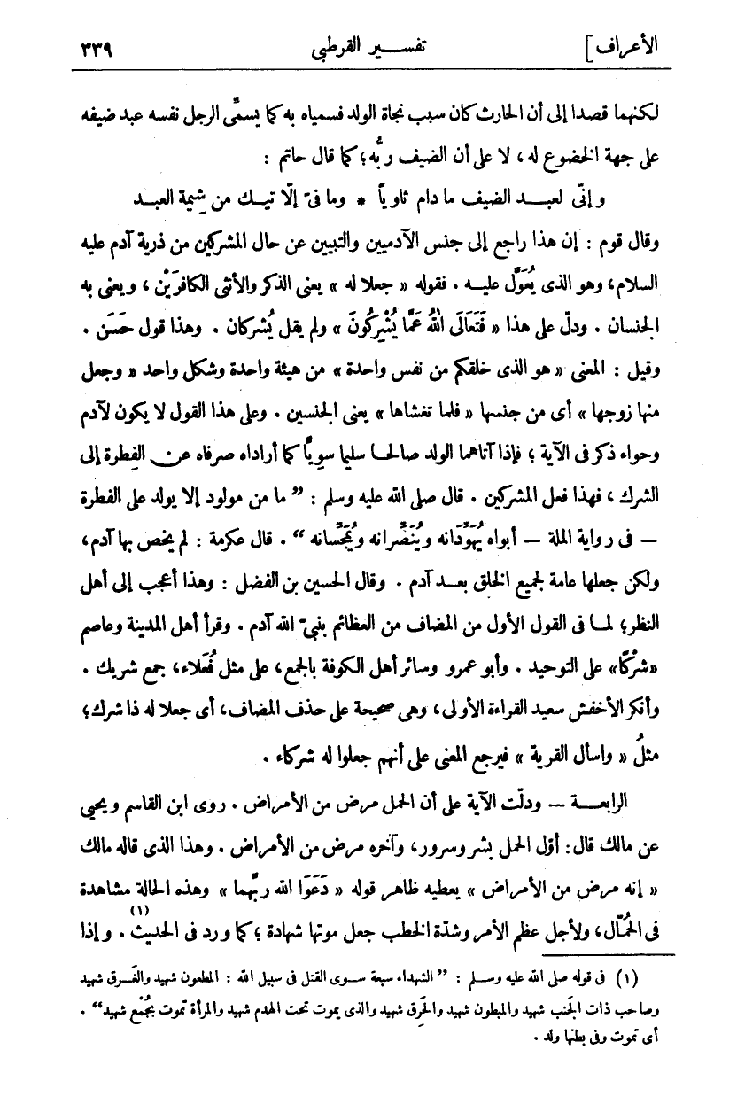 وَقَالَ قَوْمٌ: إِنَّ هَذَا رَاجِعٌ إِلَى جِنْسِ الْآدَمِيِّينَ وَالتَّبْيِينِ عَنْ حَالِ الْمُشْرِكِينَ مِنْ ذُرِّيَّةِ آدَمَ عَلَيْهِ السَّلَامُ، وَهُوَ الَّذِي يُعَوَّلُ عَلَيْهِ. فَقَوْلُهُ:" جَعَلا لَهُ ١٩٠" يَعْنِي الذَّكَرَ وَالْأُنْثَى الْكَافِرَيْنِ، ويعنى به الجنسان. وَدَلَّ عَلَى هَذَا (فَتَعَالَى اللَّهُ عَمَّا يُشْرِكُونَ) وَلَمْ يَقُلْ يُشْرِكَانِ. وَهَذَا قَوْلٌ حَسَنٌ. وَقِيلَ: الْمَعْنَى" هُوَ الَّذِي خَلَقَكُمْ مِنْ نَفْسٍ واحِدَةٍ" مِنْ هَيْئَةٍ وَاحِدَةٍ وَشَكْلٍ وَاحِدٍ" وَجَعَلَ مِنْها زَوْجَها" أَيْ مِنْ جِنْسِهَا" فَلَمَّا تَغَشَّاها" يَعْنِي الْجِنْسَيْنِ. وَعَلَى هَذَا الْقَوْلِ لَا يَكُونُ لِآدَمَ وَحَوَّاءَ ذِكْرٌ فِي الْآيَةِ، فَإِذَا آتَاهُمَا الْوَلَدَ صَالِحًا سَلِيمًا سَوِيًّا كَمَا أَرَادَاهُ صَرَفَاهُ عَنِ الْفِطْرَةِ إِلَى الشِّرْكِ، فَهَذَا فِعْلُ الْمُشْرِكِينَ. قَالَ صَلَّى اللَّهُ عَلَيْهِ وَسَلَّمَ" مَا مِنْ مَوْلُودٍ إِلَّا يُولَدُ عَلَى الْفِطْرَةِ- فِي رِوَايَةٍ (عَلَى هذه «١») الملة- أبواه يُهَوِّدَانِهِ وَيُنَصِّرَانِهِ وَيُمَجِّسَانِهِ". قَالَ عِكْرِمَةُ: لَمْ يَخُصَّ بِهَا آدَمَ، وَلَكِنْ جَعَلَهَا عَامَّةً لِجَمِيعِ الْخَلْقِ بَعْدَ آدَمَ. وَقَالَ الْحُسَيْنُ بْنُ الْفَضْلِ: وَهَذَا أَعْجَبُ إِلَى أَهْلِ النَّظَرِ، لِمَا فِي الْقَوْلِ الْأَوَّلِ مِنَ الْمُضَافِ مِنَ الْعَظَائِمِ بِنَبِيِّ اللَّهِ آدَمَ. وَقَرَأَ أَهْلُ الْمَدِينَةِ وَعَاصِمٌ" شِرْكًا" عَلَى التَّوْحِيدِ. وَأَبُو عَمْرٍو وَسَائِرُ أَهْلِ الْكُوفَةِ بِالْجَمْعِ، عَلَى مِثْلِ فُعَلَاءَ، جَمْعُ شَرِيكٍ. وَأَنْكَرَ الْأَخْفَشُ سَعِيدٌ الْقِرَاءَةَ الْأُولَى، وَهِيَ صَحِيحَةٌ عَلَى حَذْفِ الْمُضَافِ، أَيْ جَعَلَا لَهُ ذَا شِرْكٍ، مِثْلَ" وَسْئَلِ الْقَرْيَةَ" فَيَرْجِعُ الْمَعْنَى إِلَى أَنَّهُمْ جَعَلُوا لَهُ شُرَكَاءَ. الرَّابِعَةُ- وَدَلَّتِ الْآيَةُ عَلَى أَنَّ الْحَمْلَ مَرَضٌ مِنَ الْأَمْرَاضِ. رَوَى ابْنُ الْقَاسِمِ وَيَحْيَى عَنْ مَالِكٍ قَالَ: أَوَّلُ الْحَمْلِ يُسْرٌ»
