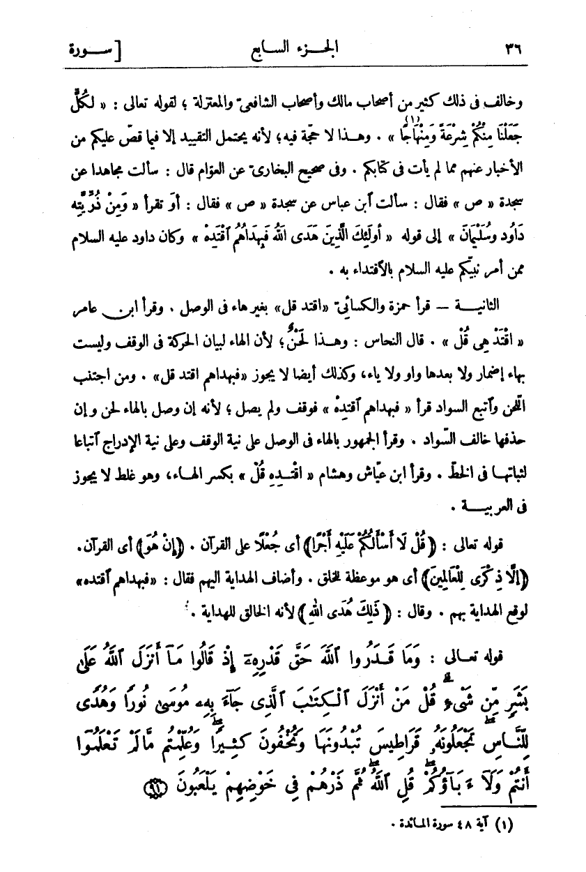 وَخَالَفَ فِي ذَلِكَ كَثِيرٌ مِنْ أَصْحَابِ مَالِكٍ وأصحاب الشافعي والمعتزلة، لقول تَعَالَى:" لِكُلٍّ جَعَلْنا مِنْكُمْ شِرْعَةً وَمِنْهاجاً «١» ". وَهَذَا لَا حُجَّةَ فِيهِ، لِأَنَّهُ يَحْتَمِلُ التَّقْيِيدَ: إِلَّا فِيمَا قُصَّ عَلَيْكُمْ مِنَ الْأَخْبَارِ عَنْهُمْ مِمَّا لم يأت من كِتَابِكُمْ. وَفِي صَحِيحِ الْبُخَارِيِّ عَنِ الْعَوَّامِ قَالَ: سَأَلْتُ مُجَاهِدًا عَنْ سَجْدَةِ" ص" فَقَالَ: سَأَلْتُ ابن عباس عن سجدة" ص" فقال: أو تقرأ" وَمِنْ ذُرِّيَّتِهِ داوُدَ وَسُلَيْمانَ" إِلَى قَوْلِهِ" أُولئِكَ الَّذِينَ هَدَى اللَّهُ فَبِهُداهُمُ اقْتَدِهْ"؟ وَكَانَ دَاوُدُ عَلَيْهِ السَّلَامُ مِمَّنْ أُمِرَ نَبِيُّكُمْ صَلَّى اللَّهُ عَلَيْهِ وَسَلَّمَ بِالِاقْتِدَاءِ بِهِ. الثَّانِيَةُ- قَرَأَ حَمْزَةُ وَالْكِسَائِيُّ" اقْتَدِ قُلْ" بِغَيْرِ هَاءٍ فِي الْوَصْلِ. وقرا ابن عامر" اقتد هي قُلْ". قَالَ النَّحَّاسُ: وَهَذَا لَحْنٌ، لِأَنَّ الْهَاءَ لِبَيَانِ الْحَرَكَةِ فِي الْوَقْفِ وَلَيْسَتْ بِهَاءِ إِضْمَارٍ وَلَا بَعْدَهَا وَاوٌ وَلَا يَاءٌ، وَكَذَلِكَ أَيْضًا لا يجوز" فَبِهُداهُمُ اقْتَدِهْ قُلْ". وَمَنِ اجْتَنَبَ اللَّحْنَ وَاتَّبَعَ السَّوَادَ قَرَأَ" فَبِهُدَاهُمُ اقْتَدِهْ" فَوَقَفَ وَلَمْ يَصِلْ، لِأَنَّهُ إِنْ وَصَلَ بِالْهَاءِ لَحَنَ وَإِنْ حَذَفَهَا خَالَفَ السَّوَادَ. وَقَرَأَ الْجُمْهُورُ بِالْهَاءِ فِي الْوَصْلِ عَلَى نِيَّةِ الْوَقْفِ وَعَلَى نِيَّةِ الْإِدْرَاجِ اتِّبَاعًا لِثَبَاتِهَا فِي الْخَطِّ. وَقَرَأَ ابْنُ عَيَّاشٍ وَهِشَامٌ" اقْتَدِهِ قُلْ" بِكَسْرِ الْهَاءِ، وَهُوَ غَلَطٌ لَا يَجُوزُ فِي العربية. قوله تعالى: (قُلْ لا أَسْئَلُكُمْ عَلَيْهِ أَجْراً) أَيْ جُعْلًا عَلَى الْقُرْآنِ. (إِنْ هُوَ) أَيِ الْقُرْآنُ. (إِلَّا ذِكْرى لِلْعالَمِينَ) أَيْ هُوَ مَوْعِظَةٌ لِلْخَلْقِ. وَأَضَافَ الْهِدَايَةَ إِلَيْهِمْ فَقَالَ:" فَبِهُداهُمُ اقْتَدِهْ" لِوُقُوعِ الْهِدَايَةِ بِهِمْ. وَقَالَ:" ذلِكَ هُدَى اللَّهِ" لأنه الخالق للهداية.