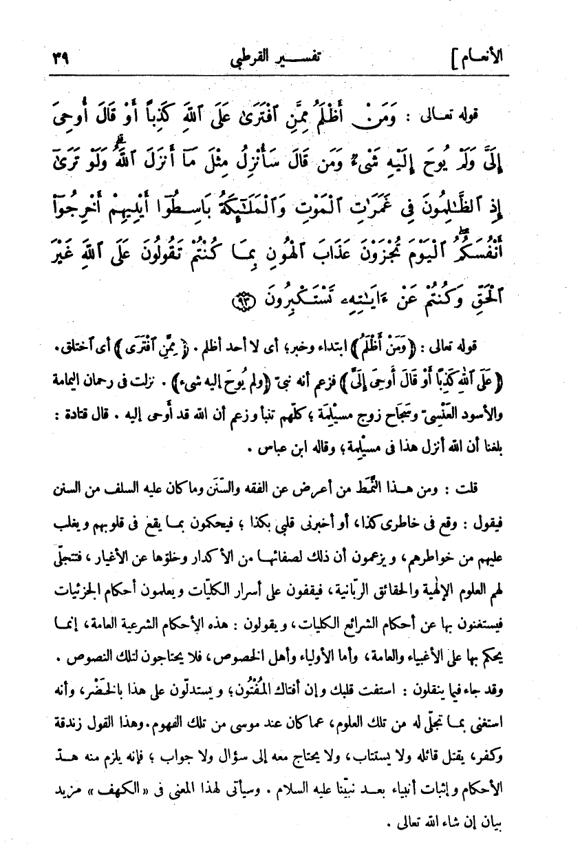 قَوْلُهُ تَعَالَى: (وَمَنْ أَظْلَمُ) ابْتِدَاءٌ وَخَبَرٌ، أَيْ لَا أَحَدَ أَظْلَمُ. (مِمَّنِ افْتَرى) أَيِ اخْتَلَقَ. (عَلَى اللَّهِ كَذِباً أَوْ قالَ أُوحِيَ إِلَيَّ) فَزَعَمَ أَنَّهُ نَبِيٌّ (وَلَمْ يُوحَ إِلَيْهِ شَيْءٌ) نَزَلَتْ فِي رَحْمَانِ الْيَمَامَةِ وَالْأَسْوَدِ الْعَنْسِيِّ وَسَجَاحَ زَوْجِ مُسَيْلِمَةَ، كُلُّهُمْ تَنَبَّأَ وَزَعَمَ أَنَّ اللَّهَ قَدْ أَوْحَى إِلَيْهِ. قَالَ قَتَادَةُ: بَلَغَنَا أَنَّ اللَّهَ أَنْزَلَ هَذَا في مسيلمة، وقال ابْنُ عَبَّاسٍ. قُلْتُ: وَمِنْ هَذَا النَّمَطِ مَنْ أَعْرَضَ عَنِ الْفِقْهِ وَالسُّنَنِ وَمَا كَانَ عَلَيْهِ السَّلَفُ مِنَ السُّنَنِ فَيَقُولُ: وَقَعَ فِي خَاطِرِي كَذَا، أَوْ أَخْبَرَنِي قَلْبِي بِكَذَا، فَيَحْكُمُونَ بِمَا يَقَعُ فِي قُلُوبِهِمْ وَيَغْلِبُ عَلَيْهِمْ مِنْ خَوَاطِرِهِمْ، وَيَزْعُمُونَ أَنَّ ذَلِكَ لِصَفَائِهَا مِنَ الْأَكْدَارِ وَخُلُوِّهَا مِنَ الْأَغْيَارِ، فَتَتَجَلَّى لَهُمُ الْعُلُومُ الْإِلَهِيَّةُ وَالْحَقَائِقُ الرَّبَّانِيَّةُ، فَيَقِفُونَ عَلَى أَسْرَارِ الْكُلِّيَّاتِ وَيَعْلَمُونَ أَحْكَامَ الْجُزْئِيَّاتِ فَيَسْتَغْنُونَ بِهَا عَنْ أَحْكَامِ الشَّرَائِعِ الْكُلِّيَّاتِ، وَيَقُولُونَ: هَذِهِ الْأَحْكَامُ الشَّرْعِيَّةُ الْعَامَّةُ، إِنَّمَا يُحْكَمُ بِهَا عَلَى الْأَغْبِيَاءِ وَالْعَامَّةِ، وَأَمَّا الْأَوْلِيَاءُ وَأَهْلُ الْخُصُوصِ، فَلَا يَحْتَاجُونَ لِتِلْكَ النُّصُوصِ. وَقَدْ جَاءَ فِيمَا يَنْقُلُونَ: اسْتَفْتِ قَلْبَكَ وَإِنْ أَفْتَاكَ الْمُفْتُونَ «١»، وَيَسْتَدِلُّونَ عَلَى هَذَا بِالْخَضِرِ، وَأَنَّهُ اسْتَغْنَى بِمَا تَجَلَّى لَهُ مِنْ تِلْكَ الْعُلُومِ، عَمَّا كَانَ عِنْدَ مُوسَى مِنْ تِلْكَ الْفُهُومِ. وَهَذَا الْقَوْلُ زَنْدَقَةٌ وَكُفْرٌ، يُقْتَلُ قَائِلُهُ وَلَا يُسْتَتَابُ، وَلَا يَحْتَاجُ مَعَهُ إِلَى سُؤَالٍ وَلَا جَوَابٍ، فَإِنَّهُ يَلْزَمُ مِنْهُ هَدُّ الْأَحْكَامِ وَإِثْبَاتُ أَنْبِيَاءَ بَعْدَ نَبِيِّنَا صَلَّى اللَّهُ عَلَيْهِ وَسَلَّمَ. وَسَيَأْتِي لِهَذَا الْمَعْنَى فِي" الْكَهْفِ «٢» " مَزِيدُ بَيَانٍ إِنْ شَاءَ اللَّهُ تَعَالَى.