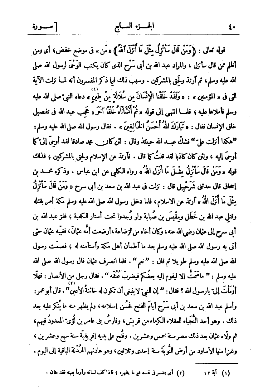 قَوْلُهُ تَعَالَى: (وَمَنْ قالَ سَأُنْزِلُ مِثْلَ مَا أَنْزَلَ اللَّهُ) " مَنْ" فِي مَوْضِعِ خَفْضٍ، أَيْ وَمَنْ أَظْلَمُ مِمَّنْ قَالَ سَأُنْزِلُ، وَالْمُرَادُ عَبْدُ اللَّهِ بْنُ أَبِي سَرْحٍ الَّذِي كَانَ يَكْتُبُ الْوَحْيَ لِرَسُولِ اللَّهِ صَلَّى اللَّهُ عَلَيْهِ وَسَلَّمَ، ثُمَّ ارْتَدَّ وَلَحِقَ بِالْمُشْرِكِينَ. وَسَبَبُ ذَلِكَ فِيمَا ذَكَرَ الْمُفَسِّرُونَ أَنَّهُ لَمَّا نَزَلَتِ الْآيَةُ الَّتِي فِي" الْمُؤْمِنُونَ":" وَلَقَدْ خَلَقْنَا الْإِنْسانَ مِنْ سُلالَةٍ مِنْ طِينٍ «١» " دَعَاهُ النَّبِيُّ صَلَّى اللَّهُ عَلَيْهِ وَسَلَّمَ فَأَمْلَاهَا عَلَيْهِ، فَلَمَّا انْتَهَى إِلَى قَوْلِهِ" ثُمَّ أَنْشَأْناهُ خَلْقاً آخَرَ" عَجِبَ عَبْدُ اللَّهِ فِي تَفْصِيلِ خَلْقِ الْإِنْسَانِ فَقَالَ:" فَتَبارَكَ اللَّهُ أَحْسَنُ الْخالِقِينَ". فَقَالَ رَسُولُ اللَّهِ صَلَّى اللَّهُ عَلَيْهِ وَسَلَّمَ: (وَهَكَذَا أُنْزِلَتْ عَلَيَّ) فَشَكَّ عَبْدُ اللَّهِ حِينَئِذٍ وَقَالَ: لَئِنْ كَانَ مُحَمَّدٌ صَادِقًا لقد أوحي إلى كما أوحى إليه ولين كَانَ كَاذِبًا لَقَدْ قُلْتُ كَمَا قَالَ. فَارْتَدَّ عَنِ الْإِسْلَامِ وَلَحِقَ بِالْمُشْرِكِينَ، فَذَلِكَ قَوْلُهُ:" وَمَنْ قالَ سَأُنْزِلُ مِثْلَ مَا أَنْزَلَ اللَّهُ" رَوَاهُ الْكَلْبِيُّ عَنِ ابْنِ عَبَّاسٍ. وَذَكَرَهُ مُحَمَّدُ بْنُ إِسْحَاقَ قَالَ حَدَّثَنِي شُرَحْبِيلُ قَالَ: نَزَلَتْ فِي عَبْدُ اللَّهِ بْنُ سَعْدِ بْنِ أَبِي سَرْحٍ" وَمَنْ قالَ سَأُنْزِلُ مِثْلَ مَا أَنْزَلَ اللَّهُ" ارْتَدَّ عَنِ الْإِسْلَامِ، فَلَمَّا دَخَلَ رَسُولُ اللَّهِ صَلَّى اللَّهُ عَلَيْهِ وَسَلَّمَ مَكَّةَ أَمَرَ بِقَتْلِهِ وَقَتْلِ عَبْدِ اللَّهِ بْنِ خَطَلٍ وَمَقِيسِ بْنِ صُبَابَةَ وَلَوْ وُجِدُوا تَحْتَ أَسْتَارِ الْكَعْبَةِ، فَفَرَّ عَبْدُ اللَّهِ بْنُ أَبِي سَرْحٍ إِلَى عُثْمَانَ رَضِيَ اللَّهُ عَنْهُ، وَكَانَ أَخَاهُ مِنَ الرَّضَاعَةِ، أَرْضَعَتْ أُمُّهُ عُثْمَانَ، فَغَيَّبَهُ عُثْمَانُ حَتَّى أَتَى بِهِ رَسُولُ اللَّهِ صَلَّى اللَّهُ عَلَيْهِ وَسَلَّمَ بَعْدَ مَا اطْمَأَنَّ أَهْلُ مَكَّةَ فَاسْتَأْمَنَهُ لَهُ، فَصَمَتَ رَسُولُ اللَّهِ صَلَّى اللَّهُ عَلَيْهِ وَسَلَّمَ طَوِيلًا ثُمَّ قَالَ: (نَعَمْ). فَلَمَّا انْصَرَفَ عُثْمَانُ قَالَ رَسُولُ اللَّهِ صَلَّى اللَّهُ عَلَيْهِ وَسَلَّمَ: (مَا صَمَتُّ إِلَّا لِيَقُومَ إِلَيْهِ بَعْضُكُمْ فَيَضْرِبَ عنقه). فقال رجل من الأنصار: فهلا أو مات إِلَيَّ يَا رَسُولَ اللَّهِ؟ فَقَالَ: (إِنَّ النَّبِيَّ لَا يَنْبَغِي أَنْ تَكُونَ لَهُ خَائِنَةُ الْأَعْيُنِ «٢». قَالَ أَبُو عُمَرَ: وَأَسْلَمَ عَبْدُ اللَّهِ بْنُ سَعْدِ بْنِ أَبِي سَرْحٍ أَيَّامَ الْفَتْحِ فَحَسُنَ إِسْلَامُهُ، وَلَمْ يَظْهَرْ مِنْهُ مَا يُنْكَرُ عَلَيْهِ بَعْدَ ذَلِكَ. وَهُوَ أَحَدُ النُّجَبَاءِ الْعُقَلَاءِ الْكُرَمَاءِ مِنْ قُرَيْشٍ، وَفَارِسُ بَنِي عَامِرِ بْنِ لُؤَيٍّ الْمَعْدُودُ فِيهِمْ، ثُمَّ وَلَّاهُ عُثْمَانُ بَعْدَ ذَلِكَ مِصْرَ سَنَةَ خَمْسٍ وَعِشْرِينَ. وَفُتِحَ عَلَى يَدَيْهِ إِفْرِيقِيَّةُ سَنَةَ سَبْعٍ وَعِشْرِينَ، وَغَزَا مِنْهَا الْأَسَاوِدَ مِنْ أَرْضِ النُّوبَةِ سَنَةَ إِحْدَى وَثَلَاثِينَ، وَهُوَ هادنهم الهدنة الباقية إلى اليوم.