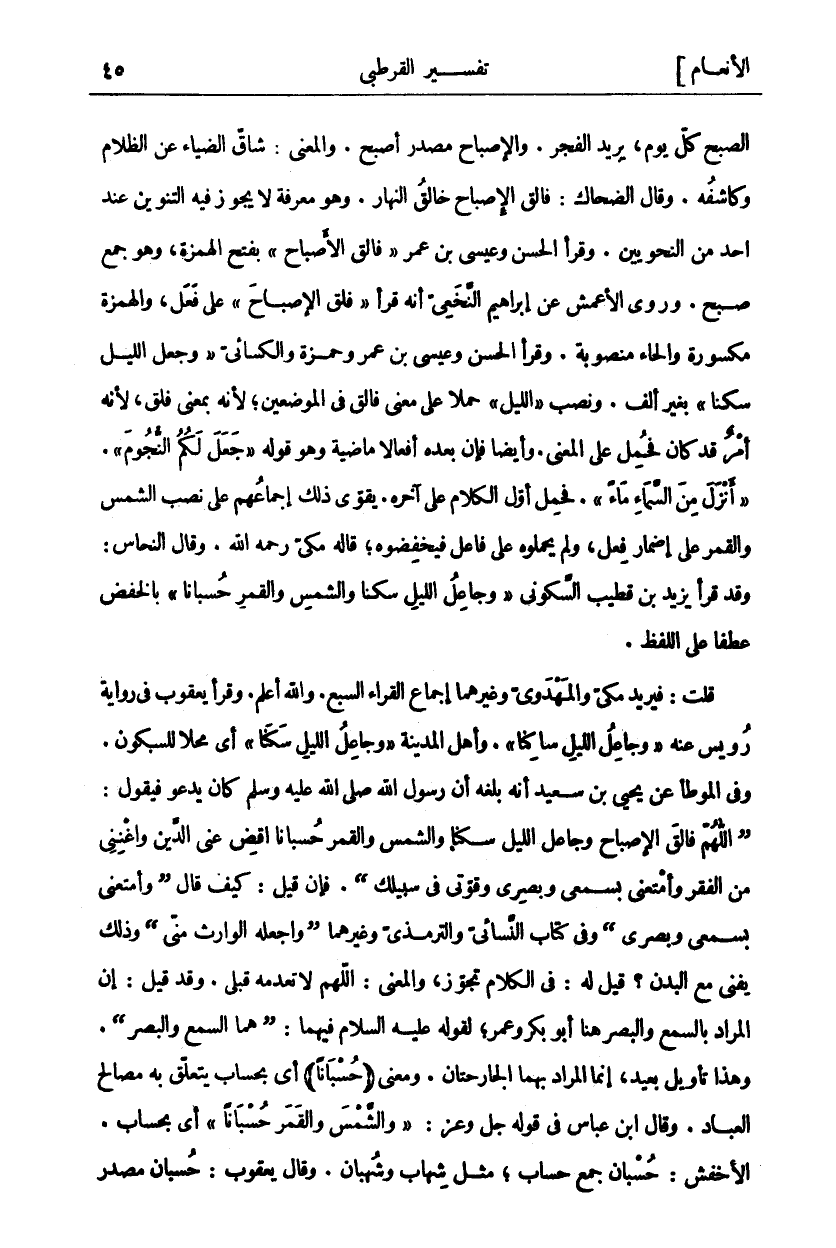فَالِقُ الصُّبْحِ كُلَّ يَوْمٍ، يُرِيدُ الْفَجْرَ. وَالْإِصْبَاحُ مَصْدَرُ أَصْبَحَ. وَالْمَعْنَى: شَاقُّ الضِّيَاءِ عَنِ الظَّلَامِ وَكَاشِفُهُ. وَقَالَ الضَّحَّاكُ: فَالِقُ الْإِصْبَاحِ خَالِقُ النَّهَارِ. وَهُوَ مَعْرِفَةٌ لَا يَجُوزُ فِيهِ التَّنْوِينُ عِنْدَ أَحَدٍ مِنَ النَّحْوِيِّينَ. وَقَرَأَ الْحَسَنُ وَعِيسَى بْنُ عُمَرَ" فَالِقُ الْأَصْبَاحِ" بِفَتْحِ الْهَمْزَةِ، وَهُوَ جَمْعُ صُبْحٍ. وَرَوَى الْأَعْمَشُ عَنْ إِبْرَاهِيمَ النَّخَعِيِّ أَنَّهُ قَرَأَ" فَلَقَ الْإِصْبَاحَ" عَلَى فَعَلَ، وَالْهَمْزَةُ مَكْسُورَةٌ وَالْحَاءُ مَنْصُوبَةٌ. وَقَرَأَ الْحَسَنُ وَعِيسَى بْنُ عُمَرَ وَحَمْزَةُ وَالْكِسَائِيُّ" وَجَعَلَ اللَّيْلَ سَكَنًا" بِغَيْرِ أَلِفٍ. وَنُصِبَ" اللَّيْلَ" حَمْلًا عَلَى مَعْنَى" فالِقُ" فِي الْمَوْضِعَيْنِ، لِأَنَّهُ بِمَعْنَى فَلَقَ، لِأَنَّهُ أَمْرٌ قَدْ كَانَ فَحُمِلَ عَلَى الْمَعْنَى. وَأَيْضًا فَإِنَّ بَعْدَهُ أَفْعَالًا مَاضِيَةً وَهُوَ قَوْلُهُ:" جَعَلَ لَكُمُ النُّجُومَ"." أَنْزَلَ مِنَ السَّماءِ مَاءً". فَحُمِلَ أَوَّلُ الْكَلَامِ عَلَى آخِرِهِ. يُقَوِّي ذَلِكَ إِجْمَاعُهُمْ عَلَى نَصْبِ الشَّمْسِ وَالْقَمَرِ عَلَى إِضْمَارِ فِعْلٍ، وَلَمْ يَحْمِلُوهُ عَلَى فَاعِلٍ فَيَخْفِضُوهُ، قَالَهُ مَكِّيٌّ رَحِمَهُ اللَّهُ. وَقَالَ النَّحَّاسُ: وَقَدْ قَرَأَ يَزِيدُ بْنُ قَطِيبٍ السَّكُونِيُّ" جَاعِلُ اللَّيْلِ سَكَنًا وَالشَّمْسِ وَالْقَمَرِ حُسْبَانًا" بِالْخَفْضِ عَطْفًا عَلَى اللَّفْظِ. قُلْتُ: فَيُرِيدُ مَكِّيٌّ وَالْمَهْدَوِيُّ وَغَيْرُهُمَا إِجْمَاعَ الْقُرَّاءِ السَّبْعَةِ. وَاللَّهُ أَعْلَمُ. وَقَرَأَ يَعْقُوبُ فِي رِوَايَةِ رُوَيْسٍ عَنْهُ" وَجَاعِلُ اللَّيْلِ سَاكِنًا". وَأَهْلُ الْمَدِينَةِ" وَجَاعِلُ اللَّيْلِ سَكَنَا" أَيْ مَحَلًّا لِلسُّكُونِ. وَفِي الْمُوَطَّإِ عَنْ يَحْيَى بْنِ سَعِيدٍ أَنَّهُ بَلَغَهُ أَنَّ رَسُولَ اللَّهِ صَلَّى اللَّهُ عَلَيْهِ وَسَلَّمَ كَانَ يَدْعُو فَيَقُولُ:" اللَّهُمَّ فَالِقَ الْإِصْبَاحِ وَجَاعِلَ اللَّيْلِ سَكَنًا وَالشَّمْسِ وَالْقَمَرِ حُسْبَانًا اقْضِ عَنِّي الدَّيْنَ وَاغْنِنِي مِنَ الْفَقْرِ وَأَمْتِعْنِي بِسَمْعِي وَبَصَرِي وَقُوَّتِي فِي سَبِيلِكَ". فَإِنْ قِيلَ: كَيْفَ قَالَ (وَأَمْتِعْنِي بِسَمْعِي وَبَصَرِي) وَفِي كِتَابِ النَّسَائِيِّ وَالتِّرْمِذِيِّ وَغَيْرِهِمَا (وَاجْعَلْهُ الْوَارِثَ مِنِّي) وَذَلِكَ يَفْنَى مَعَ الْبَدَنِ؟ قِيلَ لَهُ: فِي الْكَلَامِ تَجَوُّزٌ، وَالْمَعْنَى اللَّهُمَّ لَا تُعْدِمْهُ قَبْلِي. وَقَدْ قِيلَ: إِنَّ الْمُرَادَ بِالسَّمْعِ وَالْبَصَرِ هُنَا أَبُو بَكْرٍ وَعُمَرَ، لِقَوْلِهِ عَلَيْهِ السَّلَامُ فِيهِمَا: (هُمَا السَّمْعُ وَالْبَصَرُ). وَهَذَا تَأْوِيلٌ بَعِيدٌ، إِنَّمَا الْمُرَادُ بِهِمَا الْجَارِحَتَانِ. وَمَعْنَى" حُسْباناً" أَيْ بِحِسَابٍ يَتَعَلَّقُ بِهِ مَصَالِحُ الْعِبَادِ. وَقَالَ ابْنُ عباس في قول جَلَّ وَعَزَّ:" وَالشَّمْسَ وَالْقَمَرَ حُسْباناً" أَيْ بِحِسَابٍ. الْأَخْفَشُ: حُسْبَانٌ جَمْعُ حِسَابٍ، مِثْلَ شِهَابٍ وَشُهْبَانٍ. وَقَالَ يَعْقُوبُ: حُسْبَانٌ مَصْدَرُ