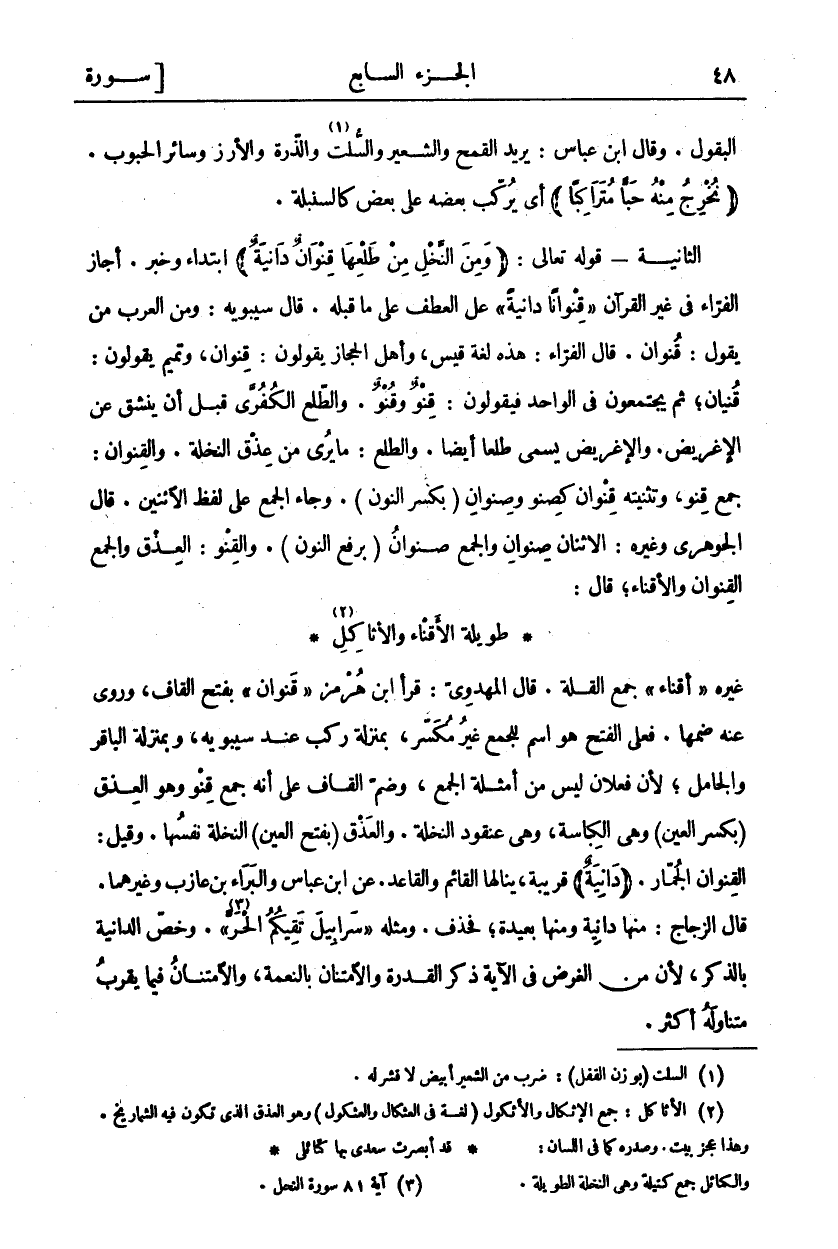 الْبُقُولِ. وَقَالَ ابْنُ عَبَّاسٍ: يُرِيدُ الْقَمْحَ وَالشَّعِيرَ وَالسُّلْتَ «١» وَالذُّرَةَ وَالْأَرُزَّ وَسَائِرَ الْحُبُوبِ. (نُخْرِجُ مِنْهُ حَبًّا مُتَراكِباً) أَيْ يَرْكَبُ بَعْضُهُ عَلَى بَعْضٍ كَالسُّنْبُلَةِ. الثَّانِيَةُ- قَوْلُهُ تَعَالَى: (وَمِنَ النَّخْلِ مِنْ طَلْعِها قِنْوانٌ دانِيَةٌ) ابْتِدَاءٌ وَخَبَرٌ. وَأَجَازَ الْفَرَّاءُ فِي غَيْرِ الْقُرْآنِ" قِنْوَانًا دَانِيَةً" عَلَى الْعَطْفِ عَلَى مَا قَبْلَهُ. قَالَ سِيبَوَيْهِ: وَمِنَ الْعَرَبِ مَنْ يَقُولُ: قُنْوَانٌ. قَالَ الْفَرَّاءُ: هَذِهِ لُغَةُ قَيْسٍ، وَأَهْلُ الْحِجَازِ يَقُولُونَ: قِنْوَانٌ، وَتَمِيمٌ يَقُولُونَ: قِنْيَانٌ، ثُمَّ يَجْتَمِعُونَ فِي الْوَاحِدِ فَيَقُولُونَ: قِنْوٌ وَقَنْوٌ. وَالطَّلْعُ الْكُفُرَّى قَبْلَ أَنْ يَنْشَقَّ عَنِ الْإِغْرِيضِ. وَالْإِغْرِيضُ يُسَمَّى طَلْعًا أَيْضًا. وَالطَّلْعُ، مَا يُرَى مِنْ عِذْقِ النَّخْلَةِ. وَالْقِنْوَانُ: جَمْعُ قِنْوٍ، وَتَثْنِيَتُهُ قِنْوَانٌ كَصِنْوٍ وَصِنْوَانٍ (بِكَسْرِ النُّونِ). وَجَاءَ الْجَمْعُ عَلَى لَفْظِ الِاثْنَيْنِ. قَالَ الْجَوْهَرِيُّ وَغَيْرُهُ: الِاثْنَانِ صِنْوَانِ وَالْجَمْعُ صِنْوَانٌ (بِرَفْعِ النُّونِ). وَالْقِنْوُ: الْعِذْقُ وَالْجَمْعُ الْقِنْوَانُ وَالْأَقْنَاءُ، قَالَ: