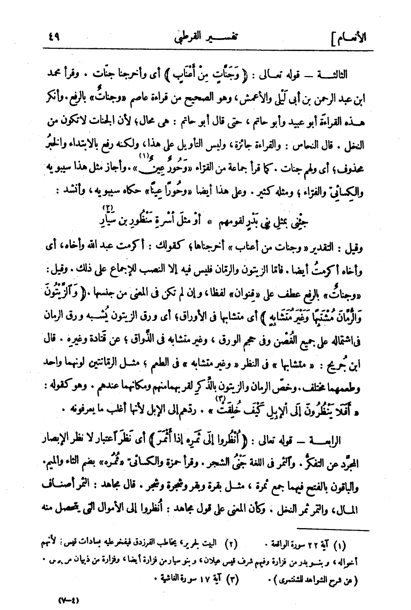 وَقِيلَ: التَّقْدِيرُ" وَجَنَّاتٍ مِنْ أَعْنابٍ" أَخْرَجْنَاهَا، كَقَوْلِكَ: أَكْرَمْتُ عَبْدَ اللَّهِ وَأَخُوهُ، أَيْ وَأَخُوهُ أَكْرَمْتُ أَيْضًا. فَأَمَّا الزَّيْتُونُ وَالرُّمَّانُ فَلَيْسَ فِيهِ إِلَّا النَّصْبُ لِلْإِجْمَاعِ عَلَى ذَلِكَ. وَقِيلَ:" وَجَنَّاتٍ" بِالرَّفْعِ عَطْفٌ عَلَى" قِنْوانٌ" لَفْظًا، وَإِنْ لَمْ تَكُنْ في المعنى من جنسها. (وَالزَّيْتُونَ وَالرُّمَّانَ مُتَشابِهاً وَغَيْرَ مُتَشابِهٍ) أَيْ مُتَشَابِهًا فِي الْأَوْرَاقِ، أَيْ ورق الزيتون يشبه ورق الرمان في اشتمال عَلَى جَمِيعِ الْغُصْنِ وَفِي حَجْمِ الْوَرَقِ، وَغَيْرُ مُتَشَابِهٍ فِي الذَّوَاقِ، عَنْ قَتَادَةَ وَغَيْرِهِ. قَالَ ابْنُ جُرَيْجٍ:" مُتَشابِهاً" فِي النَّظَرِ" وَغَيْرَ مُتَشابِهٍ" في الطعم، مثل الرمانتين لونهما واحد وطعامهما مُخْتَلِفٌ. وَخُصَّ الرُّمَّانُ وَالزَّيْتُونُ بِالذِّكْرِ لِقُرْبِهِمَا مِنْهُمْ وَمَكَانِهِمَا عِنْدَهُمْ. وَهُوَ كَقَوْلِهِ:" أَفَلا يَنْظُرُونَ إِلَى الْإِبِلِ كَيْفَ خُلِقَتْ «٣» ". رَدَّهُمْ إِلَى الْإِبِلِ لِأَنَّهَا أَغْلَبُ مَا يَعْرِفُونَهُ. الرَّابِعَةُ- قَوْلُهُ تَعَالَى: (انْظُرُوا إِلى ثَمَرِهِ إِذا أَثْمَرَ) أَيْ نَظَرَ الِاعْتِبَارِ لَا نَظَرَ الْإِبْصَارِ الْمُجَرَّدِ عَنِ التَّفَكُّرِ. وَالثَّمَرُ فِي اللُّغَةِ جَنَى الشَّجَرِ. وَقَرَأَ حَمْزَةُ وَالْكِسَائِيُّ" ثُمُرُهُ" بِضَمِّ الثَّاءِ وَالْمِيمِ. وَالْبَاقُونَ بِالْفَتْحِ فِيهِمَا جَمْعُ ثَمَرَةٍ، مِثْلَ بَقَرَةٍ وَبَقَرٍ وَشَجَرَةٍ وَشَجَرٍ. قال مجاهد الثمر أصناف المال، والتمر ثَمَرُ النَّخْلِ. وَكَأَنَّ الْمَعْنَى عَلَى قَوْلِ مُجَاهِدٍ: انظروا إلى الأموال التي يتحصل منه