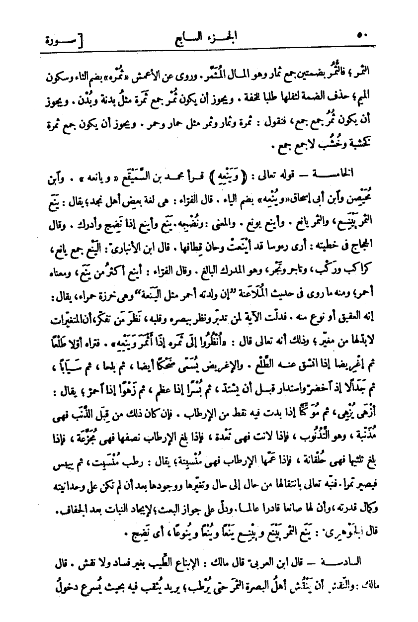 الثَّمَرُ، فَالثُّمُرُ بِضَمَّتَيْنِ جَمْعُ ثِمَارٍ وَهُوَ الْمَالُ الْمُثْمِرُ. وَرُوِيَ عَنِ الْأَعْمَشِ «١» ثُمْرُهُ" بِضَمِّ الثَّاءِ وَسُكُونِ الْمِيمِ، حُذِفَتِ الضَّمَّةُ لِثِقَلِهَا طَلَبًا لِلْخِفَّةِ. وَيَجُوزُ أَنْ يَكُونَ ثَمَرٌ جَمْعُ ثَمَرَةٍ مِثْلَ بَدَنَةٍ وَبَدَنٍ. وَيَجُوزُ أَنْ يَكُونَ ثَمَرٌ جَمْعُ جَمْعٍ، فَتَقُولُ: ثَمَرَةٌ وَثِمَارٌ وَثَمَرٌ مِثْلَ حِمَارٍ وَحُمُرٌ. وَيَجُوزُ أَنْ يَكُونَ جَمْعُ ثَمَرَةٍ كَخَشَبَةٍ وَخَشَبٍ لَا جَمْعَ الْجَمْعِ. الْخَامِسَةُ- قَوْلُهُ تَعَالَى: (وَيَنْعِهِ) قَرَأَ مُحَمَّدُ بْنُ السَّمَيْقَعِ" وَيَانِعِهِ «٢» ". وَابْنُ مُحَيْصِنٍ وَابْنُ أَبِي إِسْحَاقَ" وَيُنْعِهِ" بِضَمِّ الْيَاءِ. قَالَ الْفَرَّاءُ: هِيَ لُغَةُ بَعْضِ أَهْلِ نَجْدٍ، يُقَالُ: يَنَعَ الثَّمَرُ يَيْنَعُ، وَالثَّمَرُ يَانِعٌ. وَأَيْنَعَ يونع و (التمر «٣» مُونِعٌ). وَالْمَعْنَى: وَنُضْجُهُ. يَنَعَ وَأَيْنَعَ إِذَا نَضِجَ وَأَدْرَكَ. قَالَ الْحَجَّاجُ فِي خُطْبَتِهِ: أَرَى رُءُوسًا قَدْ أَيْنَعَتْ وَحَانَ قِطَافُهَا. قَالَ ابْنُ الْأَنْبَارِيِّ: الْيَنْعُ جَمْعُ يَانِعٍ، كَرَاكِبٍ وَرَكْبٍ، وَتَاجِرٍ وَتَجْرٍ، وَهُوَ الْمُدْرِكُ الْبَالِغُ. وَقَالَ الْفَرَّاءُ: أَيْنَعَ أَكْثَرَ مِنْ يَنَعَ، وَمَعْنَاهُ أَحْمَرُ، وَمِنْهُ مَا رُوِيَ فِي حَدِيثِ الْمُلَاعَنَةِ (إِنْ وَلَدَتْهُ أَحْمَرَ مِثْلَ الْيَنَعَةِ) وَهِيَ خَرَزَةٌ حَمْرَاءُ، يُقَالُ: إِنَّهُ الْعَقِيقُ أَوْ نَوْعٌ مِنْهُ. فَدَلَّتِ الْآيَةُ لِمَنْ تَدَبَّرَ وَنَظَرَ بِبَصَرِهِ وَقَلْبِهِ، نَظَرَ مَنْ تَفَكَّرَ، أَنَّ الْمُتَغَيِّرَاتِ لَا بُدَّ لَهَا مِنْ مُغَيِّرٍ، وَذَلِكَ أَنَّهُ تَعَالَى قَالَ:" انْظُرُوا إِلى ثَمَرِهِ إِذا أَثْمَرَ وَيَنْعِهِ". فَتَرَاهُ أَوَّلًا طَلْعًا ثُمَّ إِغْرِيضًا إِذَا انْشَقَّ عَنْهُ الطَّلْعُ. وَالْإِغْرِيضُ يُسَمَّى ضَحْكًا أَيْضًا، ثُمَّ بَلَحًا، ثُمَّ سَيَّابًا، ثُمَّ جِدَالًا إِذِ اخْضَرَّ وَاسْتَدَارَ قَبْلَ أَنْ يَشْتَدَّ، ثُمَّ بُسْرًا إِذَا عَظُمَ، ثُمَّ زَهْوًا إِذَا احْمَرَّ، يُقَالُ: أَزْهَى يُزْهِي، ثُمَّ مُوَكَّتًا إِذَا بَدَتْ فِيهِ نُقَطٌ مِنَ الْإِرْطَابِ. فَإِنْ كَانَ ذَلِكَ مِنْ قِبَلِ الذَّنَبِ فَهِيَ مُذْنِبَةٌ، وَهُوَ التَّذْنُوبُ، فَإِذَا لَانَتْ فَهِيَ ثَعْدَةٌ، فَإِذَا بَلَغَ الْإِرْطَابُ نِصْفَهَا فَهِيَ مُجَزَّعَةٌ، فَإِذَا بَلَغَ ثُلُثَيْهَا فَهِيَ حُلْقَانَةٌ، فَإِذَا عَمَّهَا الْإِرْطَابُ فَهِيَ مُنْسَبِتَةٌ، يُقَالُ: رُطَبٌ مُنْسَبِتٌ، ثُمَّ يَيْبَسُ فَيَصِيرُ تَمْرًا. فَنَبَّهَ اللَّهُ تَعَالَى بِانْتِقَالِهَا مِنْ حَالٍ إِلَى حَالٍ وَتَغَيُّرِهَا وَوُجُودِهَا بَعْدَ أَنْ لَمْ تَكُنْ بَعْدُ عَلَى وَحْدَانِيَّتِهِ وَكَمَالِ قُدْرَتِهِ، وَأَنَّ لَهَا صَانِعًا قَادِرًا عَالِمًا. وَدَلَّ عَلَى جَوَازِ الْبَعْثِ، لِإِيجَادِ النَّبَاتِ بَعْدَ الْجَفَافِ. قَالَ الْجَوْهَرِيُّ يَنَعَ الثَّمَرُ يَيْنَعُ وَيَيْنَعُ يَنْعًا وَيُنُوعًا، أَيْ نَضِجَ. السَّادِسَةُ- قال ابن العربي قال ما لك: الْإِينَاعُ الطِّيبُ بِغَيْرِ فَسَادٍ وَلَا نَقْشٍ. قَالَ مالك: والنقش أن ينقش أهل البصر الثَّمَرَ حَتَّى يُرْطَبَ، يُرِيدُ يُثْقَبُ فِيهِ بِحَيْثُ يسرع دخول