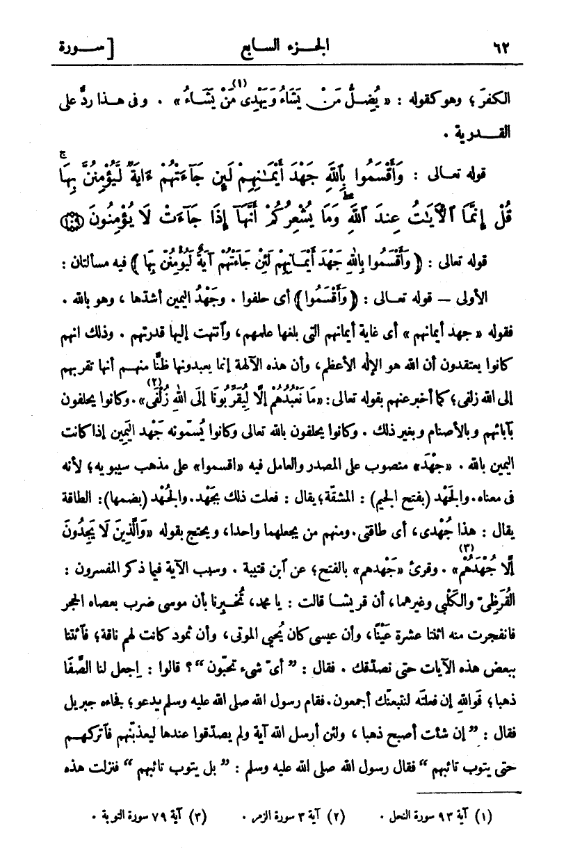 قَوْلُهُ تَعَالَى: (وَأَقْسَمُوا بِاللَّهِ جَهْدَ أَيْمانِهِمْ لَئِنْ جاءَتْهُمْ آيَةٌ لَيُؤْمِنُنَّ بِها) فِيهِ مَسْأَلَتَانِ: الْأُولَى- قَوْلُهُ تَعَالَى:" وَأَقْسَمُوا" أَيْ حَلَفُوا. وَجَهْدُ الْيَمِينِ أَشَدُّهَا، وَهُوَ بِاللَّهِ فَقَوْلُهُ:" جَهْدَ أَيْمانِهِمْ" أَيْ غَايَةُ أَيْمَانِهِمُ الَّتِي بَلَغَهَا عِلْمُهُمْ، وَانْتَهَتْ إِلَيْهَا قُدْرَتُهُمْ. وَذَلِكَ أَنَّهُمْ كَانُوا يَعْتَقِدُونَ أَنَّ اللَّهَ هُوَ الْإِلَهُ الْأَعْظَمُ، وَأَنَّ هَذِهِ الْآلِهَةَ إِنَّمَا يَعْبُدُونَهَا ظَنًّا مِنْهُمْ أَنَّهَا تُقَرِّبُهُمْ إِلَى اللَّهِ زُلْفَى، كَمَا أَخْبَرَ عَنْهُمْ بِقَوْلِهِ تَعَالَى:" مَا نَعْبُدُهُمْ إِلَّا لِيُقَرِّبُونا إِلَى اللَّهِ زُلْفى «٢» ". وَكَانُوا يَحْلِفُونَ بِآبَائِهِمْ وَبِالْأَصْنَامِ وَبِغَيْرِ ذَلِكَ، وَكَانُوا يَحْلِفُونَ بِاللَّهِ تَعَالَى وَكَانُوا يُسَمُّونَهُ جَهْدَ الْيَمِينِ إِذَا كَانَتِ الْيَمِينُ بِاللَّهِ." جَهْدَ" مَنْصُوبٌ عَلَى الْمَصْدَرِ وَالْعَامِلُ فِيهِ" أَقْسَمُوا" عَلَى مَذْهَبِ سِيبَوَيْهِ، لِأَنَّهُ فِي مَعْنَاهُ. وَالْجَهْدُ (بِفَتْحِ الْجِيمِ): الْمَشَقَّةُ يُقَالُ: فَعَلْتُ ذَلِكَ بِجَهْدٍ. وَالْجُهْدُ (بِضَمِّهَا): الطَّاقَةُ يُقَالُ: هَذَا جُهْدِي، أَيْ طَاقَتِي. وَمِنْهُمْ مَنْ يَجْعَلُهُمَا واحدا، ويحتج بقول" وَالَّذِينَ لا يَجِدُونَ إِلَّا جُهْدَهُمْ «٣» ". وقرى" جُهْدَهُمْ" بِالْفَتْحِ، عَنِ ابْنِ قُتَيْبَةَ. وَسَبَبُ الْآيَةِ فِيمَا ذَكَرَ الْمُفَسِّرُونَ: الْقُرَظِيُّ وَالْكَلْبِيُّ وَغَيْرُهُمَا، أَنَّ قُرَيْشًا قَالَتْ: يَا مُحَمَّدُ، تُخْبِرُنَا بِأَنَّ مُوسَى ضَرَبَ بِعَصَاهُ الْحَجَرَ فَانْفَجَرَتْ مِنْهُ اثْنَتَا عَشْرَةَ عَيْنًا، وَأَنَّ عِيسَى كَانَ يُحْيِي الْمَوْتَى، وَأَنَّ ثَمُودَ كَانَتْ لَهُمْ نَاقَةٌ، فَائِتِنَا بِبَعْضِ هَذِهِ الآيات حتى نصدقك. فقال: (أي شي تُحِبُّونَ)؟ قَالُوا: اجْعَلْ لَنَا الصَّفَا ذَهَبًا، فَوَاللَّهِ إِنْ فَعَلْتَهُ لَنَتَّبِعَنَّكَ أَجْمَعُونَ. فَقَامَ رَسُولُ اللَّهِ صَلَّى اللَّهُ عَلَيْهِ وَسَلَّمَ يَدْعُو، فَجَاءَهُ جِبْرِيلُ عَلَيْهِ السَّلَامُ فَقَالَ: (إِنْ شئت أصبح (الصفا «٤» ذهبا، ولين أَرْسَلَ اللَّهُ آيَةً وَلَمْ يُصَدِّقُوا عِنْدَهَا لَيُعَذِّبَنَّهُمْ فَاتْرُكْهُمْ حَتَّى يَتُوبَ تَائِبُهُمْ) فَقَالَ رَسُولُ اللَّهِ صَلَّى اللَّهُ عَلَيْهِ وَسَلَّمَ