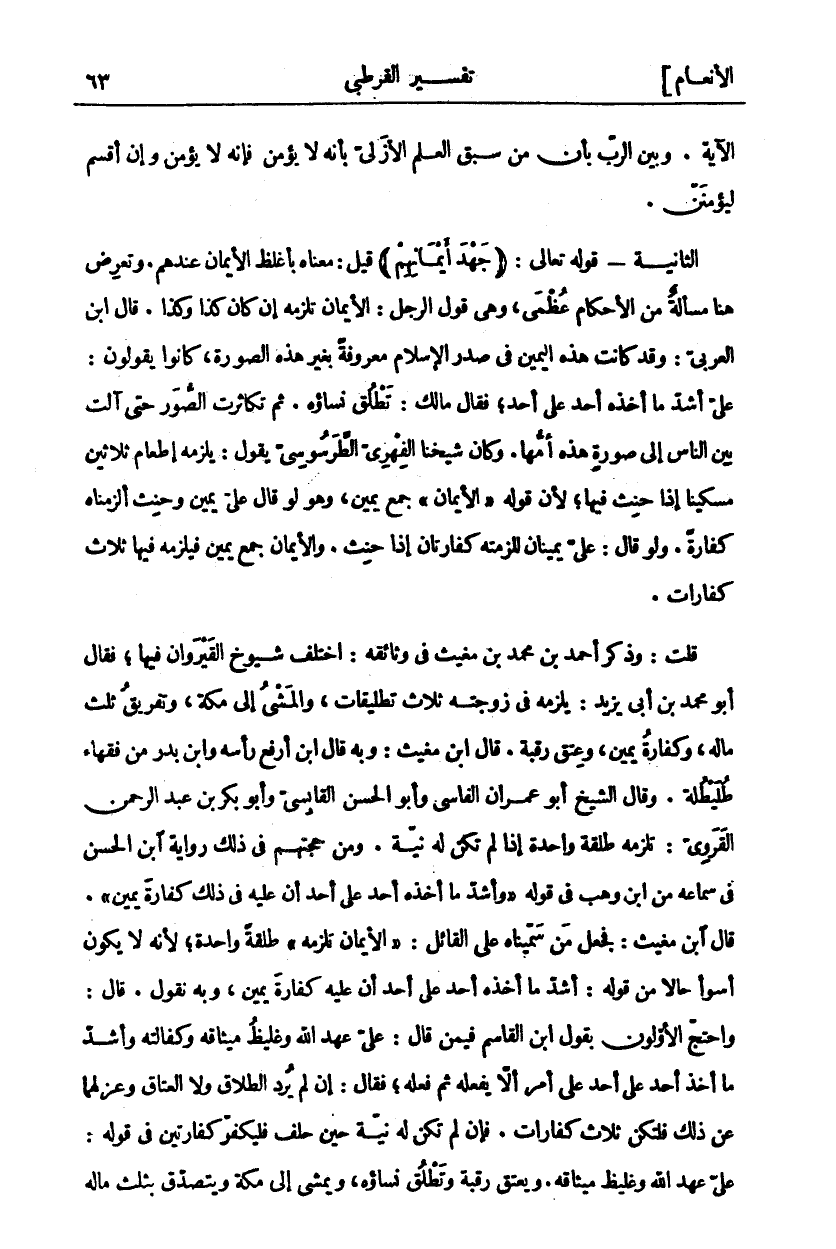 (بَلْ يَتُوبُ تَائِبُهُمْ) فَنَزَلَتْ هَذِهِ الْآيَةُ. وَبَيَّنَ الرَّبُّ «١» بِأَنَّ مَنْ سَبَقَ الْعِلْمُ الْأَزَلِيُّ بِأَنَّهُ لَا يُؤْمِنُ فَإِنَّهُ لَا يُؤْمِنُ وَإِنْ أَقْسَمَ لَيُؤْمِنَنَّ. الثَّانِيَةُ- قَوْلُهُ تَعَالَى:" جَهْدَ أَيْمانِهِمْ" قِيلَ: مَعْنَاهُ بِأَغْلَظِ الْأَيْمَانِ عِنْدَهُمْ. وَتُعْرَضُ هُنَا مَسْأَلَةٌ مِنَ الْأَحْكَامِ عُظْمَى، وَهِيَ قَوْلُ الرَّجُلِ: الْأَيْمَانُ تَلْزَمُهُ إِنْ كَانَ كَذَا وَكَذَا. قَالَ ابْنُ الْعَرَبِيِّ: وَقَدْ كَانَتْ هَذِهِ الْيَمِينُ فِي صَدْرِ الْإِسْلَامِ مَعْرُوفَةً بِغَيْرِ هَذِهِ الصُّورَةِ، كَانُوا يَقُولُونَ: عَلَيَّ أَشَدُّ مَا أَخَذَهُ أَحَدٌ عَلَى أَحَدٍ، فَقَالَ مَالِكٌ: تُطَلَّقُ نِسَاؤُهُ. ثُمَّ تَكَاثَرَتِ الصُّورَةُ حَتَّى آلَتْ بَيْنَ النَّاسِ إِلَى صُورَةٍ هَذِهِ أُمُّهَا. وَكَانَ شَيْخُنَا الْفِهْرِيُّ الطَّرَسُوسِيُّ يَقُولُ: يَلْزَمُهُ إِطْعَامُ ثَلَاثِينَ مِسْكِينًا إِذَا حَنِثَ فِيهَا، لِأَنَّ قَوْلَهُ" الْأَيْمَانُ" جَمْعُ يَمِينٍ، وَهُوَ لَوْ قَالَ عَلَيَّ يَمِينٌ وَحَنِثَ أَلْزَمْنَاهُ كَفَّارَةً. وَلَوْ قَالَ: عَلَيَّ يَمِينَانِ لَلَزِمَتْهُ «٢» كَفَّارَتَانِ إِذَا حَنِثَ. وَالْأَيْمَانُ جَمْعُ يَمِينٍ فَيَلْزَمُهُ فِيهَا ثَلَاثُ كَفَّارَاتٍ. قُلْتُ: وَذَكَرَ أَحْمَدُ بْنُ مُحَمَّدِ بْنِ مُغِيثٍ فِي وَثَائِقِهِ: اخْتَلَفَ شُيُوخُ الْقَيْرَوَانِ فِيهَا، فَقَالَ أَبُو مُحَمَّدِ بْنُ أَبِي زَيْدٍ، يَلْزَمُهُ فِي زَوْجَتِهِ ثَلَاثُ تَطْلِيقَاتٍ، وَالْمَشْيُ إِلَى مَكَّةَ، وَتَفْرِيقُ ثُلُثِ مَالِهِ، وَكَفَّارَةُ يَمِينٍ، وَعِتْقُ رَقَبَةٍ. قَالَ ابْنُ مُغِيثٍ: وَبِهِ قَالَ ابْنُ أَرْفَعَ رَأْسَهُ وَابْنُ بَدْرٍ مِنْ فُقَهَاءِ طُلَيْطِلَةَ. وَقَالَ الشَّيْخُ أَبُو عِمْرَانَ الْفَاسِيُّ وَأَبُو الْحَسَنِ الْقَابِسِيُّ وَأَبُو بَكْرِ بْنُ عَبْدِ الرَّحْمَنِ الْقَرَوِيُّ: تَلْزَمُهُ طَلْقَةٌ وَاحِدَةٌ إِذَا لَمْ تَكُنْ لَهُ نِيَّةٌ. وَمِنْ حُجَّتِهِمْ فِي ذَلِكَ رِوَايَةُ ابْنِ الْحَسَنِ فِي سَمَاعِهِ مِنَ ابْنِ وَهْبٍ فِي قَوْلِهِ:" وَأَشَدُّ مَا أخذه أحد على أحد أن عليه ذَلِكَ كَفَّارَةَ يَمِينٍ". قَالَ ابْنُ مُغِيثٍ: فَجَعَلَ «٣» مَنْ سَمَّيْنَاهُ عَلَى الْقَائِلِ:" الْأَيْمَانَ تَلْزَمُهُ" طَلْقَةٌ وَاحِدَةٌ، لِأَنَّهُ لَا يَكُونُ أَسْوَأَ حَالًا مِنْ قَوْلِهِ: أَشَدُّ مَا أَخَذَهُ أَحَدٌ عَلَى أَحَدٍ أَنَّ عَلَيْهِ كَفَّارَةَ يَمِينٍ، قَالَ «٤» وَبِهِ نَقُولُ. قال: واحتج الأولون بقول ابن القاسم مَنْ قَالَ: عَلَيَّ عَهْدُ اللَّهِ وَغَلِيظُ مِيثَاقِهِ وَكَفَالَتُهُ وَأَشَدُّ مَا أَخَذَهُ أَحَدٌ عَلَى أَحَدٍ عَلَى أَمْرٍ أَلَّا يَفْعَلَهُ ثُمَّ فَعَلَهُ، فَقَالَ: إِنْ لَمْ يُرِدِ الطَّلَاقَ وَلَا الْعِتَاقَ وَعَزَلَهُمَا عَنْ ذَلِكَ فَلْتَكُنْ ثَلَاثَ كَفَّارَاتٍ. فَإِنْ لَمْ تَكُنْ لَهُ نِيَّةٌ حِينَ حَلَفَ فَلْيُكَفِّرْ كَفَّارَتَيْنِ فِي قَوْلِهِ: عَلَيَّ عَهْدُ اللَّهِ وَغَلِيظُ مِيثَاقِهِ. وَيَعْتِقُ رَقَبَةً وَتُطَلَّقُ نِسَاؤُهُ، وَيَمْشِي إِلَى مَكَّةَ