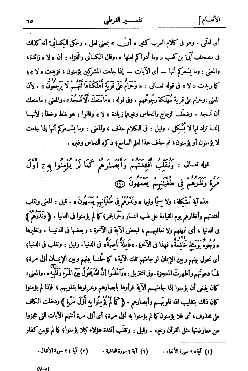 هَذِهِ آيَةٌ مُشْكِلَةٌ، وَلَا سِيَّمَا وَفِيهَا" وَنَذَرُهُمْ فِي طُغْيانِهِمْ يَعْمَهُونَ". قِيلَ: الْمَعْنَى وَنُقَلِّبُ أَفْئِدَتَهُمْ وَأَنْظَارَهُمْ يَوْمَ الْقِيَامَةِ عَلَى لَهَبِ النَّارِ وَحَرِّ الْجَمْرِ، كَمَا لَمْ يُؤْمِنُوا فِي الدُّنْيَا." وَنَذَرُهُمْ" فِي الدُّنْيَا، أَيْ نُمْهِلُهُمْ وَلَا نُعَاقِبُهُمْ، فَبَعْضُ الْآيَةِ فِي الْآخِرَةِ، وَبَعْضُهَا فِي الدُّنْيَا. وَنَظِيرُهَا" وُجُوهٌ يَوْمَئِذٍ خاشِعَةٌ «٤» " فَهَذَا فِي الْآخِرَةِ." عامِلَةٌ ناصِبَةٌ" فِي الدُّنْيَا. وَقِيلَ: وَنُقَلِّبُ فِي الدُّنْيَا، أَيْ نَحُولُ بَيْنَهُمْ وَبَيْنَ الْإِيمَانِ لَوْ جَاءَتْهُمْ تِلْكَ الْآيَةُ، كَمَا حُلْنَا بَيْنَهُمْ وَبَيْنَ الْإِيمَانِ أَوَّلَ مَرَّةٍ، لَمَّا دَعَوْتَهُمْ وَأَظْهَرْتِ الْمُعْجِزَةَ. وَفِي التَّنْزِيلِ:" وَاعْلَمُوا أَنَّ اللَّهَ يَحُولُ بَيْنَ الْمَرْءِ وَقَلْبِهِ". وَالْمَعْنَى: كَانَ يَنْبَغِي أَنْ يُؤْمِنُوا إِذَا جَاءَتْهُمُ الْآيَةُ فَرَأَوْهَا بِأَبْصَارِهِمْ وَعَرَفُوهَا بِقُلُوبِهِمْ، فَإِذَا لَمْ يُؤْمِنُوا كَانَ ذَلِكَ بِتَقْلِيبِ اللَّهِ قُلُوبَهُمْ وَأَبْصَارَهُمْ. كَمَا لَمْ يُؤْمِنُوا بِهِ أَوَّلَ مَرَّةٍ وَدَخَلَتِ الْكَافُ عَلَى مَحْذُوفٍ، أَيْ فَلَا يُؤْمِنُونَ كَمَا لَمْ يُؤْمِنُوا بِهِ أَوَّلَ مَرَّةٍ، أَيْ أَوَّلَ مَرَّةٍ أَتَتْهُمُ الْآيَاتُ الَّتِي عَجَزُوا عَنْ مُعَارَضَتِهَا مِثْلَ الْقُرْآنِ وَغَيْرِهِ. وَقِيلَ وَنُقَلِّبُ أَفْئِدَةَ هَؤُلَاءِ كيلا