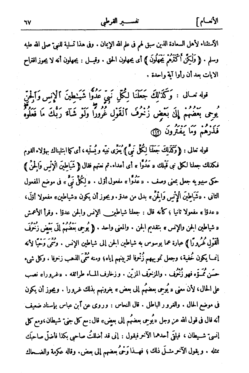 قَوْلُهُ تَعَالَى: (وَكَذلِكَ جَعَلْنا لِكُلِّ نَبِيٍّ) يُعَزِّي نَبِيَّهُ وَيُسَلِّيهِ، أَيْ كَمَا ابْتَلَيْنَاكَ بِهَؤُلَاءِ الْقَوْمِ فَكَذَلِكَ جَعَلْنَا لِكُلِّ نَبِيٍّ قَبْلَكَ (عَدُوًّا) أي أعداء. ثم نعتهم فقال (شَياطِينَ الْإِنْسِ وَالْجِنِّ) حَكَى سِيبَوَيْهِ جَعَلَ بِمَعْنَى وَصَفَ." عَدُوًّا" مَفْعُولٌ أَوَّلُ." لِكُلِّ نَبِيٍّ" فِي مَوْضِعِ الْمَفْعُولِ الثَّانِي." شَياطِينَ الْإِنْسِ وَالْجِنِّ" بَدَلٌ مِنْ عَدُوٍّ. وَيَجُوزُ أَنْ يَكُونَ" شَياطِينَ" مَفْعُولًا أَوَّلَ،" عَدُوًّا" مَفْعُولًا ثَانِيًا، كَأَنَّهُ قِيلَ: جَعَلْنَا شَيَاطِينَ الْإِنْسِ وَالْجِنِّ عَدُوًّا. وَقَرَأَ الْأَعْمَشُ:" شَيَاطِينَ الْجِنِّ وَالْإِنْسِ" بِتَقْدِيمِ الْجِنِّ. وَالْمَعْنَى وَاحِدٌ. (يُوحِي بَعْضُهُمْ إِلى بَعْضٍ زُخْرُفَ الْقَوْلِ غُرُوراً) عِبَارَةٌ عَمَّا يُوَسْوِسُ بِهِ شَيَاطِينُ الْجِنِّ إِلَى شَيَاطِينِ الْإِنْسِ. وَسُمِّيَ وَحْيًا لِأَنَّهُ إِنَّمَا يَكُونُ خِفْيَةً، وَجَعَلَ تَمْوِيهَهُمْ زُخْرُفًا لِتَزْيِينِهِمْ إِيَّاهُ، وَمِنْهُ سُمِّيَ الذهب زخرفا. وكل شي حَسَنٍ مُمَوَّهٍ فَهُوَ زُخْرُفٌ. وَالْمُزَخْرَفُ الْمُزَيَّنُ. وَزَخَارِفُ الْمَاءِ طَرَائِقُهُ. وَ" غُرُوراً" نَصْبٌ عَلَى الْمَصْدَرِ، لِأَنَّ مَعْنَى" يُوحِي بَعْضُهُمْ إِلى بَعْضٍ" يَغُرُّونَهُمْ بِذَلِكَ غُرُورًا. وَيَجُوزُ أَنْ يَكُونَ فِي مَوْضِعِ الْحَالِ وَالْغُرُورُ الْبَاطِلُ. قَالَ النَّحَّاسُ: وَرُوِيَ عَنِ ابْنِ عَبَّاسٍ بِإِسْنَادٍ ضَعِيفٍ أَنَّهُ قَالَ فِي قَوْلِ اللَّهِ عَزَّ وَجَلَّ" يُوحِي بَعْضُهُمْ إِلى بَعْضٍ" قَالَ: مَعَ كُلِّ جِنِّيٍّ شَيْطَانٌ، وَمَعَ كُلِّ إِنْسِيٍّ شَيْطَانٌ، فَيَلْقَى أَحَدُهُمَا الْآخَرَ فَيَقُولُ: إِنِّي قَدْ أَضْلَلْتُ صَاحِبِي بِكَذَا فَأَضِلَّ صَاحِبَكَ بِمِثْلِهِ. وَيَقُولُ الْآخَرُ مِثْلَ ذَلِكَ، فَهَذَا وَحْيُ بَعْضِهِمْ إِلَى بَعْضٍ. وَقَالَهُ عِكْرِمَةُ وَالضَّحَّاكُ