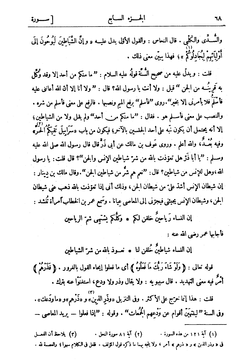 وَالسُّدِّيُّ وَالْكَلْبِيُّ. قَالَ النَّحَّاسُ: وَالْقَوْلُ الْأَوَّلُ يَدُلُّ عَلَيْهِ" وَإِنَّ الشَّياطِينَ لَيُوحُونَ إِلى أَوْلِيائِهِمْ لِيُجادِلُوكُمْ «١» "، فَهَذَا يُبَيِّنُ مَعْنَى ذَلِكَ. قُلْتُ: وَيَدُلُّ عَلَيْهِ من صحيح السنة قول عَلَيْهِ السَّلَامُ: (مَا مِنْكُمْ مِنْ أَحَدٍ إِلَّا وَقَدْ وُكِّلَ بِهِ قَرِينُهُ مِنَ الْجِنِّ) قِيلَ: ولا أنت يا رسول الله؟ قال: (ولا أَنَا إِلَّا أَنَّ اللَّهَ أَعَانَنِي عَلَيْهِ فَأَسْلَمَ فَلَا يَأْمُرُنِي إِلَّا بِخَيْرٍ). رُوِيَ (فَأَسْلَمُ) بِرَفْعِ الْمِيمِ وَنَصْبِهَا. فَالرَّفْعُ عَلَى مَعْنَى فَأَسْلَمُ مِنْ شَرِّهِ. وَالنَّصْبُ عَلَى مَعْنَى فَأَسْلَمَ هُوَ. فَقَالَ: (مَا مِنْكُمْ مِنْ أَحَدٍ) وَلَمْ يَقُلْ وَلَا مِنَ الشَّيَاطِينِ، إِلَّا أَنَّهُ يَحْتَمِلُ أَنْ يَكُونَ نَبَّهَ عَلَى أَحَدِ الْجِنْسَيْنِ بِالْآخَرِ، فَيَكُونُ مِنْ بَابِ" سَرابِيلَ تَقِيكُمُ «٢» الْحَرَّ" وَفِيهِ بُعْدٌ، وَاللَّهُ أَعْلَمُ. وَرَوَى عَوْفُ بْنُ مَالِكٍ عَنْ أَبِي ذَرٍّ قَالَ قَالَ رَسُولُ اللَّهِ صَلَّى اللَّهُ عَلَيْهِ وَسَلَّمَ: (يَا أَبَا ذَرٍّ هَلْ تَعَوَّذْتَ بِاللَّهِ مِنْ شَرِّ شَيَاطِينِ الْإِنْسِ وَالْجِنِّ)؟ قَالَ قُلْتُ: يَا رَسُولَ اللَّهِ، وَهَلْ لِلْإِنْسِ مِنْ شَيَاطِينَ؟ قَالَ: (نَعَمْ هُمْ شَرٌّ مِنْ شَيَاطِينِ الْجِنِّ). وَقَالَ مَالِكُ بْنُ دِينَارٍ: إِنَّ شَيْطَانَ الْإِنْسِ أَشَدُّ عَلَيَّ مِنْ شَيْطَانِ الْجِنِّ، وَذَلِكَ أَنِّي إِذَا تَعَوَّذْتُ بِاللَّهِ ذَهَبَ عَنِّي شَيْطَانُ الْجِنِّ، وَشَيْطَانُ الْإِنْسِ يَجِيئُنِي فَيَجُرُّنِي إِلَى الْمَعَاصِي عِيَانًا. وَسَمِعَ عُمَرُ بْنُ الْخَطَّابِ رَضِيَ «٣» اللَّهُ عَنْهُ امْرَأَةً تُنْشِدُ: