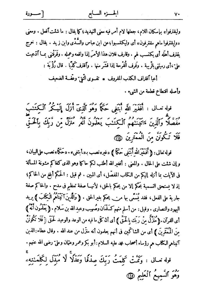 قَوْلُهُ تَعَالَى: (أَفَغَيْرَ اللَّهِ أَبْتَغِي حَكَماً) " غَيْرَ" نُصِبَ بِ" أَبْتَغِي"." حَكَماً" نَصْبٌ عَلَى الْبَيَانِ، وَإِنْ شِئْتَ عَلَى الْحَالِ. وَالْمَعْنَى: أَفَغَيْرَ اللَّهِ أَطْلُبُ لَكُمْ حَاكِمًا وَهُوَ كَفَاكُمْ مَئُونَةَ الْمَسْأَلَةِ فِي الْآيَاتِ بِمَا أَنْزَلَهُ إِلَيْكُمْ مِنَ الْكِتَابِ الْمُفَصَّلِ، أَيِ الْمُبِيَّنُ. ثُمَّ قِيلَ: الْحَكَمُ أَبْلَغُ مِنَ الْحَاكِمِ، إِذْ لَا يَسْتَحِقُّ التَّسْمِيَةَ بِحَكَمٍ إِلَّا مَنْ يَحْكُمُ بِالْحَقِّ، لِأَنَّهَا صِفَةُ تَعْظِيمٍ فِي مَدْحٍ. وَالْحَاكِمُ صِفَةٌ جَارِيَةٌ عَلَى الْفِعْلِ، فَقَدْ يُسَمَّى بِهَا مَنْ يَحْكُمُ بِغَيْرِ الْحَقِّ. (وَالَّذِينَ آتَيْناهُمُ الْكِتابَ) يُرِيدُ الْيَهُودَ وَالنَّصَارَى. وَقِيلَ: مَنْ أَسْلَمَ مِنْهُمْ كَسَلْمَانَ وَصُهَيْبٍ وعبد الله بن سلا. (يَعْلَمُونَ أَنَّهُ) أَيِ الْقُرْآنَ. (مُنَزَّلٌ مِنْ رَبِّكَ بِالْحَقِّ) أَيْ أَنَّ كُلَّ مَا فِيهِ مِنَ الْوَعْدِ وَالْوَعِيدِ لَحَقٌّ فَلَا تَكُونَنَّ مِنَ الْمُمْتَرِينَ أَيْ مِنَ الشَّاكِّينَ فِي أَنَّهُمْ يَعْلَمُونَ أَنَّهُ مُنَزَّلٌ مِنْ عِنْدِ اللَّهِ. وَقَالَ عَطَاءٌ: الَّذِينَ آتينا الْكِتَابَ وَهُمْ رُؤَسَاءُ أَصْحَابِ مُحَمَّدٍ عَلَيْهِ السَّلَامُ: أَبُو بَكْرٍ وَعُمَرُ وَعُثْمَانُ وَعَلِيٌّ رَضِيَ اللَّهُ عنهم.