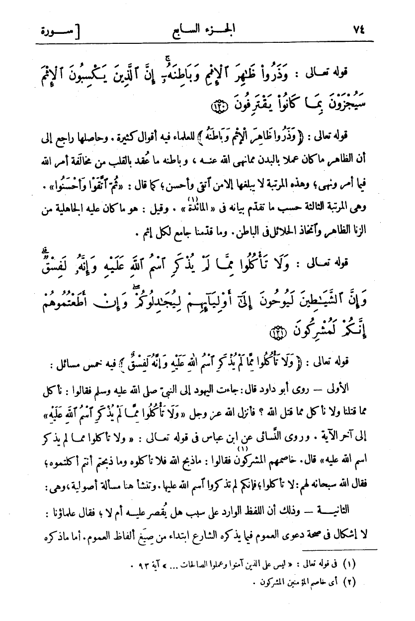 قَوْلُهُ تَعَالَى: (وَذَرُوا ظاهِرَ الْإِثْمِ وَباطِنَهُ) لِلْعُلَمَاءِ فِيهِ أَقْوَالٌ كَثِيرَةٌ وَحَاصِلُهَا رَاجِعٌ إِلَى أَنَّ الظَّاهِرَ مَا كَانَ عَمَلًا بِالْبَدَنِ مِمَّا نَهَى اللَّهُ عَنْهُ، وَبَاطِنَهُ مَا عَقَدَ بِالْقَلْبِ مِنْ مُخَالَفَةِ أَمْرِ اللَّهِ فِيمَا أَمَرَ وَنَهَى، وَهَذِهِ الْمَرْتَبَةُ لَا يَبْلُغُهَا إِلَّا مَنِ اتَّقَى وَأَحْسَنَ، كَمَا قَالَ:" ثُمَّ اتَّقَوْا وَآمَنُوا ثُمَّ اتَّقَوْا وَأَحْسَنُوا". وَهِيَ الْمَرْتَبَةُ الثَّالِثَةُ. حَسَبَ مَا تَقَدَّمَ بَيَانُهُ فِي الْمَائِدَةِ «١». وَقِيلَ: هُوَ مَا كَانَ عَلَيْهِ الْجَاهِلِيَّةُ من الزنا الظاهر واتخاذ الحلائل فِي الْبَاطِنِ. وَمَا قَدَّمْنَا جَامِعٌ لِكُلِّ إِثْمٍ (وموجب لكل أمر «٢».