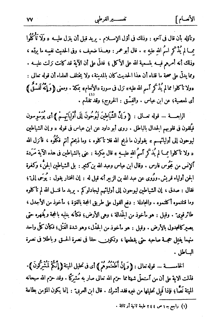 وَتَأَوَّلَهُ بِأَنْ قَالَ فِي آخِرِهِ: وَذَلِكَ فِي أَوَّلِ الْإِسْلَامِ. يُرِيدُ قَبْلَ أَنْ يَنْزِلَ عَلَيْهِ" وَلا تَأْكُلُوا مِمَّا لَمْ يُذْكَرِ اسْمُ اللَّهِ عَلَيْهِ". قَالَ أَبُو عُمَرَ: وَهَذَا ضَعِيفٌ، وَفِي الْحَدِيثِ نَفْسِهِ مَا يَرُدُّهُ، وَذَلِكَ أَنَّهُ أَمَرَهُمْ فِيهِ بِتَسْمِيَةِ اللَّهِ عَلَى الْأَكْلِ، فَدَلَّ عَلَى أَنَّ الْآيَةَ قَدْ كَانَتْ نَزَلَتْ عَلَيْهِ. وَمِمَّا يَدُلُّ عَلَى صِحَّةِ مَا قُلْنَاهُ أَنَّ هَذَا الْحَدِيثَ كَانَ بِالْمَدِينَةِ، وَلَا يَخْتَلِفُ الْعُلَمَاءُ أَنَّ قوله تَعَالَى:" وَلا تَأْكُلُوا مِمَّا لَمْ يُذْكَرِ اسْمُ اللَّهِ عَلَيْهِ" نَزَلَ فِي سُورَةِ" الْأَنْعَامِ" بمكة. ومعنى (وَإِنَّهُ لَفِسْقٌ) أَيْ لَمَعْصِيَةٌ عَنِ ابْنِ عَبَّاسٍ. وَالْفِسْقُ: الْخُرُوجُ. وَقَدْ تَقَدَّمَ «١». الرَّابِعَةُ- قَوْلُهُ تَعَالَى: (وَإِنَّ الشَّياطِينَ لَيُوحُونَ إِلى أَوْلِيائِهِمْ) أَيْ يُوَسْوِسُونَ فَيُلْقُونَ فِي قُلُوبِهِمُ الْجِدَالَ بِالْبَاطِلِ. رَوَى أَبُو دَاوُدَ عَنِ ابْنِ عَبَّاسٍ فِي قول:" وَإِنَّ الشَّياطِينَ لَيُوحُونَ إِلى أَوْلِيائِهِمْ" يَقُولُونَ: مَا ذَبَحَ اللَّهُ فَلَا تَأْكُلُوهُ، وَمَا ذَبَحْتُمْ أَنْتُمْ فَكُلُوهُ، فَأَنْزَلَ اللَّهُ" وَلا تَأْكُلُوا مِمَّا لَمْ يُذْكَرِ اسْمُ اللَّهِ عَلَيْهِ" قَالَ عِكْرِمَةُ: عَنَى بِالشَّيَاطِينِ فِي هَذِهِ الْآيَةِ مَرَدَةَ الْإِنْسِ مِنْ مَجُوسِ فَارِسَ. وَقَالَ ابْنُ عَبَّاسٍ وَعَبْدُ اللَّهِ بْنُ كَثِيرٍ: بَلِ الشَّيَاطِينُ الْجِنُّ، وَكَفَرَةُ الْجِنِّ أَوْلِيَاءُ قُرَيْشٍ. وَرُوِيَ عَنْ عَبْدِ اللَّهِ بْنِ الزُّبَيْرِ أَنَّهُ قِيلَ لَهُ: إِنَّ الْمُخْتَارَ يَقُولُ: يُوحَى إِلَيَّ فَقَالَ: صَدَقَ، إِنَّ الشَّيَاطِينَ لَيُوحُونَ إِلَى أَوْلِيَائِهِمْ. (وَقَوْلُهُ: «٢» " لِيُجادِلُوكُمْ". يُرِيدُ (قَوْلَهُمْ «٣»: مَا قَتَلَ اللَّهُ لَمْ تَأْكُلُوهُ وَمَا قَتَلْتُمُوهُ أَكَلْتُمُوهُ. وَالْمُجَادَلَةُ: دَفْعُ الْقَوْلِ عَلَى طَرِيقِ الْحُجَّةِ بِالْقُوَّةِ، مَأْخُوذٌ مِنَ الْأَجْدَلِ، طَائِرٌ قَوِيٌّ. وَقِيلَ: هُوَ مَأْخُوذٌ مِنَ الْجَدَالَةِ، وَهِيَ الْأَرْضُ، فَكَأَنَّهُ يَغْلِبُهُ بالحجة يقهره حَتَّى يَصِيرَ كَالْمَجْدُولِ بِالْأَرْضِ. وَقِيلَ: هُوَ مَأْخُوذٌ من الجدل، وهو شدة القتل، فَكَأَنَّ كُلَّ وَاحِدٍ مِنْهُمَا يَفْتِلُ حُجَّةَ صَاحِبِهِ حَتَّى يَقْطَعَهَا «٤»، وَتَكُونُ حَقًّا فِي نُصْرَةِ الْحَقِّ وَبَاطِلًا فِي نُصْرَةِ الْبَاطِلِ. الْخَامِسَةُ- قَوْلُهُ تَعَالَى: (وَإِنْ أَطَعْتُمُوهُمْ) أَيْ فِي تَحْلِيلِ الْمَيْتَةِ (إِنَّكُمْ لَمُشْرِكُونَ) فَدَلَّتِ الْآيَةُ عَلَى أَنَّ مَنِ اسْتَحَلَّ شَيْئًا مِمَّا حَرَّمَ اللَّهُ تَعَالَى صَارَ بِهِ مُشْرِكًا. وَقَدْ حَرَّمَ اللَّهُ سُبْحَانَهُ الْمَيْتَةَ نَصًّا، فَإِذَا قَبِلَ تَحْلِيلَهَا مِنْ غَيْرِهِ فَقَدْ أَشْرَكَ. قَالَ ابْنُ الْعَرَبِيِّ: إِنَّمَا يَكُونُ الْمُؤْمِنُ بِطَاعَةِ