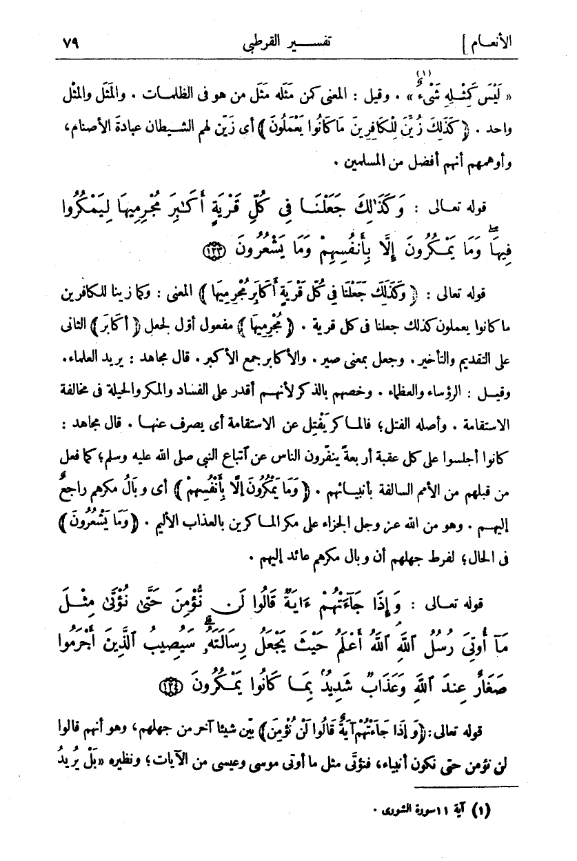 قَوْلُهُ تَعَالَى: (وَكَذلِكَ جَعَلْنا فِي كُلِّ قَرْيَةٍ أَكابِرَ مُجْرِمِيها) الْمَعْنَى: وَكَمَا زَيَّنَّا لِلْكَافِرِينَ مَا كَانُوا يَعْمَلُونَ كَذَلِكَ جَعَلْنَا فِي كُلِّ قرية." مُجْرِمِيها" مفعول أول لجعل" أَكابِرَ" مفعول ثاني عَلَى التَّقْدِيمِ وَالتَّأْخِيرِ. وَجَعَلَ بِمَعْنَى صَيَّرَ. وَالْأَكَابِرُ جَمْعُ الْأَكْبَرِ. قَالَ مُجَاهِدٌ: يُرِيدُ الْعُظَمَاءَ»