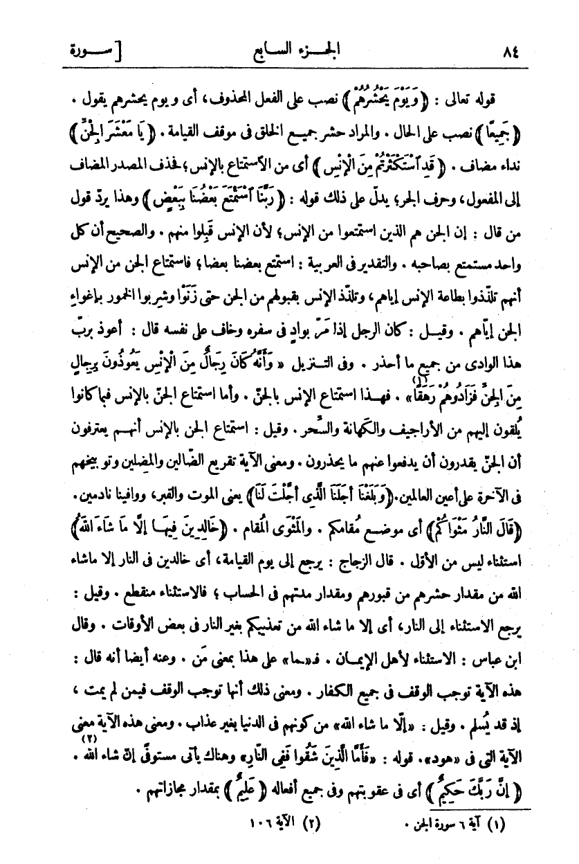 قوله تعالى: (وَيَوْمَ يَحْشُرُهُمْ) «١» نُصِبَ عَلَى الْفِعْلِ الْمَحْذُوفِ، أَيْ وَيَوْمَ نَحْشُرُهُمْ نَقُولُ. (جَمِيعاً) نُصِبَ عَلَى الْحَالِ. وَالْمُرَادُ حُشِرَ جَمِيعُ الْخَلْقِ فِي مَوْقِفِ الْقِيَامَةِ. (يَا مَعْشَرَ الْجِنِّ) نداء مضاف. (قَدِ اسْتَكْثَرْتُمْ مِنَ الْإِنْسِ) أَيْ مِنَ الِاسْتِمْتَاعِ بِالْإِنْسِ، فَحُذِفَ الْمَصْدَرُ الْمُضَافُ إِلَى الْمَفْعُولِ، وَحَرْفُ الْجَرِّ، يَدُلُّ عَلَى ذَلِكَ قَوْلُهُ: (رَبَّنَا اسْتَمْتَعَ بَعْضُنا بِبَعْضٍ) وَهَذَا يَرُدُّ قَوْلَ مَنْ قَالَ: إِنَّ الْجِنَّ هُمُ الَّذِينَ اسْتَمْتَعُوا مِنَ الْإِنْسِ، لِأَنَّ الْإِنْسَ قَبِلُوا مِنْهُمْ. وَالصَّحِيحُ أَنَّ كُلَّ وَاحِدٍ مُسْتَمْتِعٌ بِصَاحِبِهِ. وَالتَّقْدِيرُ فِي الْعَرَبِيَّةِ: اسْتَمْتَعَ بَعْضُنَا بَعْضًا، فَاسْتِمْتَاعُ الْجِنِّ مِنَ الْإِنْسِ أَنَّهُمْ تَلَذَّذُوا بِطَاعَةِ الْإِنْسِ إِيَّاهُمْ، وَتَلَذَّذَ الْإِنْسُ بِقَبُولِهِمْ مِنَ الْجِنِّ حَتَّى زَنَوْا وَشَرِبُوا الْخُمُورَ بِإِغْوَاءِ الْجِنِّ إِيَّاهُمْ. وَقِيلَ: كَانَ الرَّجُلُ إِذَا مَرَّ بِوَادٍ فِي سَفَرِهِ وَخَافَ عَلَى نَفْسِهِ قَالَ: أَعُوذُ بِرَبِّ «٢» هَذَا الْوَادِي مِنْ جَمِيعِ مَا أَحْذَرُ. وَفِي التَّنْزِيلِ:" وَأَنَّهُ كانَ رِجالٌ مِنَ الْإِنْسِ يَعُوذُونَ بِرِجالٍ مِنَ الْجِنِّ فَزادُوهُمْ رَهَقاً «٣» ". فَهَذَا اسْتِمْتَاعُ الْإِنْسِ بِالْجِنِّ. وَأَمَّا اسْتِمْتَاعُ الْجِنِّ بِالْإِنْسِ فَمَا كَانُوا يُلْقُونَ إِلَيْهِمْ مِنَ الْأَرَاجِيفِ وَالْكِهَانَةِ وَالسِّحْرِ. وَقِيلَ: اسْتِمْتَاعُ الْجِنِّ بِالْإِنْسِ أَنَّهُمْ يَعْتَرِفُونَ أَنَّ الْجِنَّ يَقْدِرُونَ أَنْ يَدْفَعُوا عَنْهُمْ مَا يَحْذَرُونَ. وَمَعْنَى الْآيَةِ تَقْرِيعُ الضَّالِّينَ وَالْمُضِلِّينَ وَتَوْبِيخُهُمْ فِي الْآخِرَةِ عَلَى أَعْيُنِ الْعَالَمِينَ. (وَبَلَغْنا أَجَلَنَا الَّذِي أَجَّلْتَ لَنا)