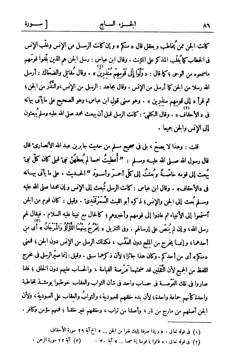 " وَإِنْ كَانَتِ الرُّسُلُ مِنَ الْإِنْسِ وَغَلَبَ الْإِنْسُ فِي الْخِطَابِ كَمَا يُغَلَّبُ الْمُذَكَّرُ عَلَى الْمُؤَنَّثِ. وَقَالَ ابْنُ عَبَّاسٍ: رُسُلُ الْجِنِّ هُمُ الَّذِينَ بَلَّغُوا قَوْمَهُمْ مَا سَمِعُوهُ مِنَ الْوَحْيِ، كَمَا قَالَ:" وَلَّوْا إِلى قَوْمِهِمْ مُنْذِرِينَ «١» ". وَقَالَ مُقَاتِلٌ وَالضَّحَّاكُ: أَرْسَلَ اللَّهُ رُسُلًا مِنَ الْجِنِّ كَمَا أَرْسَلَ مِنَ الْإِنْسِ. وَقَالَ مُجَاهِدٌ: الرُّسُلُ مِنَ الْإِنْسِ، وَالنُّذُرُ مِنَ الْجِنِّ، ثُمَّ قَرَأَ" إِلَى قَوْمِهِمْ مُنْذِرِينَ «٢» ". وَهُوَ مَعْنَى قَوْلِ ابْنِ عَبَّاسٍ، وَهُوَ الصَّحِيحُ عَلَى مَا يَأْتِي بَيَانُهُ فِي" الْأَحْقَافِ «٣» ". وَقَالَ الْكَلْبِيُّ «٤»: كَانَتِ الرُّسُلُ قَبْلَ أَنْ يُبْعَثَ مُحَمَّدٌ صَلَّى اللَّهُ عَلَيْهِ وَسَلَّمَ يُبْعَثُونَ إِلَى الْإِنْسِ وَالْجِنِّ جَمِيعًا. قُلْتُ: وَهَذَا لَا يَصِحُّ، بَلْ فِي صَحِيحِ مُسْلِمٍ مِنْ حَدِيثِ جَابِرِ بْنِ عَبْدِ اللَّهِ الْأَنْصَارِيِّ قَالَ قَالَ رَسُولُ اللَّهِ صَلَّى اللَّهُ عَلَيْهِ وَسَلَّمَ: (أُعْطِيتُ خَمْسًا لَمْ يُعْطَهُنَّ نَبِيٌّ قَبْلِي كَانَ كُلُّ نَبِيٍّ يُبْعَثُ إِلَى قَوْمِهِ خَاصَّةً وَبُعِثْتُ إِلَى كُلِّ أَحْمَرَ وَأَسْوَدَ) الْحَدِيثَ. عَلَى مَا يَأْتِي بَيَانُهُ فِي" الْأَحْقَافِ «٥» ". وَقَالَ ابْنُ عَبَّاسٍ: كَانَتِ الرُّسُلُ تُبْعَثُ إِلَى الْإِنْسِ وَإِنَّ مُحَمَّدًا صَلَّى اللَّهُ عَلَيْهِ وَسَلَّمَ بُعِثَ إِلَى الْجِنِّ وَالْإِنْسِ، ذكره أبو الليث السمر قندي. وَقِيلَ: كَانَ قَوْمٌ مِنَ الْجِنِّ: اسْتَمَعُوا إِلَى الْأَنْبِيَاءِ ثُمَّ عَادُوا إِلَى قَوْمِهِمْ وَأَخْبَرُوهُمْ، كَالْحَالِ مَعَ نَبِيِّنَا عَلَيْهِ السَّلَامُ. فَيُقَالُ لَهُمْ رُسُلُ اللَّهِ، وَإِنْ لَمْ يَنُصَّ عَلَى إِرْسَالِهِمْ. وَفِي التَّنْزِيلِ:" يَخْرُجُ مِنْهُمَا اللُّؤْلُؤُ وَالْمَرْجانُ «٦» " أَيْ مِنْ أَحَدِهِمَا، وَإِنَّمَا يَخْرُجُ مِنَ الْمِلْحِ دُونَ الْعَذْبِ، فَكَذَلِكَ الرُّسُلُ مِنَ الْإِنْسِ دُونَ الْجِنِّ، فَمَعْنَى"نْكُمْ