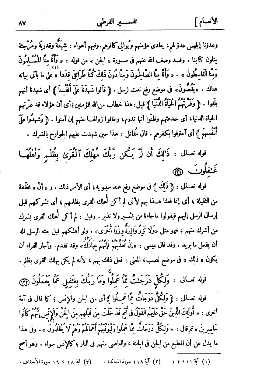 قَوْلُهُ تَعَالَى: (وَلِكُلٍّ دَرَجاتٌ مِمَّا عَمِلُوا) أَيْ مِنَ الْجِنِّ وَالْإِنْسِ، كَمَا قَالَ فِي آيَةٍ أُخْرَى:" أُولئِكَ الَّذِينَ حَقَّ عَلَيْهِمُ الْقَوْلُ فِي أُمَمٍ قَدْ خَلَتْ مِنْ قَبْلِهِمْ مِنَ الْجِنِّ وَالْإِنْسِ إِنَّهُمْ كانُوا خاسِرِينَ" ثُمَّ قَالَ:" وَلِكُلٍّ دَرَجاتٌ مِمَّا عَمِلُوا وَلِيُوَفِّيَهُمْ أَعْمالَهُمْ وَهُمْ لَا يُظْلَمُونَ". وَفِي هَذَا مَا يَدُلُّ عَلَى أَنَّ الْمُطِيعَ مِنَ الْجِنِّ فِي الْجَنَّةِ، وَالْعَاصِيَ مِنْهُمْ فِي النَّارِ، كَالْإِنْسِ سَوَاءً. وَهُوَ أصح