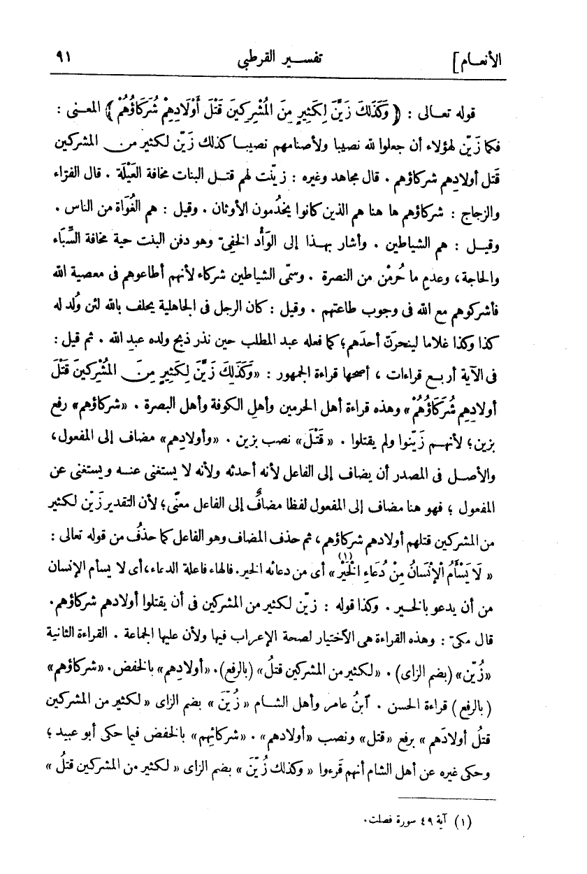 قَوْلُهُ تَعَالَى: (وَكَذلِكَ زَيَّنَ لِكَثِيرٍ مِنَ الْمُشْرِكِينَ قَتْلَ أَوْلادِهِمْ شُرَكاؤُهُمْ) الْمَعْنَى: فَكَمَا زُيِّنَ لِهَؤُلَاءِ أَنْ جَعَلُوا لِلَّهِ نَصِيبًا وَلِأَصْنَامِهِمْ نَصِيبًا كَذَلِكَ زَيَّنَ لِكَثِيرٍ مِنَ الْمُشْرِكِينَ قَتْلَ أَوْلَادِهِمْ شُرَكَاؤُهُمْ. قَالَ مُجَاهِدٌ وَغَيْرُهُ: زَيَّنَتْ لَهُمْ قَتْلَ الْبَنَاتِ مخافة العيلة. قال الفراء والزجاج: شركاؤهم ها هنا هُمُ الَّذِينَ كَانُوا يَخْدُمُونَ الْأَوْثَانَ. وَقِيلَ: هُمُ الْغُوَاةُ مِنَ النَّاسِ. وَقِيلَ: هُمُ الشَّيَاطِينُ. وَأَشَارَ بِهَذَا إِلَى الْوَأْدِ الْخَفِيِّ «١» وَهُوَ دَفْنُ الْبِنْتِ حية مخافة السباء والحاجة، وعدم ما حر من مِنَ النُّصْرَةِ. وَسَمَّى الشَّيَاطِينَ شُرَكَاءَ لِأَنَّهُمْ أَطَاعُوهُمْ فِي مَعْصِيَةِ اللَّهِ فَأَشْرَكُوهُمْ مَعَ اللَّهِ فِي وُجُوبِ طَاعَتِهِمْ. وَقِيلَ: كَانَ الرَّجُلُ فِي الْجَاهِلِيَّةِ يَحْلِفُ بِاللَّهِ لَئِنْ وُلِدَ لَهُ كَذَا وَكَذَا غُلَامًا لَيَنْحَرَنَّ أَحَدَهُمْ، كَمَا فَعَلَهُ عَبْدُ الْمُطَّلِبِ حِينَ نَذَرَ ذَبْحَ وَلَدِهِ عَبْدِ اللَّهِ. ثُمَّ قِيلَ: فِي الْآيَةِ أَرْبَعُ قِرَاءَاتٍ، أَصَحُّهَا قِرَاءَةُ الْجُمْهُورِ:" وَكَذلِكَ زَيَّنَ لِكَثِيرٍ مِنَ الْمُشْرِكِينَ قَتْلَ أَوْلادِهِمْ شُرَكاؤُهُمْ" وَهَذِهِ قِرَاءَةُ أَهْلِ الْحَرَمَيْنِ وَأَهْلِ الْكُوفَةِ وَأَهْلِ الْبَصْرَةِ." شُرَكاؤُهُمْ" رُفِعَ بِ" زُيِّنَ"، لِأَنَّهُمْ زَيَّنُوا وَلَمْ يَقْتُلُوا." قَتْلَ" نُصِبَ بِ" زُيِّنَ" وَ" أَوْلادُهُمْ" مُضَافٌ إِلَى الْمَفْعُولِ، وَالْأَصْلُ فِي الْمَصْدَرِ أَنْ يُضَافَ إِلَى الْفَاعِلِ، لِأَنَّهُ أحدثه ولأنه لا يستعني عَنْهُ وَيُسْتَغْنَى عَنِ الْمَفْعُولِ، فَهُوَ هُنَا مُضَافٌ إِلَى الْمَفْعُولِ لَفْظًا مُضَافٌ إِلَى الْفَاعِلِ مَعْنًى، لِأَنَّ التَّقْدِيرَ زَيَّنَ لِكَثِيرٍ مِنَ الْمُشْرِكِينَ قَتْلَهُمْ أَوْلَادَهُمْ شُرَكَاؤُهُمْ، ثُمَّ حُذِفَ الْمُضَافُ وَهُوَ الْفَاعِلُ كَمَا حُذِفَ مِنْ قَوْلِهِ تَعَالَى:" لَا يَسْأَمُ الْإِنْسانُ مِنْ دُعاءِ الْخَيْرِ «٢» "" أَيْ مِنْ دُعَائِهِ الْخَيْرَ. فَالْهَاءُ فَاعِلَةُ الدُّعَاءِ، أَيْ لَا يَسْأَمُ الْإِنْسَانُ مِنْ أَنْ يَدْعُوَ بِالْخَيْرِ. وَكَذَا قَوْلُهُ: زَيَّنَ لِكَثِيرٍ مِنَ الْمُشْرِكِينَ فِي أَنْ يَقْتُلُوا أَوْلَادَهُمْ شُرَكَاؤُهُمْ. قَالَ مَكِّيٌّ: وَهَذِهِ الْقِرَاءَةُ هِيَ الِاخْتِيَارُ، لِصِحَّةِ الْإِعْرَابِ فِيهَا وَلِأَنَّ عَلَيْهَا الْجَمَاعَةَ. الْقِرَاءَةُ الثَّانِيَةُ" زُيِّنَ" (بِضَمِّ الزَّايِ)." لِكَثِيرٍ مِنَ الْمُشْرِكِينَ قَتْلَ" (بِالرَّفْعِ)." أَوْلادُهُمْ" بِالْخَفْضِ." شُرَكاؤُهُمْ" (بِالرَّفْعِ) قِرَاءَةُ الْحَسَنِ. ابْنُ عَامِرٍ وَأَهْلُ الشَّامِ" زُيِّنَ" بِضَمِّ الزَّايِ" لِكَثِيرٍ مِنَ الْمُشْرِكِينَ قَتْلُ أَوْلَادَهُمْ" بِرَفْعِ" قَتْلُ" وَنَصْبِ" أَوْلَادِهِمْ"." شُرَكَائِهِمْ" بِالْخَفْضِ فِيمَا حَكَى أَبُو عُبَيْدٍ، وَحَكَى غَيْرُهُ عَنْ أَهْلِ الشَّامِ أَنَّهُمْ قَرَءُوا" وَكَذَلِكَ زُيِّنَ" بِضَمِّ الزَّايِ" لكثير من المشركين قتل"