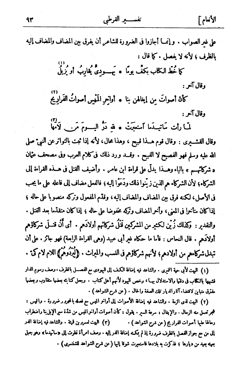 وَقَالَ الْقُشَيْرِيُّ: وَقَالَ قَوْمٌ هَذَا قَبِيحٌ، وَهَذَا مُحَالٌ، لِأَنَّهُ إِذَا ثَبَتَتِ (الْقِرَاءَةُ «٤» بِالتَّوَاتُرِ عَنِ النَّبِيِّ صَلَّى اللَّهُ عَلَيْهِ وَسَلَّمَ فَهُوَ الْفَصِيحُ لَا الْقَبِيحُ. وَقَدْ وَرَدَ ذَلِكَ فِي كَلَامِ الْعَرَبِ وَفِي مُصْحَفِ عُثْمَانَ" شُرَكَائِهِمْ" بِالْيَاءِ وَهَذَا يَدُلُّ عَلَى قِرَاءَةِ ابْنِ عَامِرٍ. وَأُضِيفَ الْقَتْلُ فِي هَذِهِ الْقِرَاءَةِ إِلَى الشُّرَكَاءِ، لِأَنَّ الشُّرَكَاءَ هُمُ الَّذِينَ زَيَّنُوا ذَلِكَ وَدَعَوْا إِلَيْهِ، فَالْفِعْلُ مُضَافٌ إِلَى فَاعِلِهِ عَلَى مَا يَجِبُ فِي الْأَصْلِ، لَكِنَّهُ فَرَّقَ بَيْنَ الْمُضَافِ وَالْمُضَافِ إِلَيْهِ، وَقَدَّمَ الْمَفْعُولَ وَتَرَكَهُ مَنْصُوبًا عَلَى حَالِهِ، إِذْ كَانَ مُتَأَخِّرًا فِي الْمَعْنَى، وَأَخَّرَ الْمُضَافَ وَتَرَكَهُ مَخْفُوضًا عَلَى حَالِهِ، إِذْ كَانَ مُتَقَدِّمًا بَعْدَ الْقَتْلِ. وَالتَّقْدِيرُ: وَكَذَلِكَ زُيِّنَ لِكَثِيرٍ مِنَ الْمُشْرِكِينَ قَتْلُ شُرَكَائِهِمْ أَوْلَادَهُمْ. أَيْ أَنْ قَتَلَ شُرَكَاؤُهُمْ أَوْلَادَهُمْ. قَالَ النَّحَّاسُ: فَأَمَّا مَا حَكَاهُ غَيْرُ أَبِي عُبَيْدٍ (وَهِيَ الْقِرَاءَةُ الرَّابِعَةُ) فَهُوَ جَائِزٌ. عَلَى أَنْ تُبَدِّلَ شُرَكَاءَهُمْ مِنْ أَوْلَادِهِمْ، لِأَنَّهُمْ شُرَكَاؤُهُمْ في النسب والميراث. (ليردوهم)