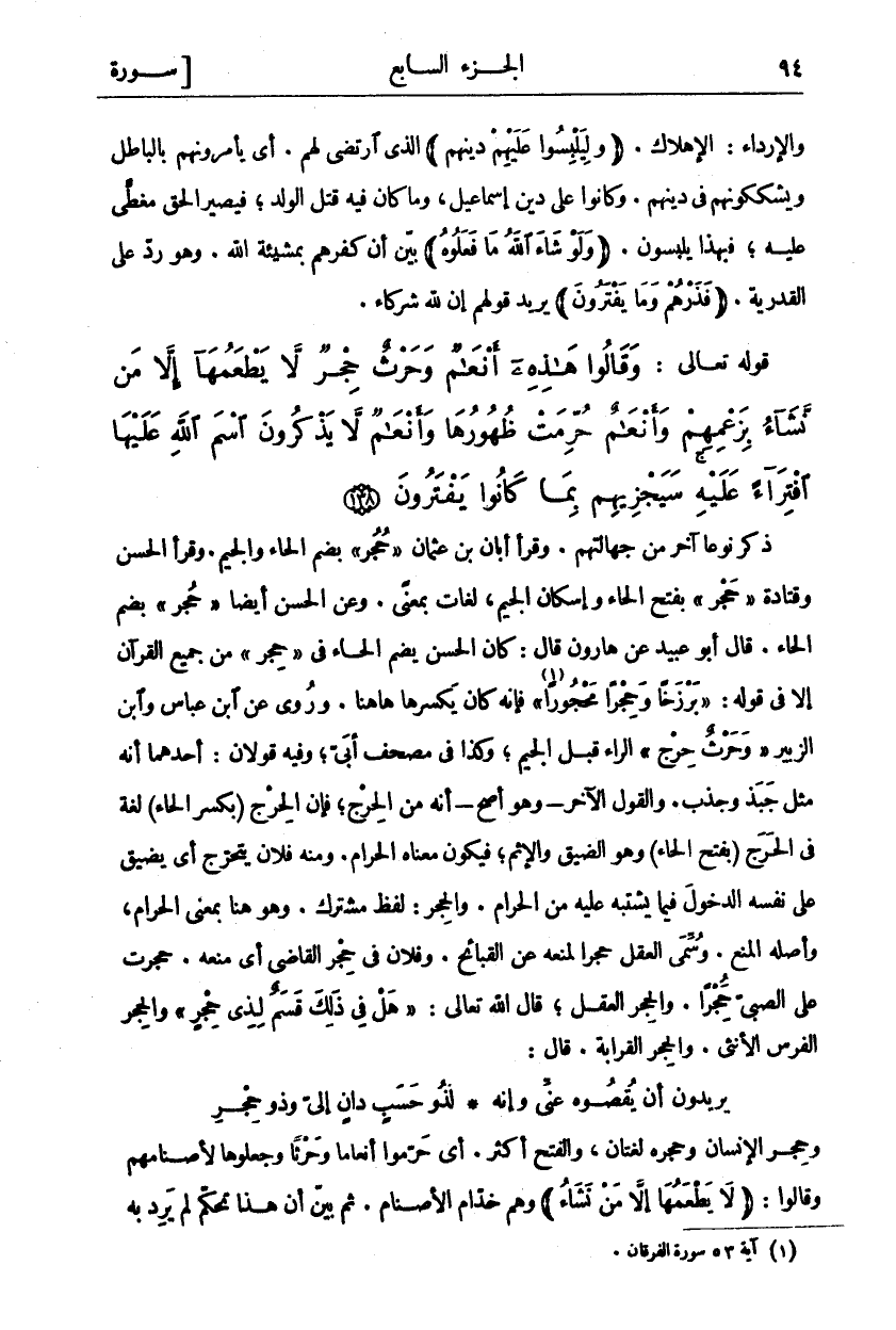 ذَكَرَ (تَعَالَى) نوعا آخر جَهَالَتِهِمْ. وَقَرَأَ أَبَانُ بْنُ عُثْمَانَ" حُجُرٌ" بِضَمِّ الْحَاءِ وَالْجِيمِ. وَقَرَأَ الْحَسَنُ وَقَتَادَةُ" حَجْرٌ" بِفَتْحِ الْحَاءِ وَإِسْكَانِ الْجِيمِ، لُغَتَانِ بِمَعْنًى. وَعَنِ الْحَسَنِ أَيْضًا" حُجْرٌ" بِضَمِّ الْحَاءِ. قَالَ أَبُو عُبَيْدٍ عَنْ هَارُونَ قَالَ: كَانَ الْحَسَنُ يَضُمُّ الْحَاءَ فِي" حِجْرٍ" فِي جَمِيعِ الْقُرْآنِ إِلَّا فِي قَوْلِهِ:" بَرْزَخاً وَحِجْراً مَحْجُوراً «٢» " فَإِنَّهُ كَانَ يَكْسِرُهَا ها هنا. وَرُوِيَ عَنْ ابْنِ عَبَّاسٍ وَابْنِ الزُّبَيْرِ" وَحَرْثٌ حِرْجٌ" الرَّاءُ قَبْلَ الْجِيمِ، وَكَذَا فِي مُصْحَفِ أُبَيٍّ، وَفِيهِ قَوْلَانِ: أَحَدُهُمَا أَنَّهُ مِثْلُ جَبَذَ وَجَذَبَ. وَالْقَوْلُ الْآخَرُ- وَهُوَ أَصَحُّ- أَنَّهُ مِنَ الْحِرْجِ، فَإِنَّ الْحِرْجَ (بِكَسْرِ الْحَاءِ) لُغَةٌ فِي الْحَرَجِ (بِفَتْحِ الْحَاءِ) وَهُوَ الضِّيقُ وَالْإِثْمُ، فَيَكُونُ معناه الحرام. ومنفلان يَتَحَرَّجُ أَيْ يُضَيِّقُ عَلَى نَفْسِهِ الدُّخُولَ فِيمَا يَشْتَبِهُ عَلَيْهِ مِنَ الْحَرَامِ. وَالْحِجْرُ: لَفْظٌ مُشْتَرَكٌ. وَهُوَ هُنَا بِمَعْنَى الْحَرَامِ، وَأَصْلُهُ الْمَنْعُ. وَسُمِّيَ الْعَقْلُ حِجْرًا لِمَنْعِهِ عَنِ الْقَبَائِحِ. وَفُلَانٌ فِي حِجْرِ الْقَاضِي أَيْ مَنْعِهِ. حَجَرْتُ عَلَى الصَّبِيِّ حَجْرًا. وَالْحِجْرُ الْعَقْلُ، قَالَ اللَّهُ تَعَالَى:" هَلْ فِي ذلِكَ قَسَمٌ لِذِي حِجْرٍ «٣» " وَالْحِجْرِ الْفَرَسُ الْأُنْثَى. وَالْحِجْرُ الْقَرَابَةُ. قَالَ: