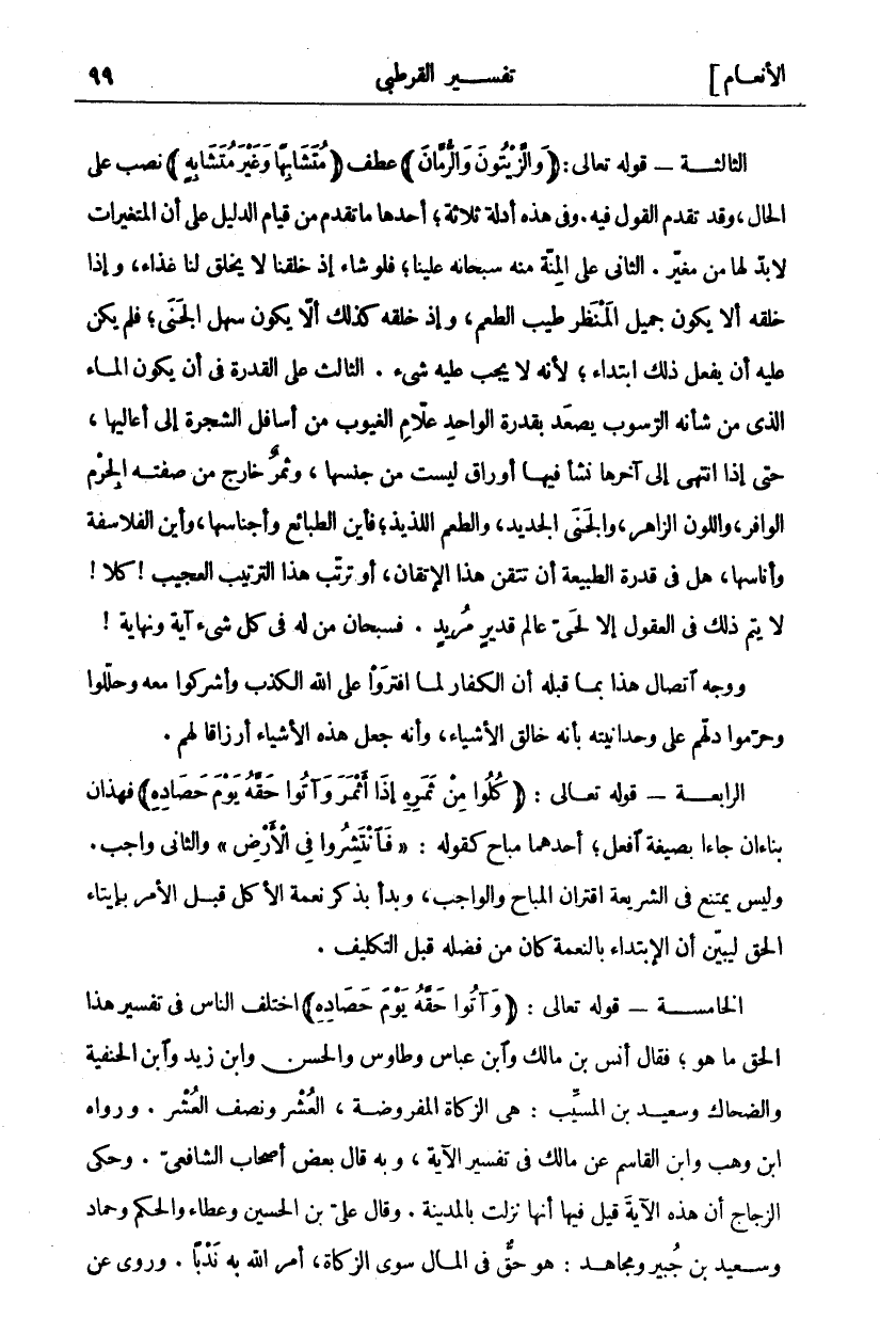 الثَّالِثَةُ- قَوْلُهُ تَعَالَى: (وَالزَّيْتُونَ وَالرُّمَّانَ) عَطْفٌ عَلَيْهِ (مُتَشابِهاً وَغَيْرَ مُتَشابِهٍ) نصب على الحال، وَفِي هَذِهِ أَدِلَّةٌ ثَلَاثَةٌ، أَحَدُهَا مَا تَقَدَّمَ مِنْ قِيَامِ الدَّلِيلِ عَلَى أَنَّ الْمُتَغَيِّرَاتِ لَا بدلها مِنْ مُغَيِّرٍ. الثَّانِي عَلَى الْمِنَّةِ مِنْهُ سُبْحَانَهُ عَلَيْنَا، فَلَوْ شَاءَ إِذْ خَلَقَنَا أَلَّا يَخْلُقَ لنا غذاء، إذ خَلَقَهُ أَلَّا يَكُونَ جَمِيلَ الْمَنْظَرِ طَيِّبَ الطَّعْمِ، وَإِذْ خَلَقَهُ كَذَلِكَ أَلَّا يَكُونَ سَهْلَ الْجَنْيِ، فَلَمْ يَكُنْ عَلَيْهِ أَنْ يَفْعَلَ ذَلِكَ ابْتِدَاءً، لأنه لا يجب عليه شي. الثَّالِثُ عَلَى الْقُدْرَةِ فِي أَنْ يَكُونَ الْمَاءُ الَّذِي مِنْ شَأْنِهِ الرُّسُوبُ يَصْعَدُ بِقُدْرَةِ اللَّهِ الْوَاحِدِ عَلَّامِ الْغُيُوبِ مِنْ أَسَافِلِ الشَّجَرَةِ إِلَى أَعَالِيهَا، حَتَّى إِذَا انْتَهَى إِلَى آخِرِهَا نَشَأَ فِيهَا أَوْرَاقٌ لَيْسَتْ مِنْ جِنْسِهَا، وَثَمَرٌ خَارِجٌ مِنْ صِفَتِهِ الْجُرْمُ الْوَافِرُ، وَاللَّوْنُ الزَّاهِرُ، وَالْجَنْيُ الْجَدِيدُ، وَالطَّعْمُ اللَّذِيذُ، فَأَيْنَ الطَّبَائِعُ وَأَجْنَاسُهَا، وَأَيْنَ الْفَلَاسِفَةُ وَأُنَاسُهَا، هَلْ فِي قُدْرَةِ الطَّبِيعَةِ أَنْ تُتْقِنَ هَذَا الْإِتْقَانَ، أَوْ تُرَتِّبَ هَذَا التَّرْتِيبَ الْعَجِيبَ! كَلَّا! لَا يَتِمُّ ذَلِكَ فِي الْعُقُولِ إِلَّا لِحَيٍّ عَالِمٍ قَدِيرٍ مُرِيدٍ. فَسُبْحَانُ مَنْ له في كل شي آيَةٌ وَنِهَايَةٌ! وَوَجْهُ اتِّصَالِ هَذَا بِمَا قَبْلَهُ أَنَّ الْكُفَّارَ لَمَّا افْتَرَوْا عَلَى اللَّهِ الْكَذِبَ وَأَشْرَكُوا مَعَهُ وَحَلَّلُوا وَحَرَّمُوا دَلَّهُمْ عَلَى وَحْدَانِيَّتِهِ بِأَنَّهُ خَالِقُ الْأَشْيَاءِ، وَأَنَّهُ جَعَلَ هَذِهِ الْأَشْيَاءَ أَرْزَاقًا لَهُمْ. الرَّابِعَةُ- قَوْلُهُ تَعَالَى: (كُلُوا مِنْ ثَمَرِهِ إِذا أَثْمَرَ وَآتُوا حَقَّهُ يَوْمَ حَصادِهِ) فهذان بناء ان جاءا بصيغة أفعل، أحدهما مباح كقول:" فَانْتَشِرُوا فِي الْأَرْضِ «١» " وَالثَّانِي وَاجِبٌ. وَلَيْسَ يَمْتَنِعُ فِي الشَّرِيعَةِ اقْتِرَانُ الْمُبَاحِ وَالْوَاجِبِ، وَبَدَأَ بِذِكْرِ نِعْمَةِ الْأَكْلِ قَبْلَ الْأَمْرِ بِإِيتَاءِ الْحَقِّ لِيُبَيِّنَ أَنَّ الِابْتِدَاءَ بِالنِّعْمَةِ كَانَ مِنْ فَضْلِهِ قَبْلَ التَّكْلِيفِ. الْخَامِسَةُ- قَوْلُهُ تَعَالَى: (وَآتُوا حَقَّهُ يَوْمَ حَصادِهِ) اخْتَلَفَ النَّاسُ فِي تَفْسِيرِ هَذَا الْحَقِّ، مَا هُوَ، فَقَالَ أَنَسُ بْنُ مَالِكٍ وَابْنُ عَبَّاسٍ وَطَاوُسٌ وَالْحَسَنُ وَابْنُ زَيْدٍ وَابْنُ الْحَنَفِيَّةِ وَالضَّحَّاكُ وَسَعِيدُ بْنُ الْمُسَيِّبِ: هِيَ الزَّكَاةُ الْمَفْرُوضَةُ، الْعُشْرُ وَنِصْفُ الْعُشْرِ. وَرَوَاهُ ابْنُ وَهْبٍ وَابْنُ الْقَاسِمِ عَنْ مَالِكٍ فِي تَفْسِيرِ الْآيَةِ، وَبِهِ قَالَ بَعْضُ أَصْحَابِ الشَّافِعِيِّ. وَحَكَى الزَّجَّاجُ أَنَّ هَذِهِ الْآيَةَ قِيلَ فِيهَا إِنَّهَا نَزَلَتْ بِالْمَدِينَةِ. وَقَالَ عَلِيُّ بْنُ الْحُسَيْنِ وَعَطَاءٌ وَالْحَكَمُ وَحَمَّادٌ وَسَعِيدُ بْنُ جُبَيْرٍ وَمُجَاهِدٌ: هُوَ حَقٌّ فِي المال سوى «٢» الزكاة، الله به ندبا. وروى عن
