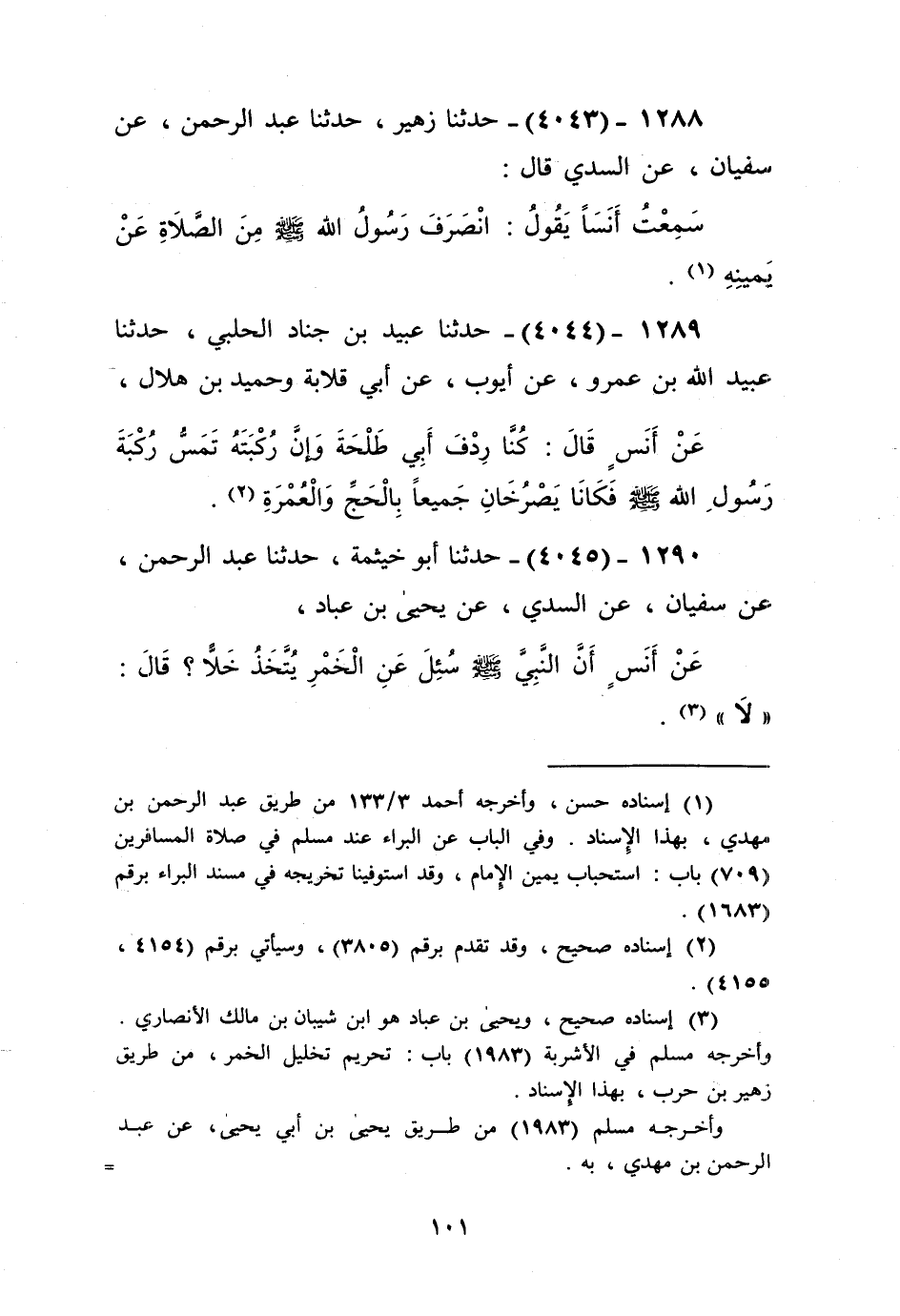 4043 - حَدَّثَنَا زُهَيْرٌ، حَدَّثَنَا عَبْدُ الرَّحْمَنِ، عَنْ سُفْيَانَ، عَنِ السُّدِّيِّ قَالَ: سَمِعْتُ أَنَسًا يَقُولُ: «§انْصَرَفَ رَسُولُ اللَّهِ صَلَّى اللهُ عَلَيْهِ وَسَلَّمَ مِنَ الصَّلَاةِ عَنْ يَمِينِهِ» Kإسناده حسن